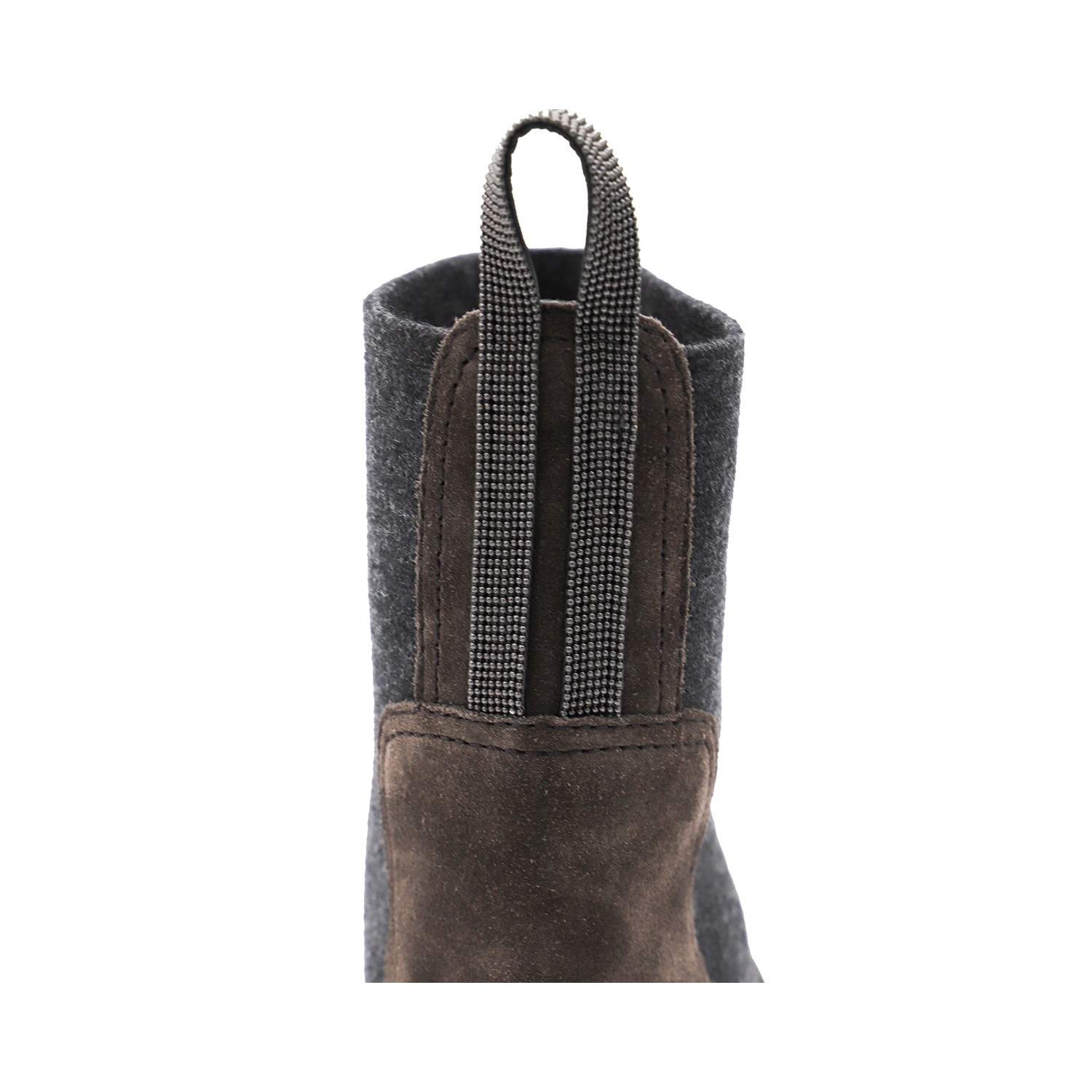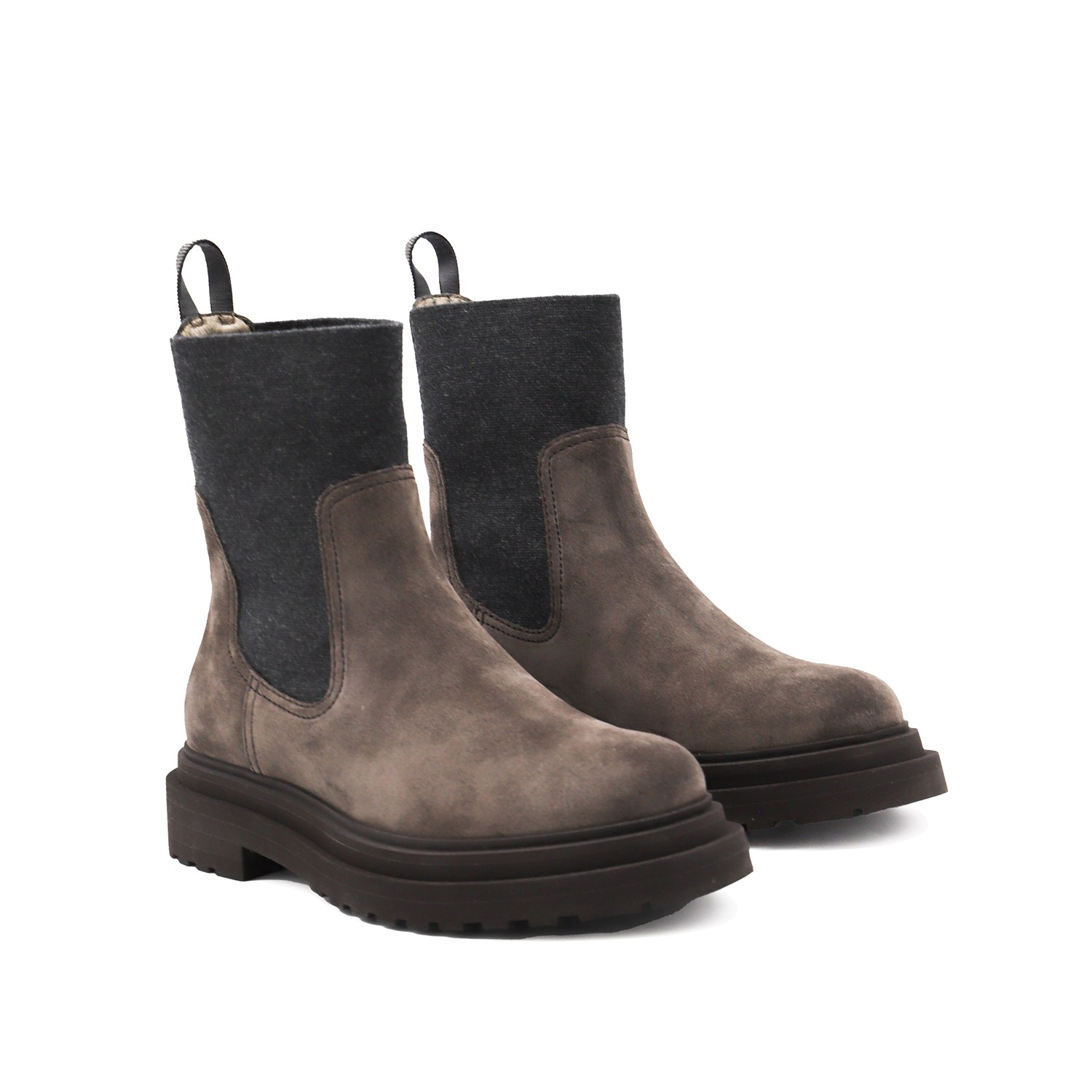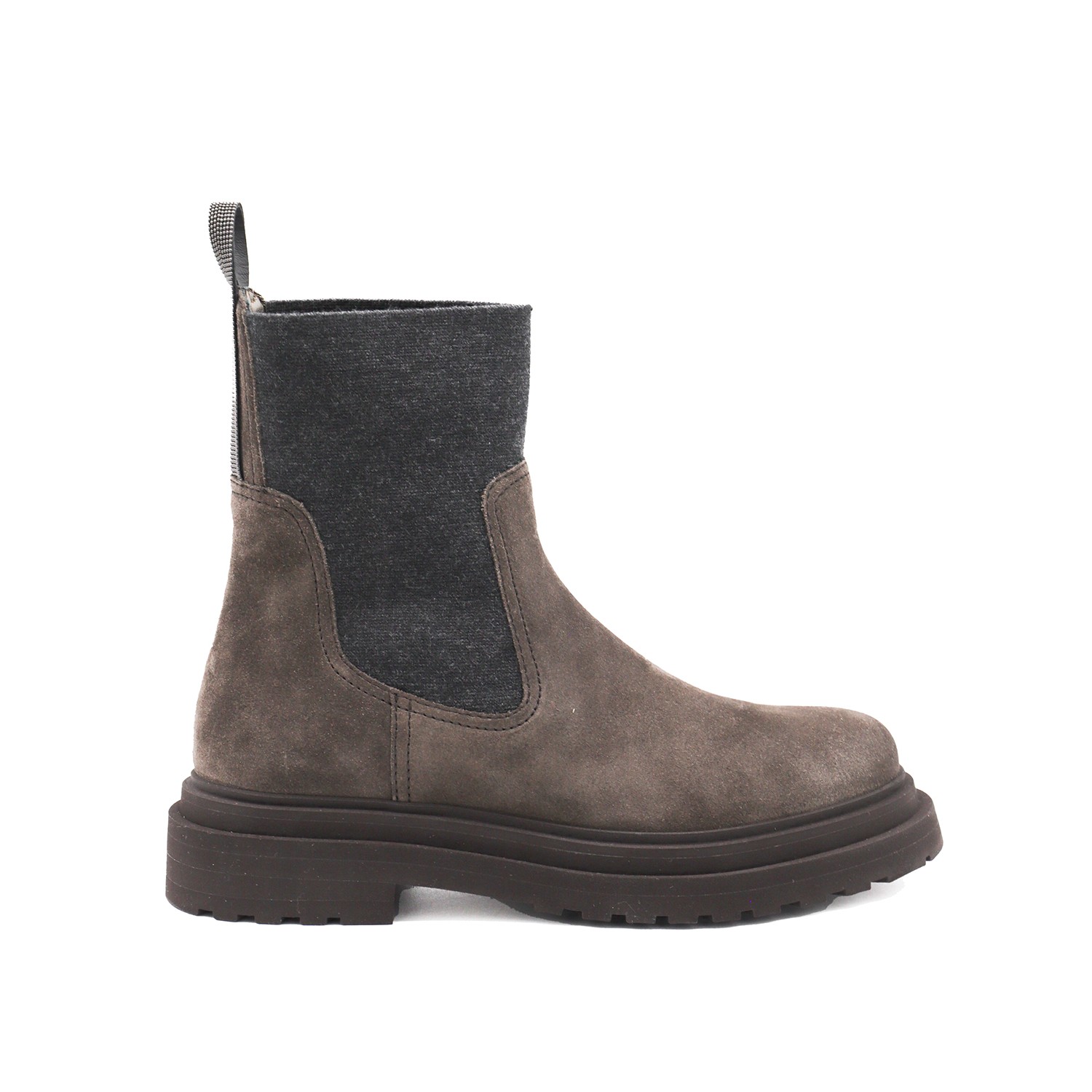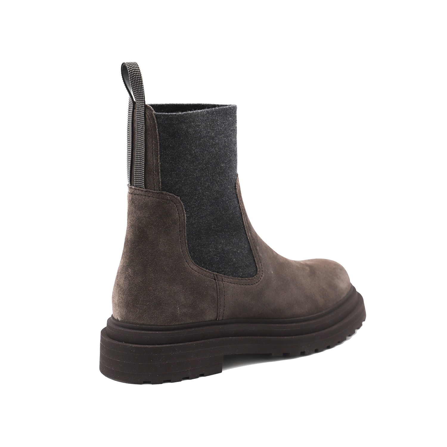 Brown leather boots from Brunello Cucinelli featuring round toe, leather sole, elasticated insert and heel tab.