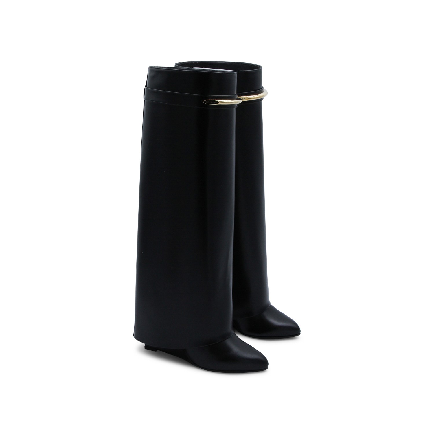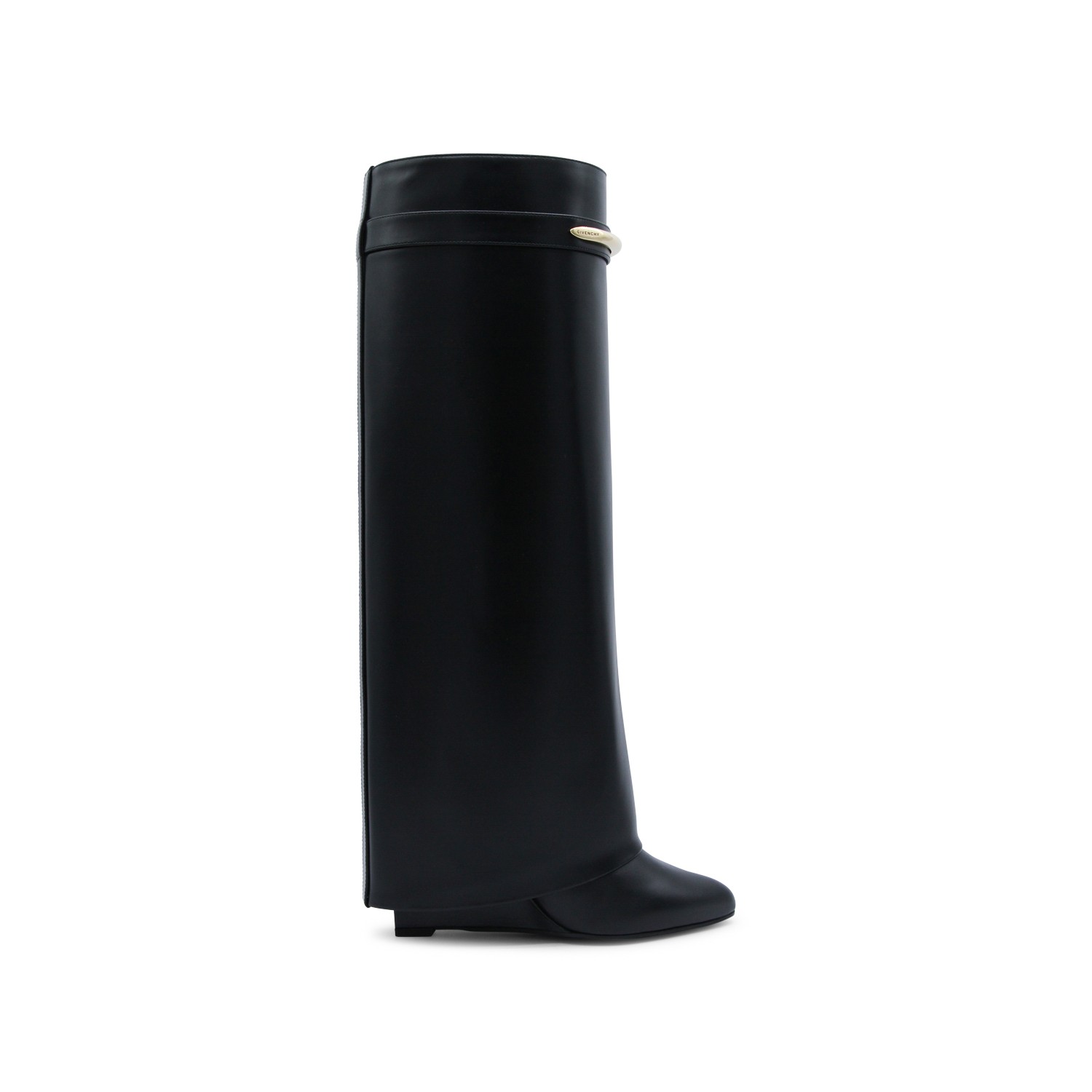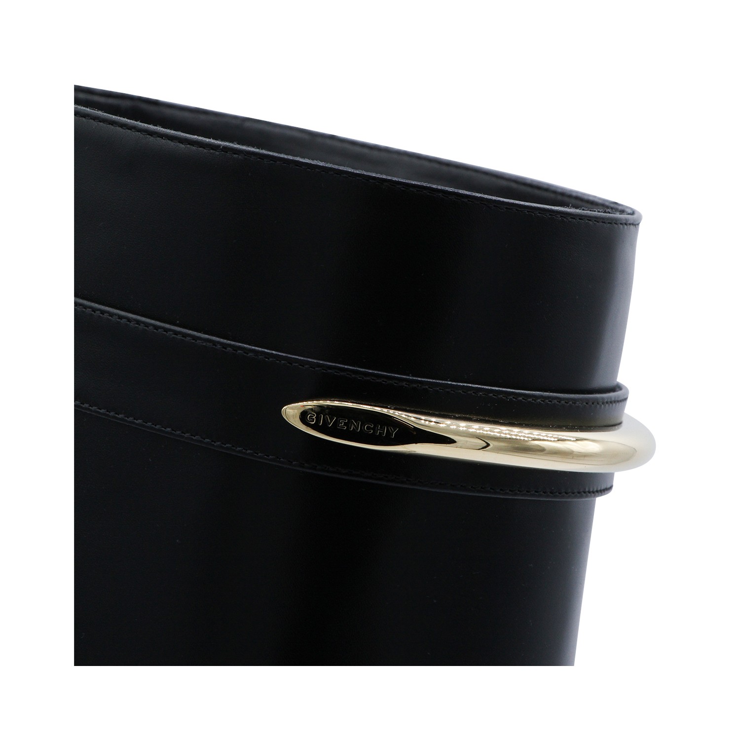 Black leather boots from Givenchy featuring round toe, knee length and gold tone hardware.