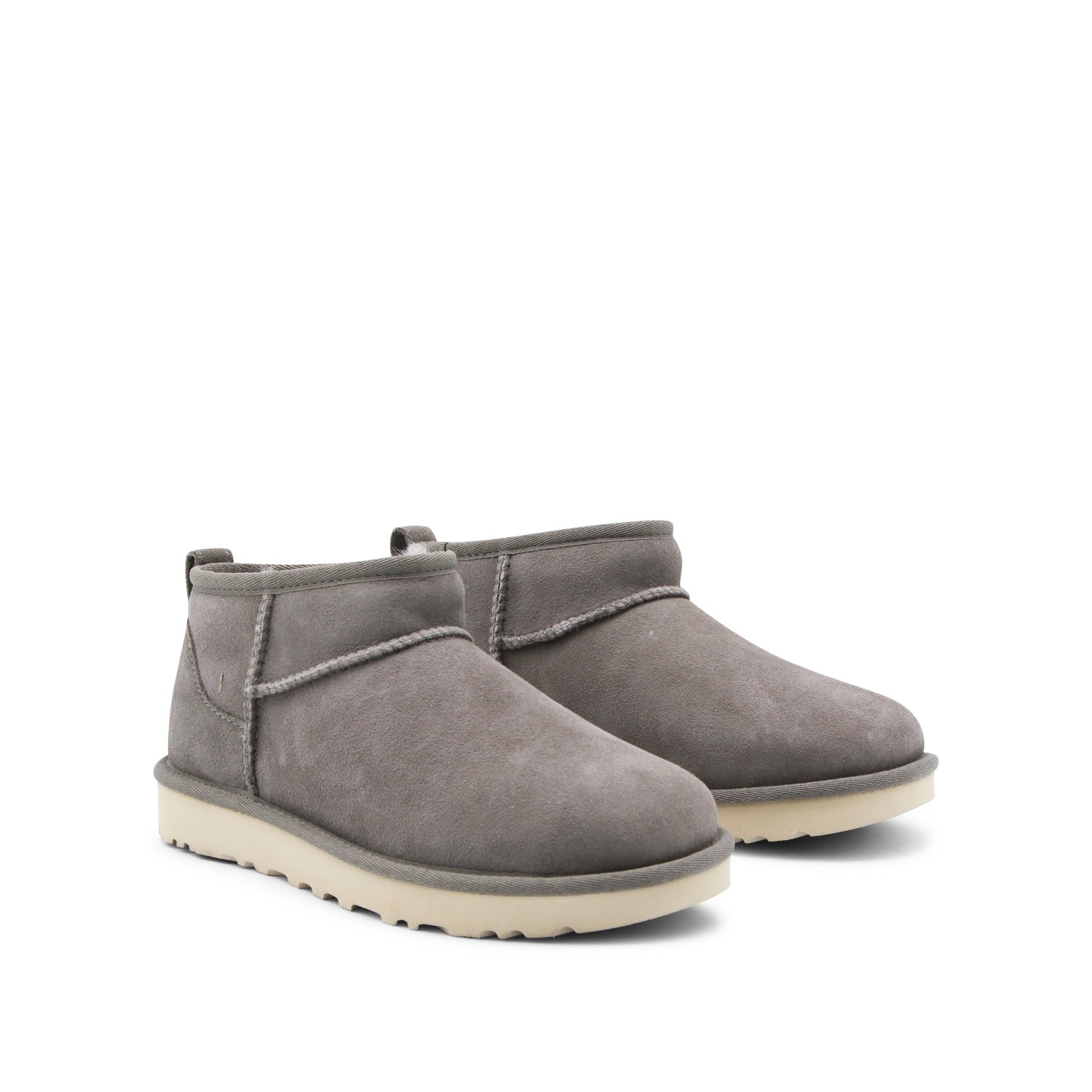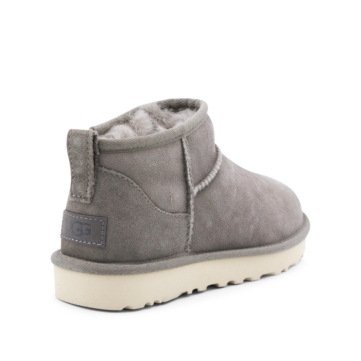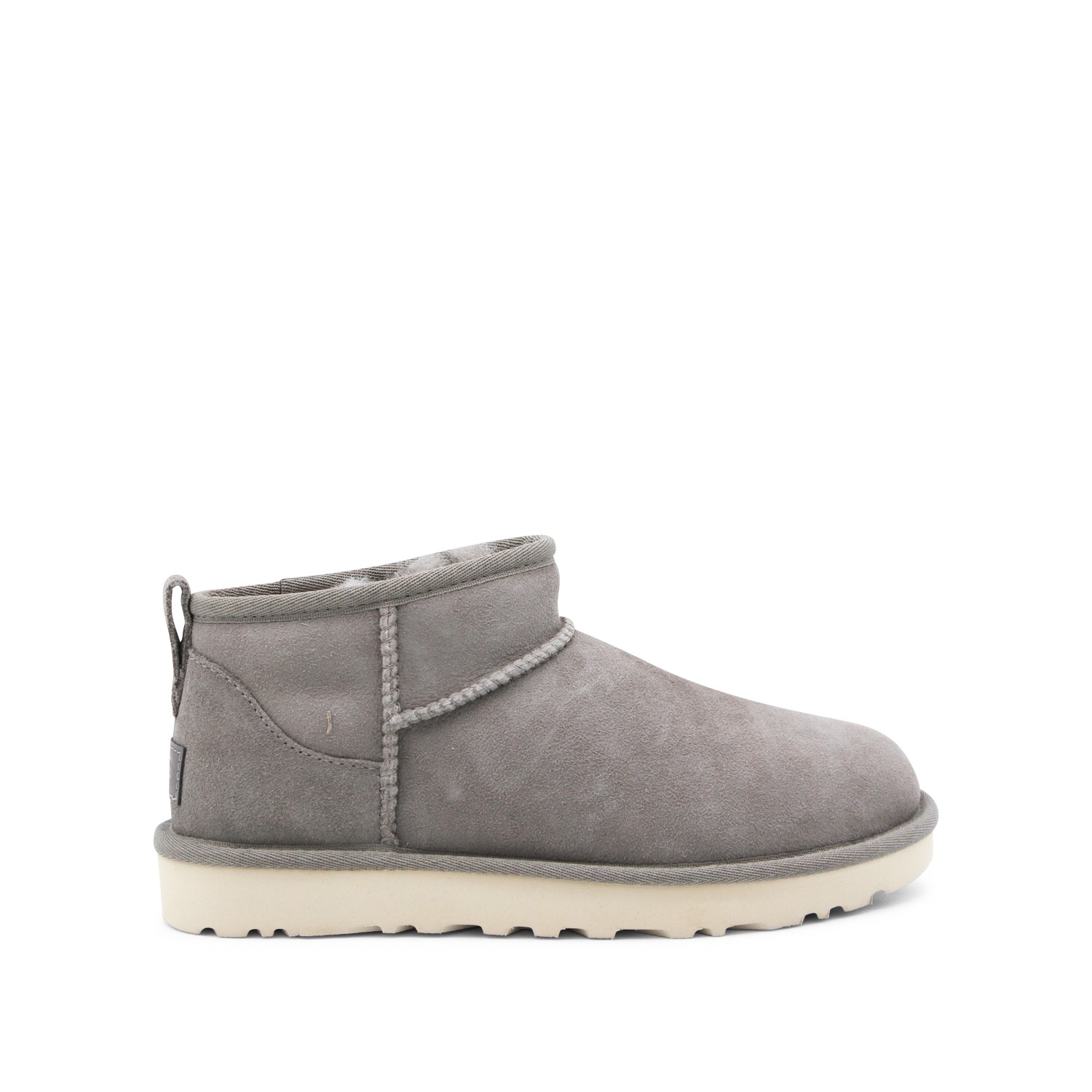 Grey ultra mini boots from Ugg featuring round toe, leather sole, back logo and inside hair.