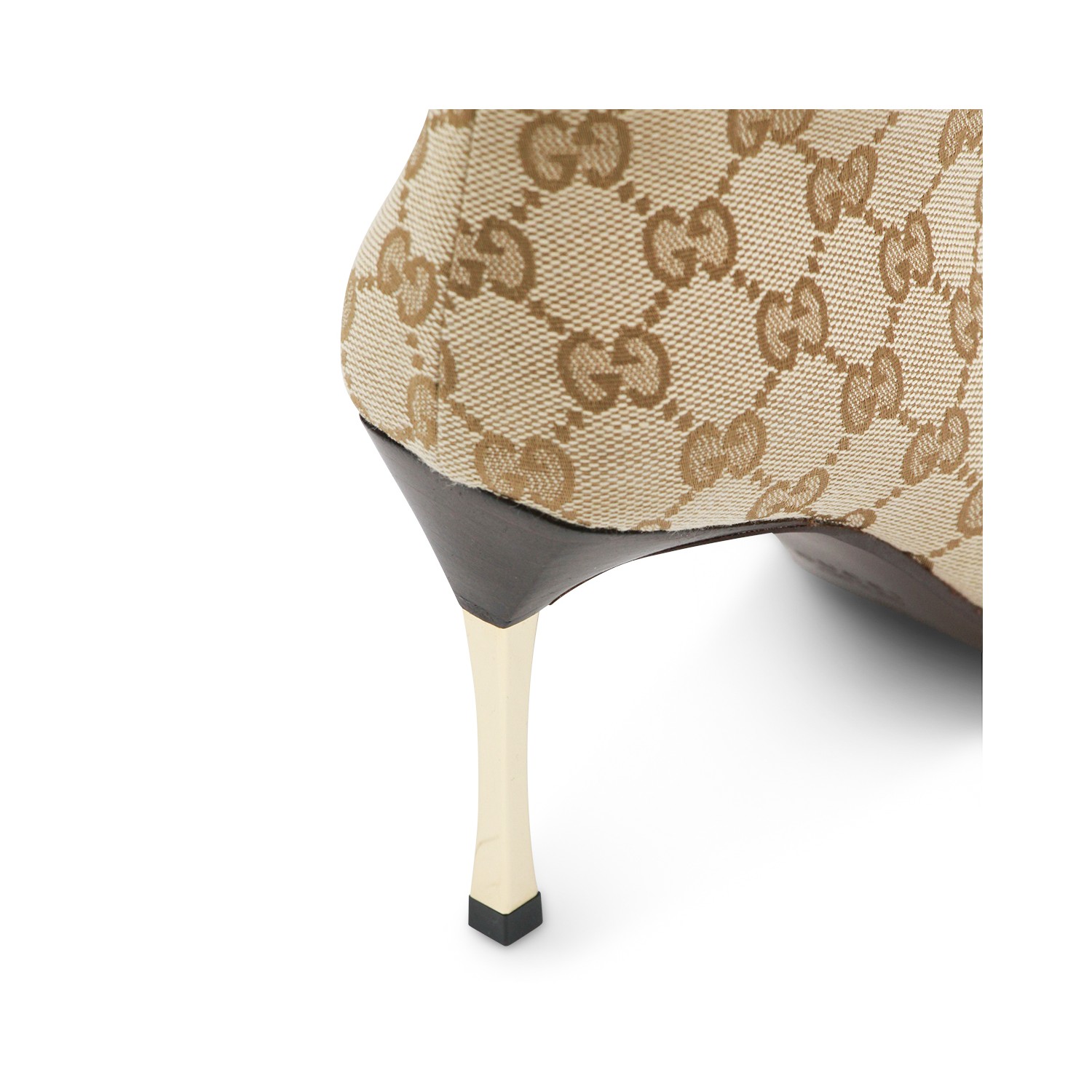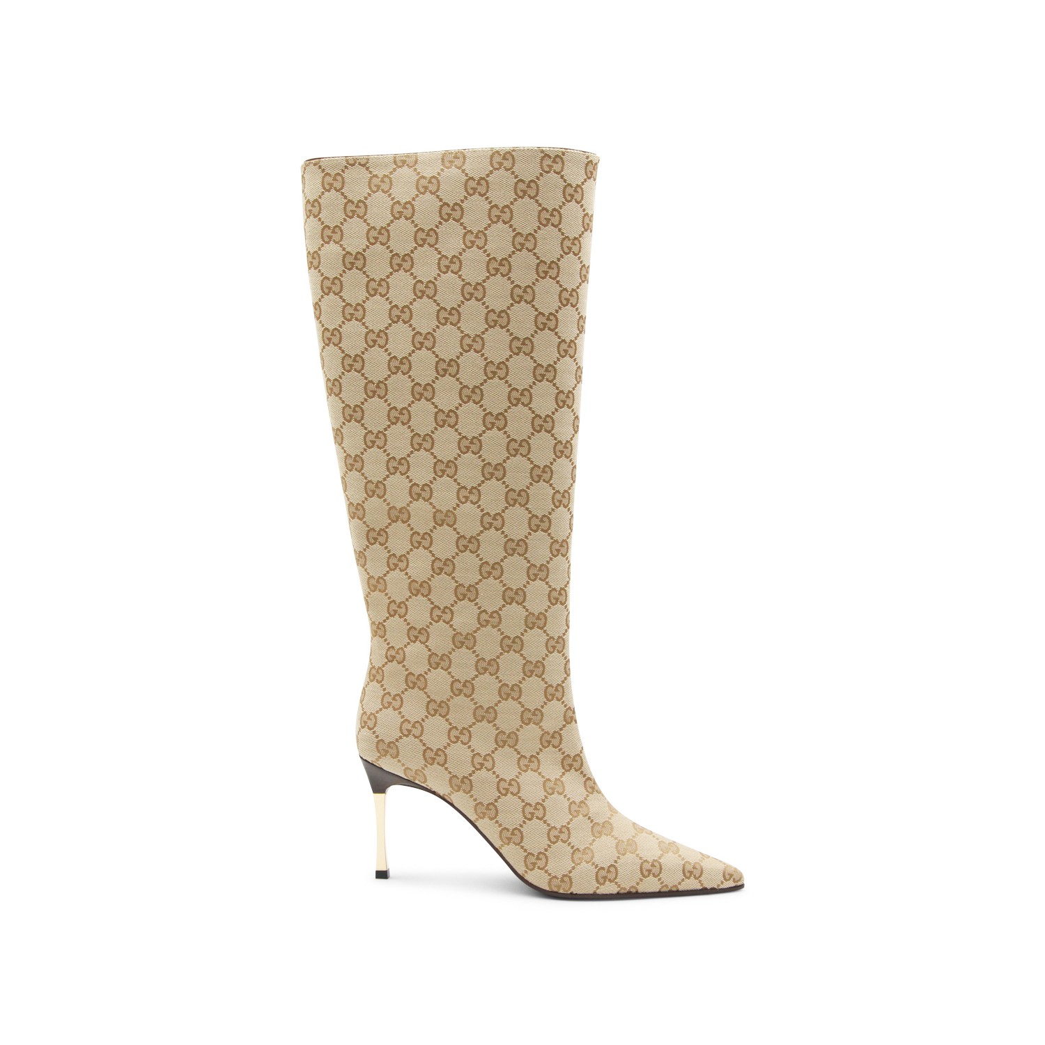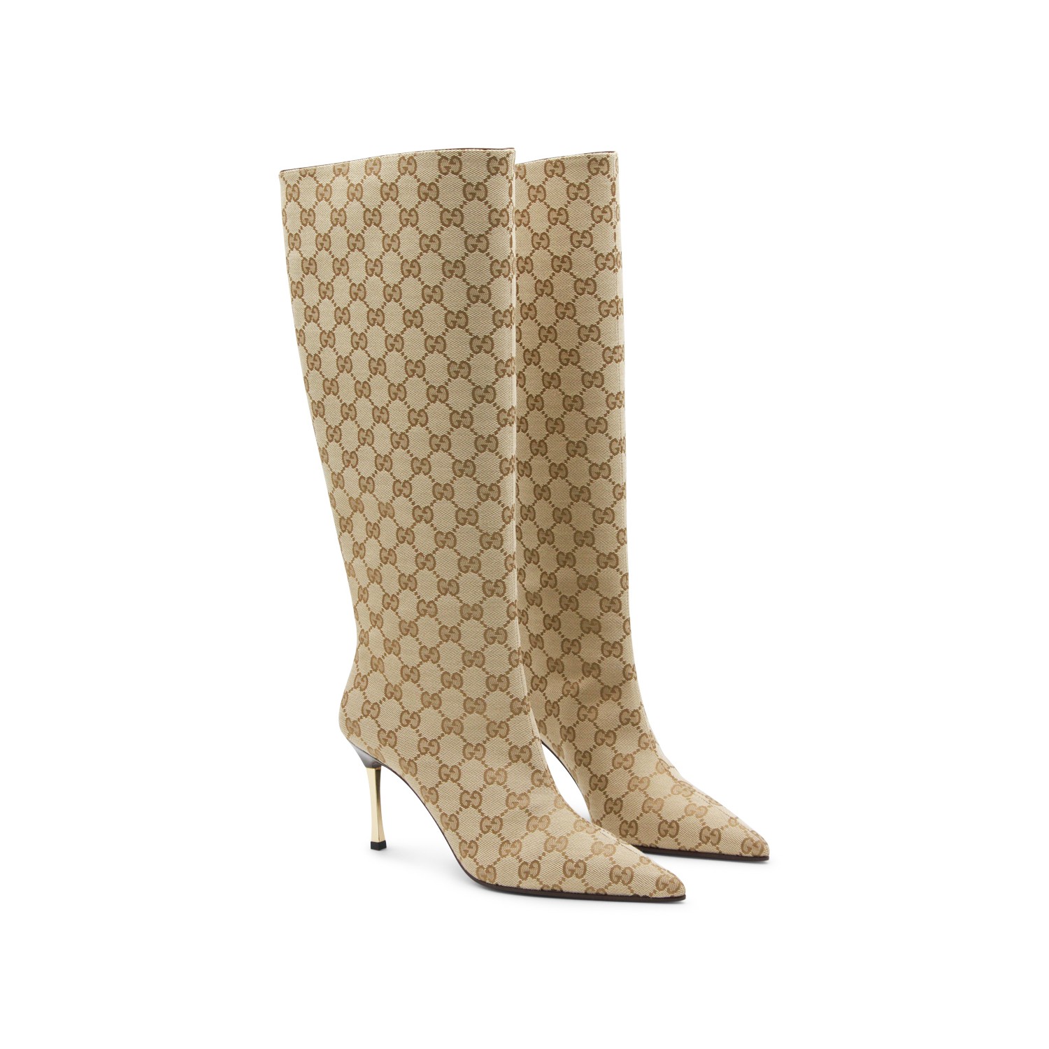 Beige leather boots from Gucci featuring pointed toe, all-over GG texture, slip-on, stiletto heel and brown leather sole.