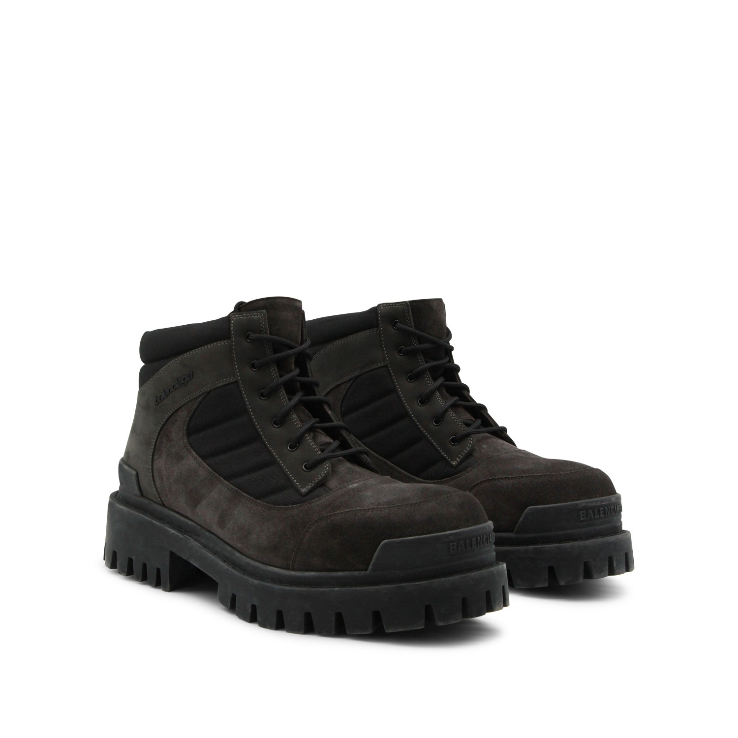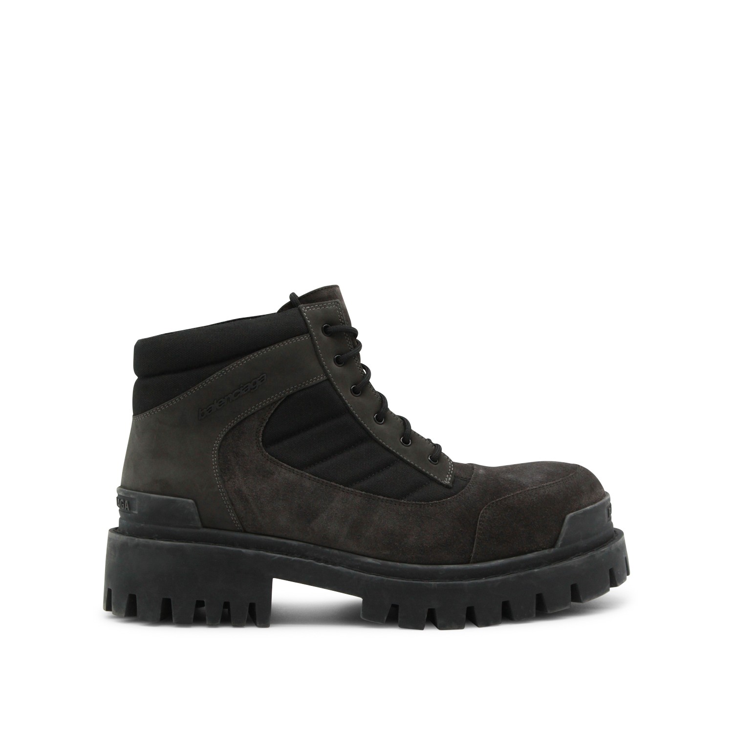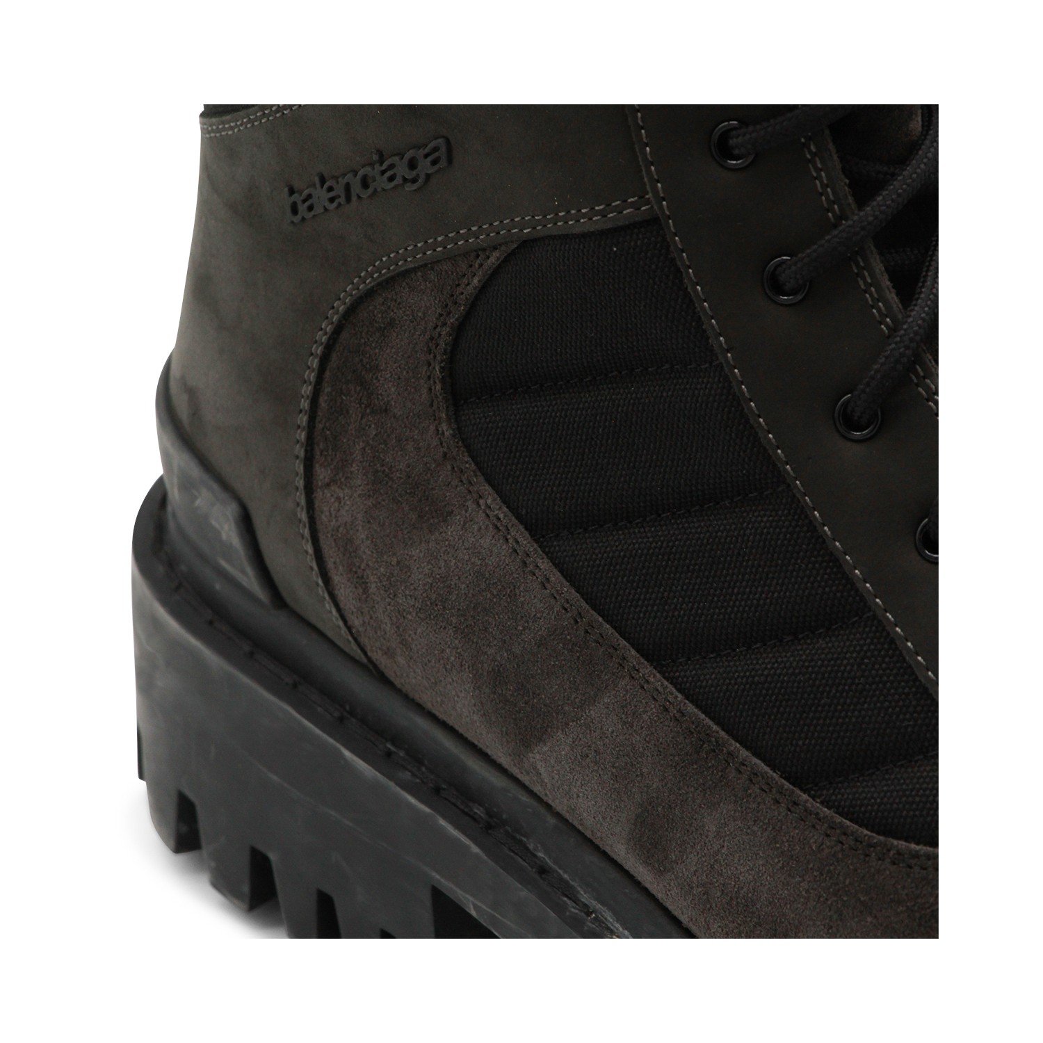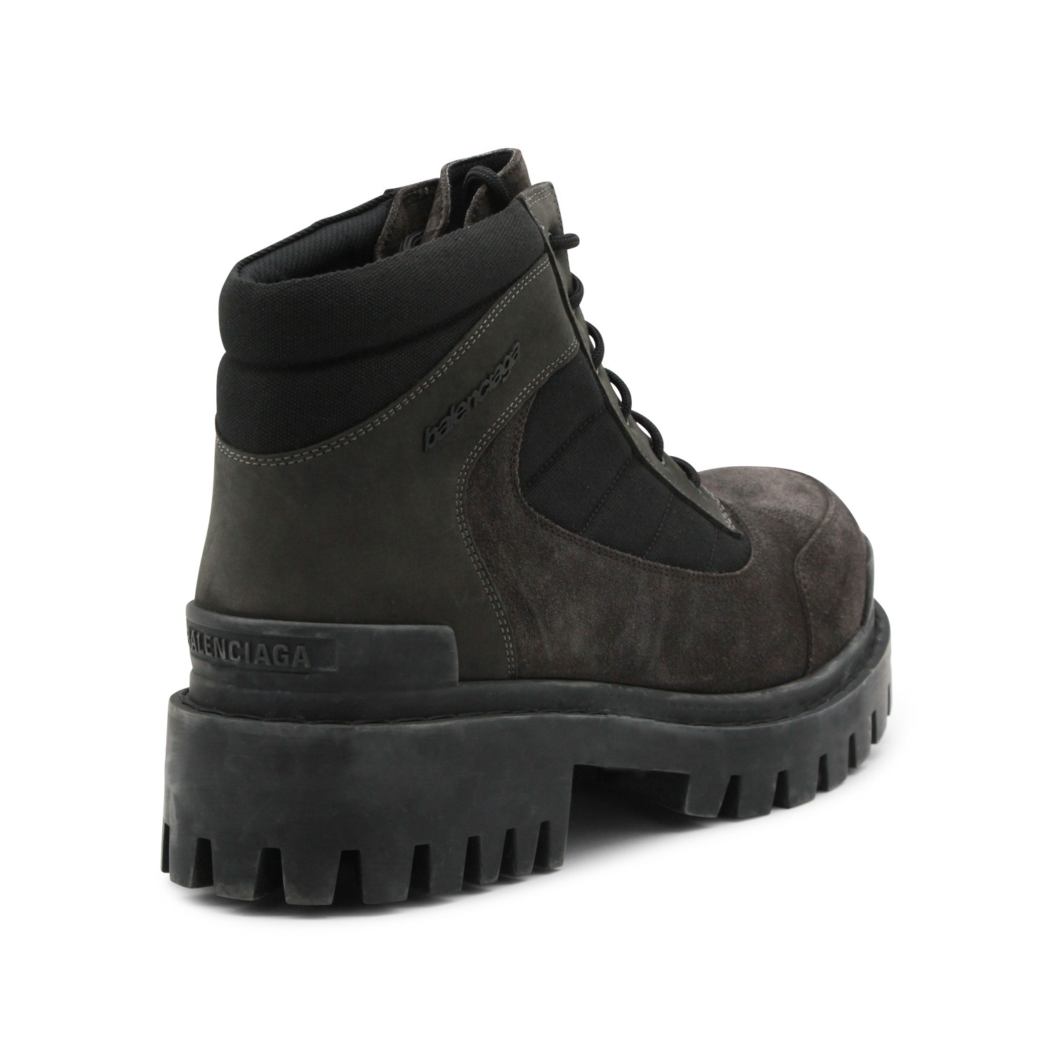 Black leather boots from Balenciaga featuring round toe, laces fastening, worn effect, visible stitching, Balenciaga logo and rubber sole.