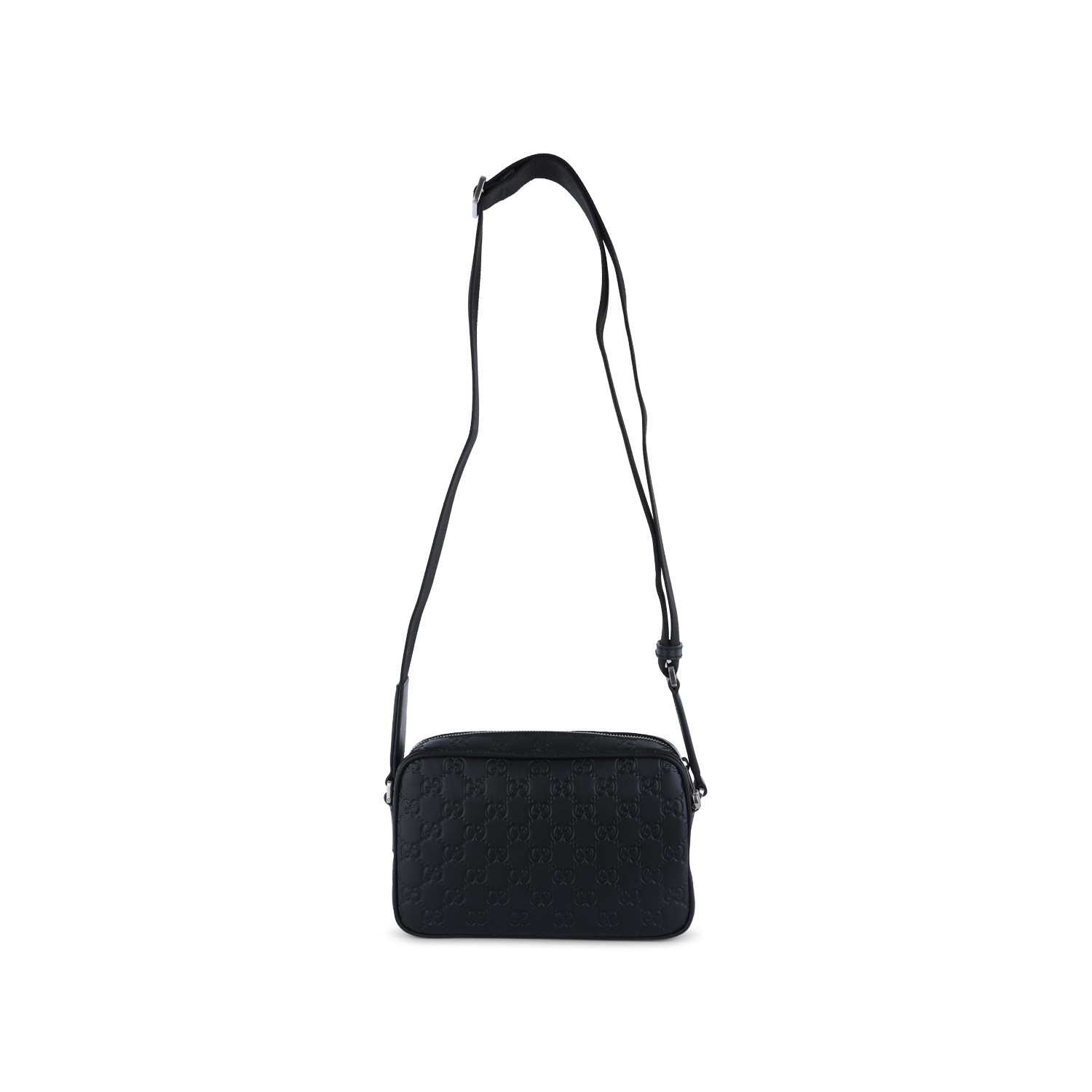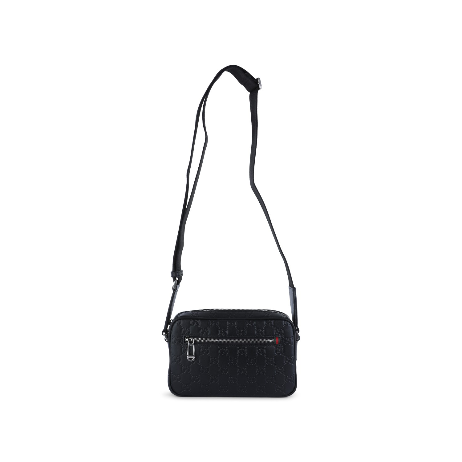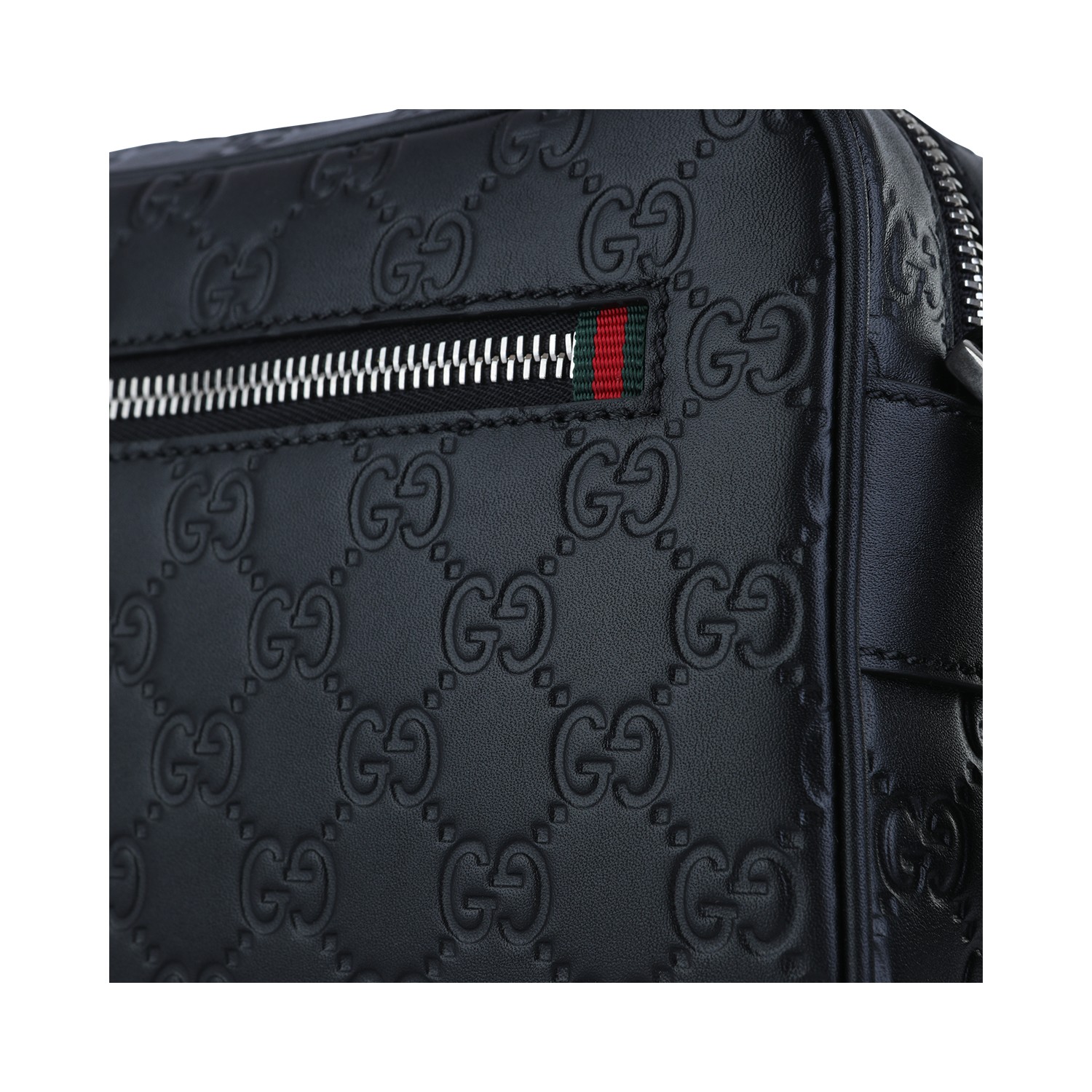 Black leather crossbody bag from Gucci featuring adjustable strap, main compartment, zip fastening, lateral pocket, monogram and silver tone hardware.