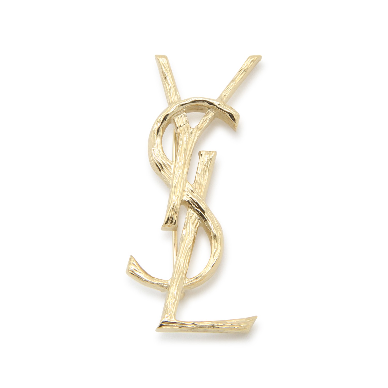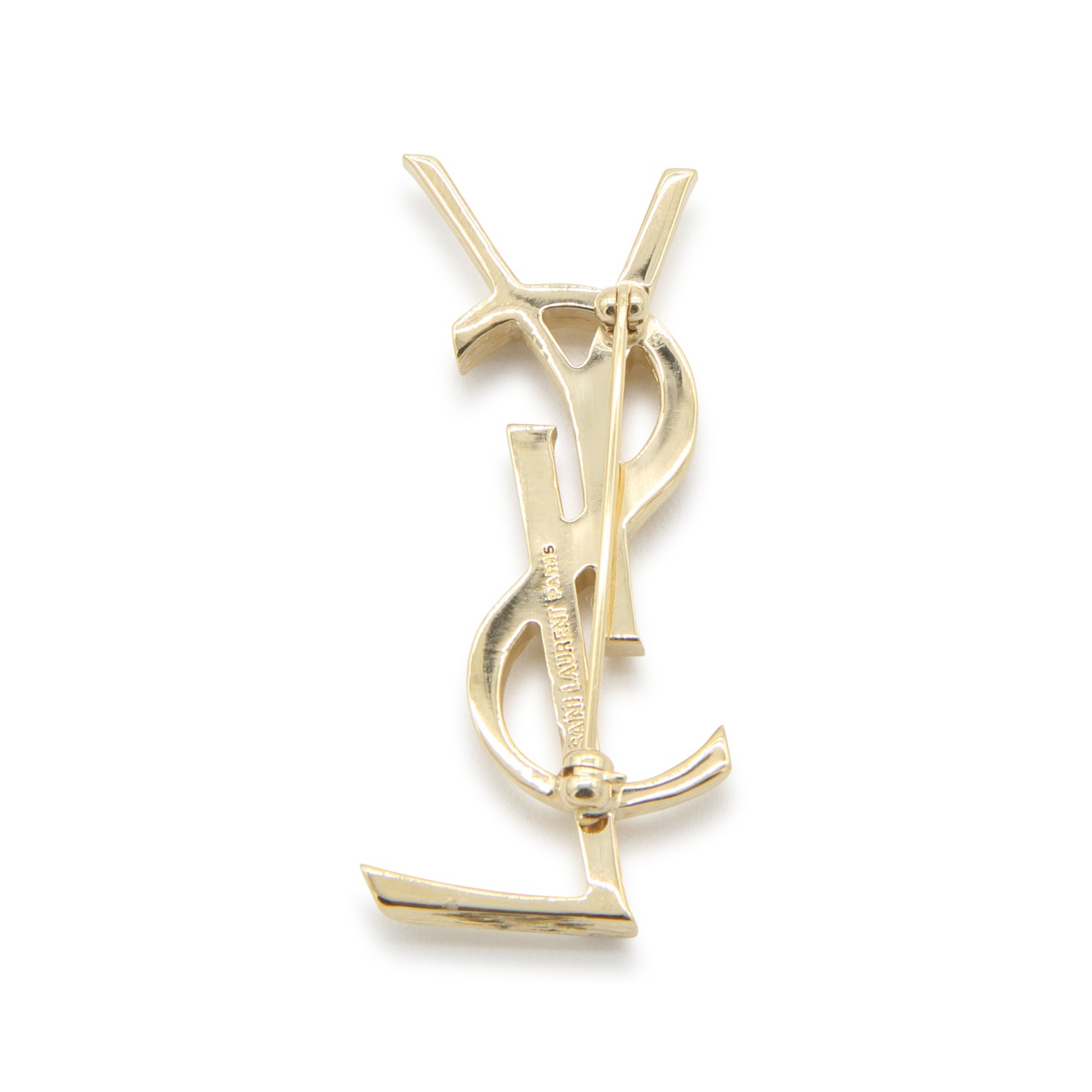 Gold metal brooch from Saint Laurent featuring logo shape and back fastening.