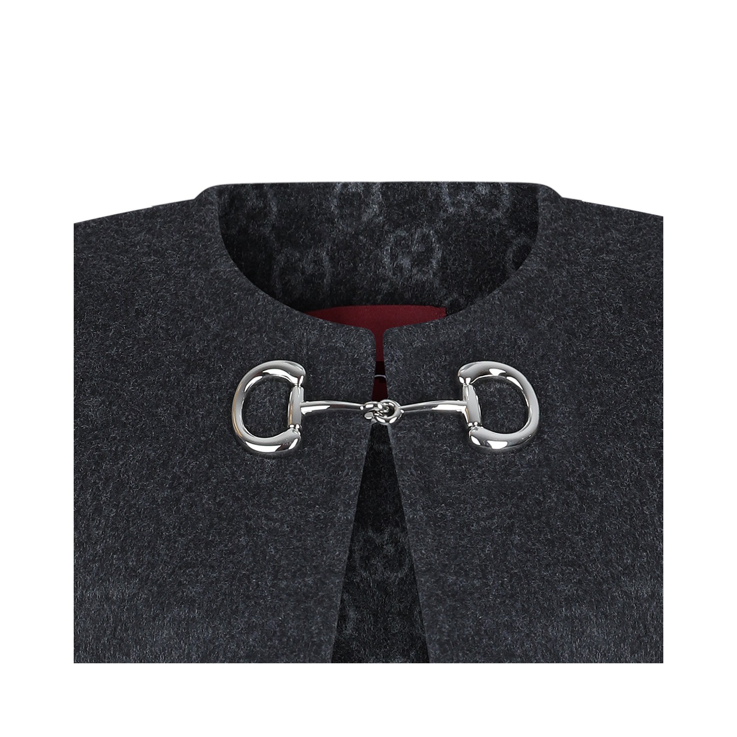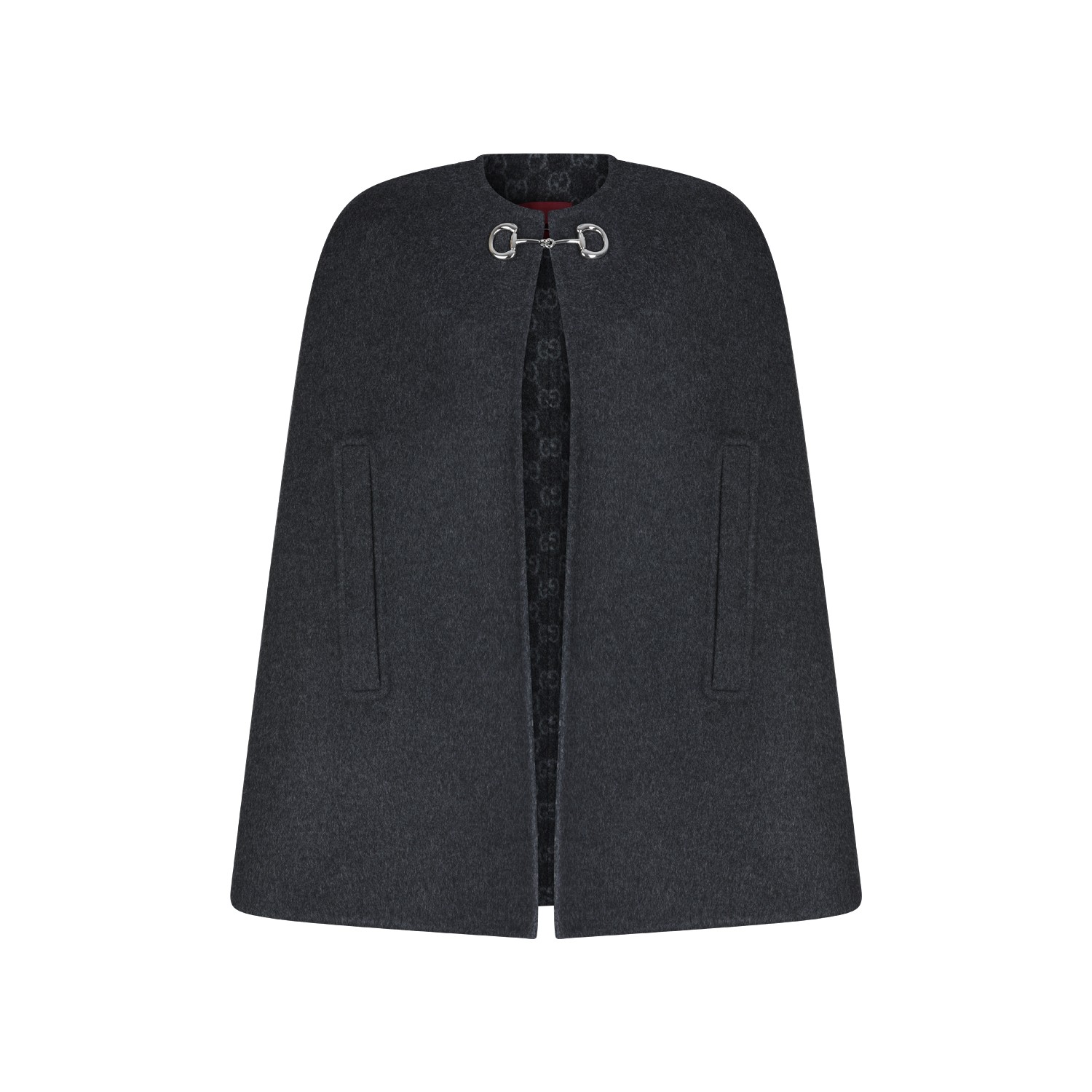 Grey wool cape from Gucci featuring round neck, cheswt welted pockets, silver tone metal details and mid length.