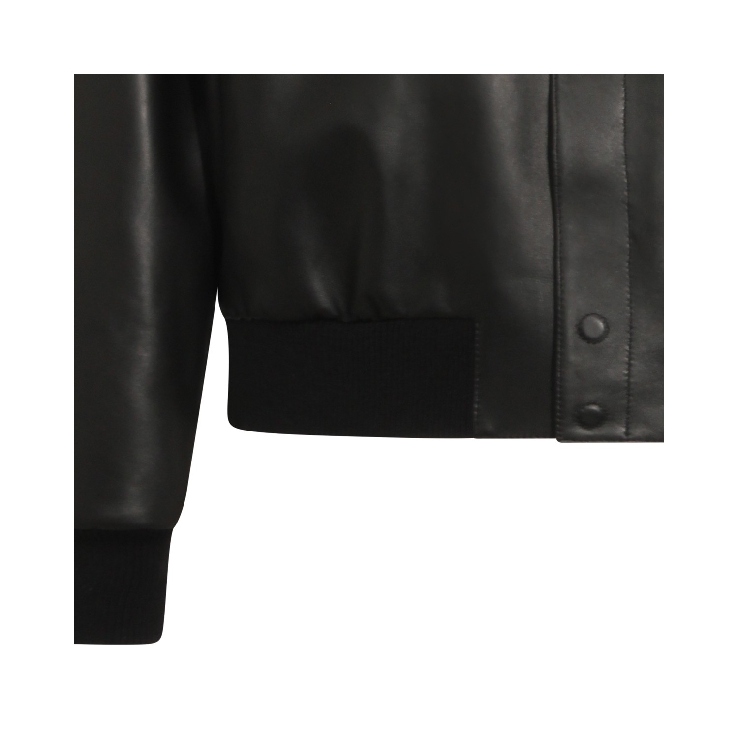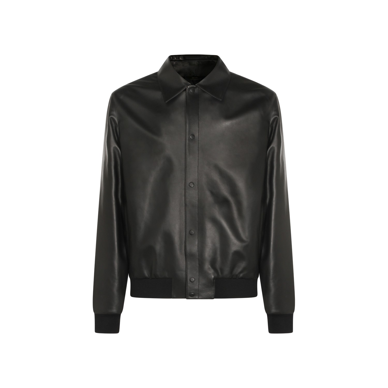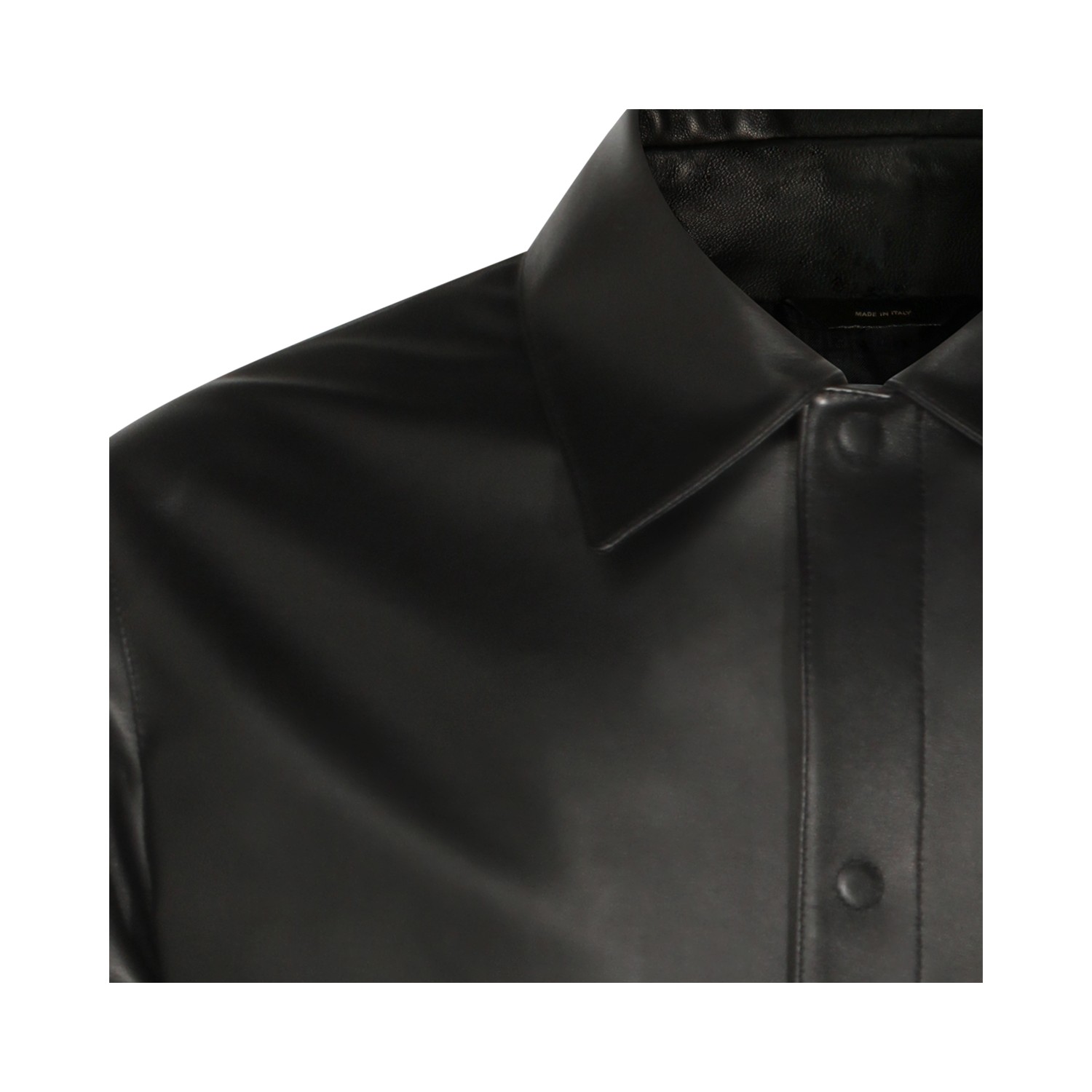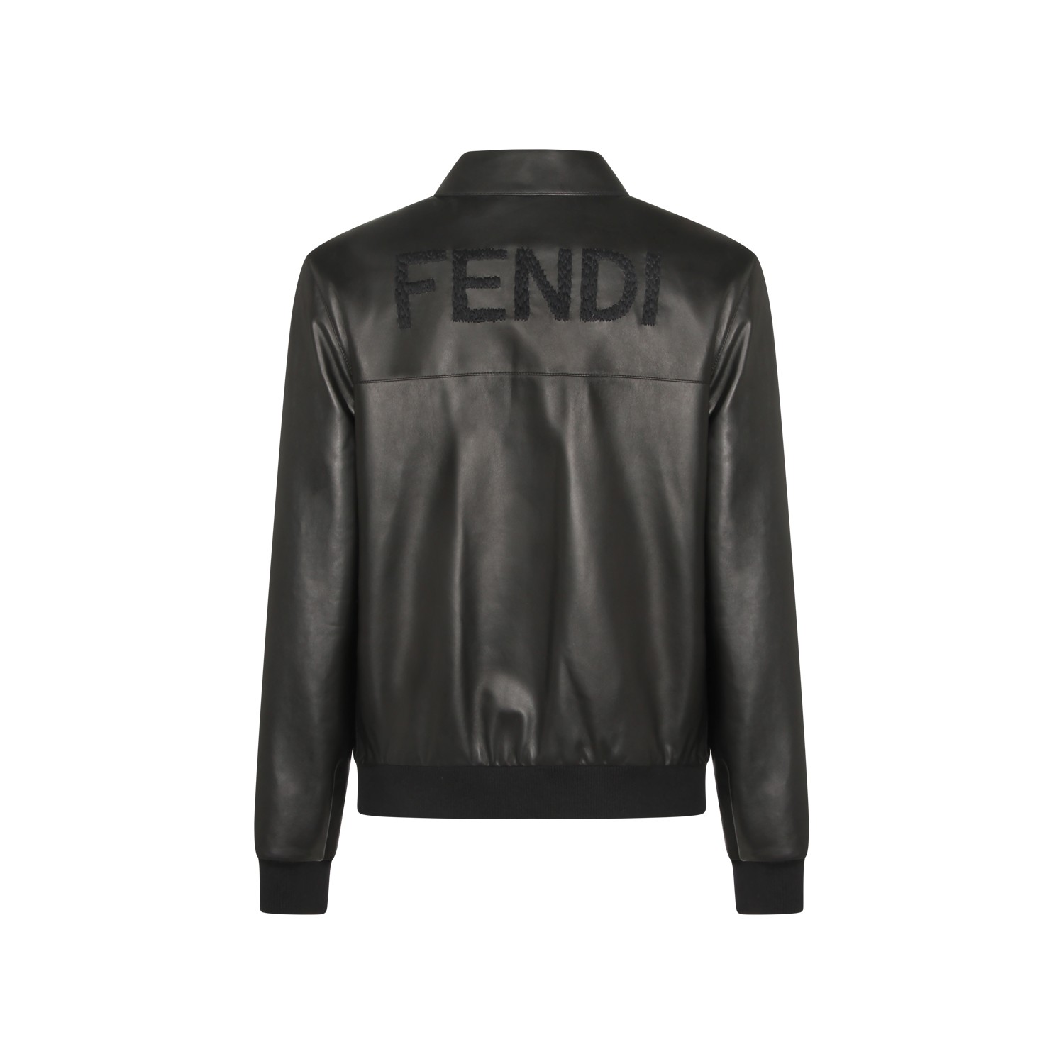 Black leather jacket from Fendi featuring shirt colalr, buttons fastening, long sleeves, back logo and regular vestibility.