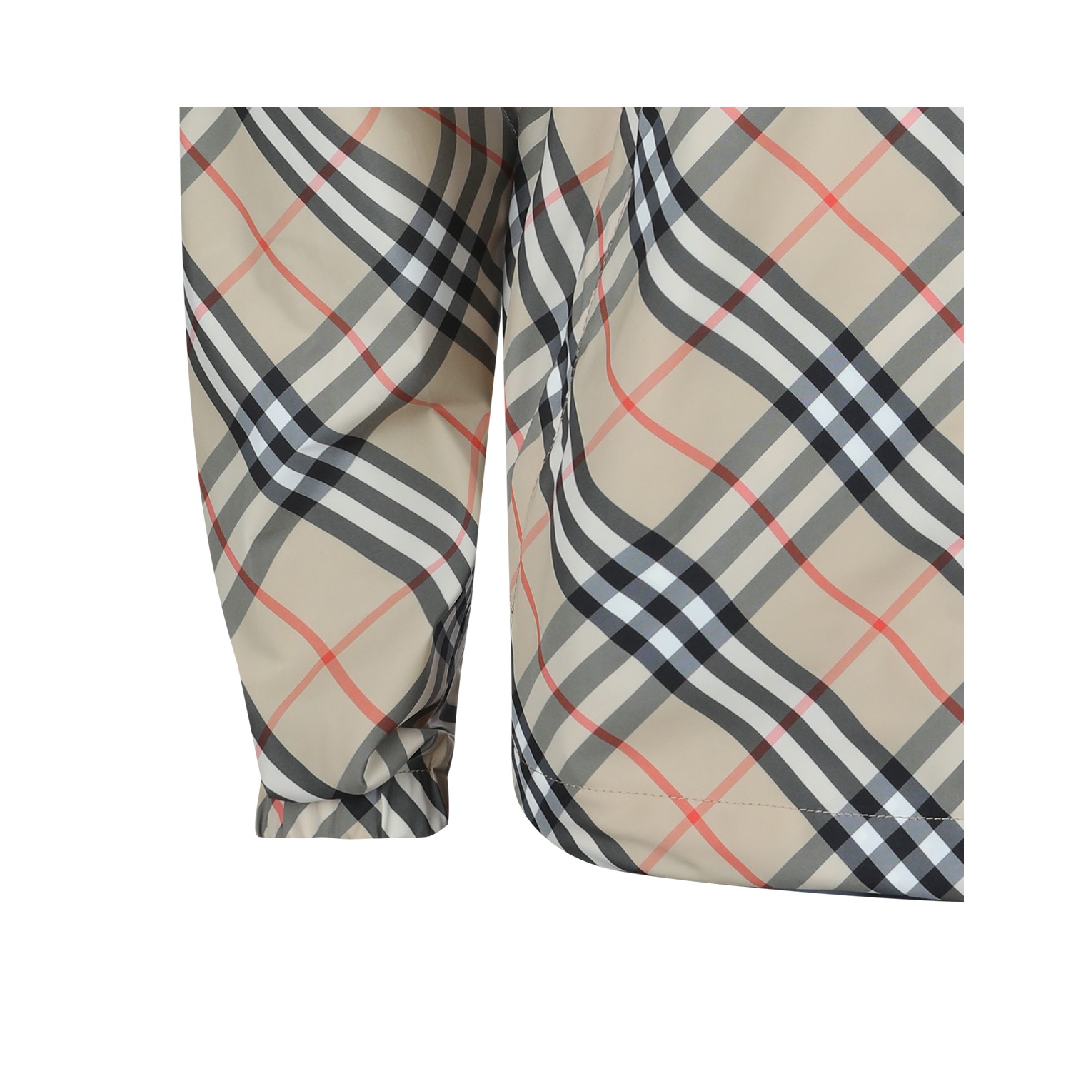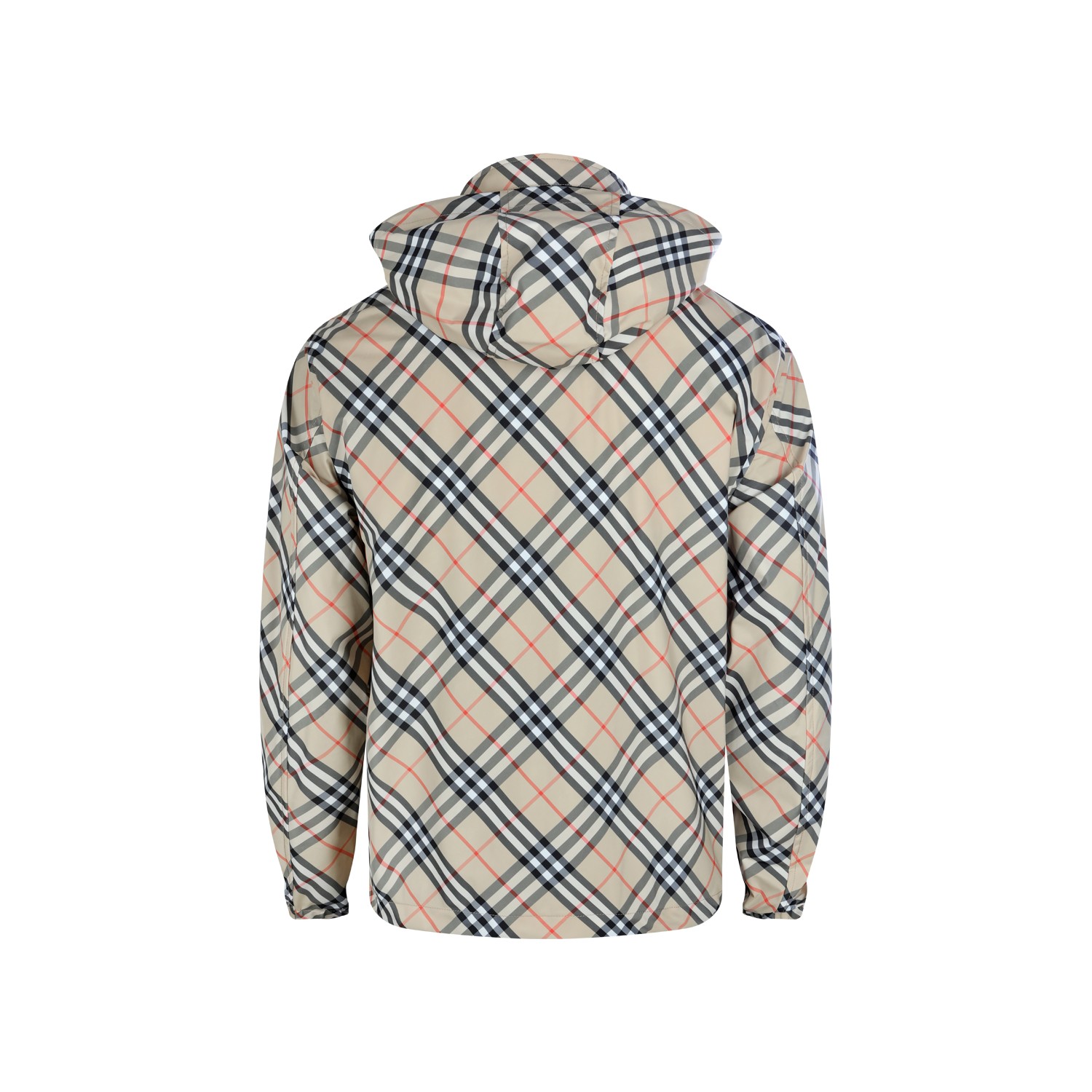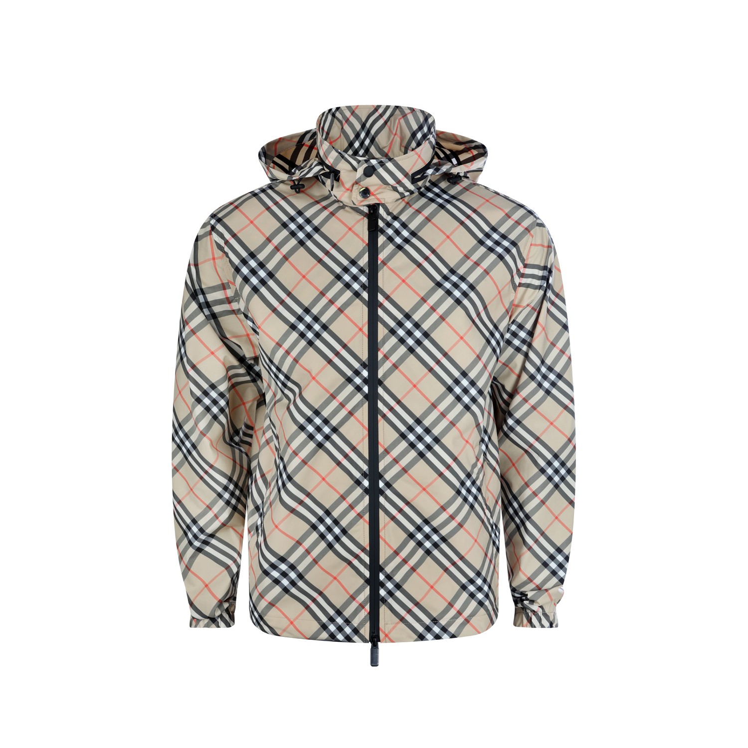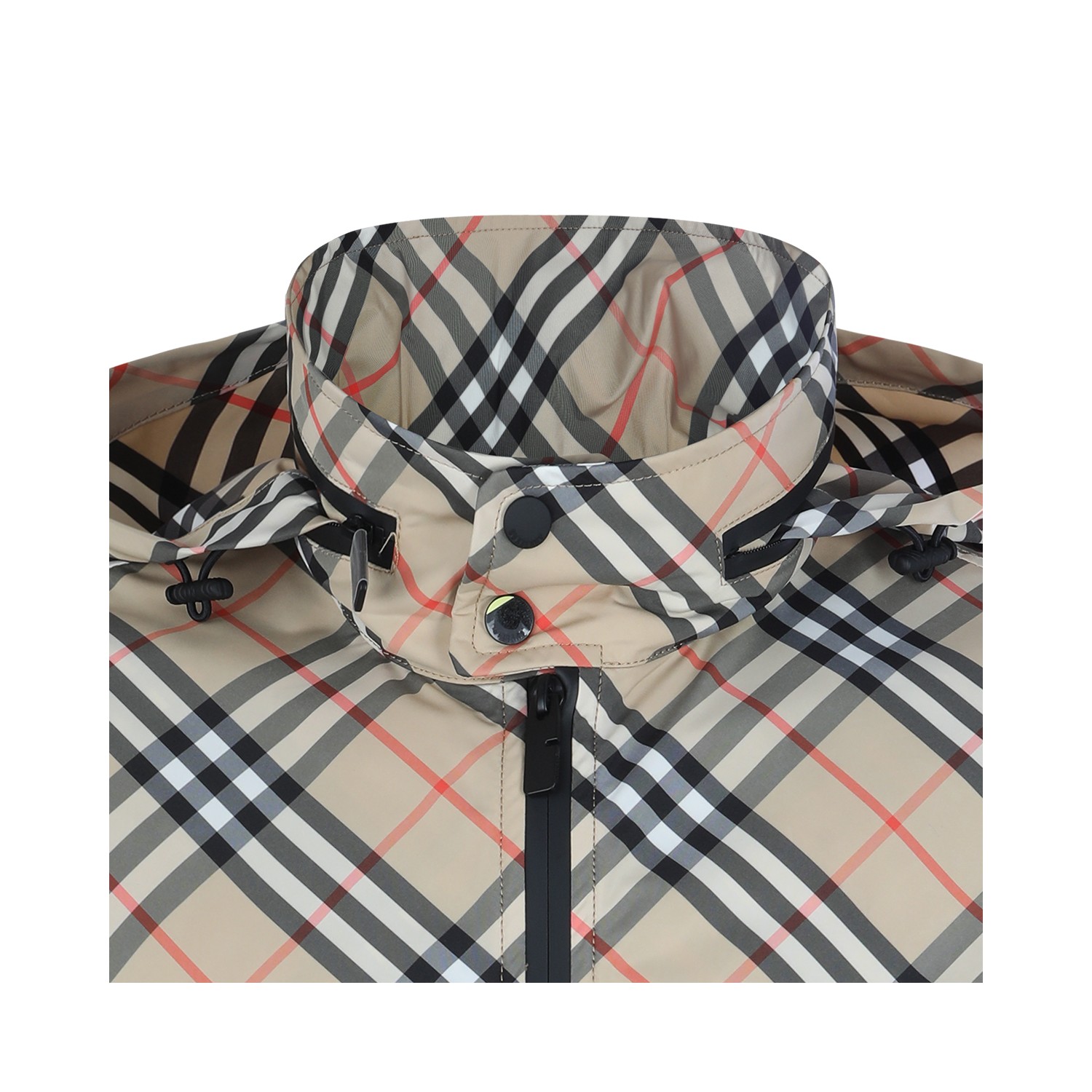 Beige casual jacket from Burberry featuring hood, high collar, zip fastening, long sleeves, pockets, all over iconic print and regular vestibility.