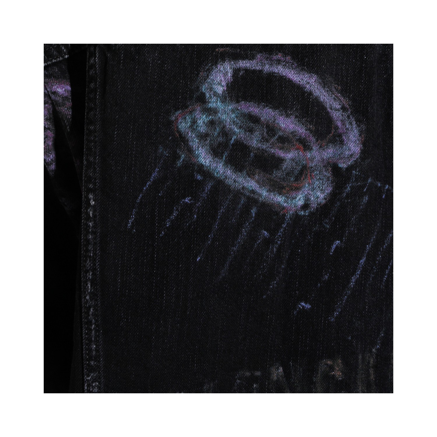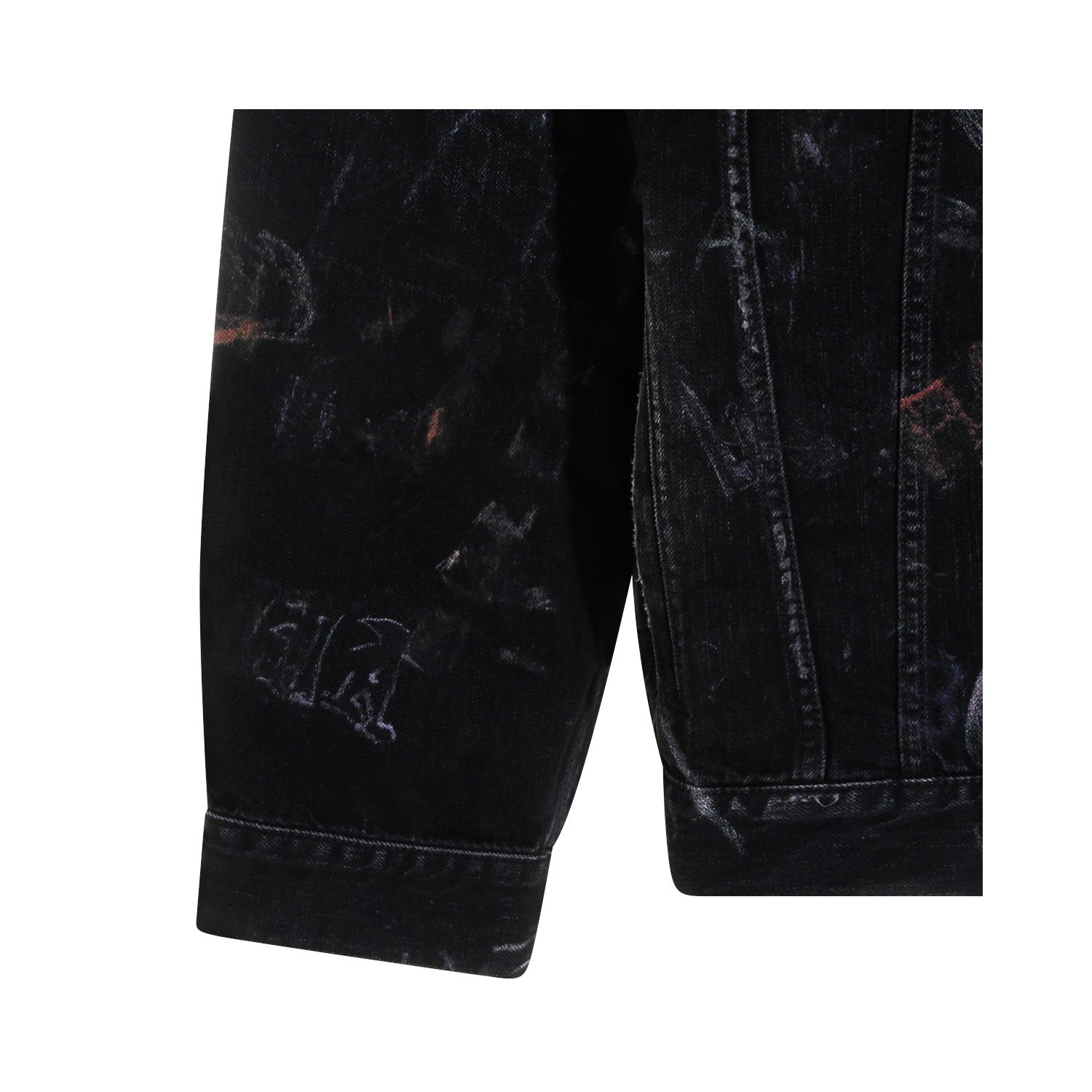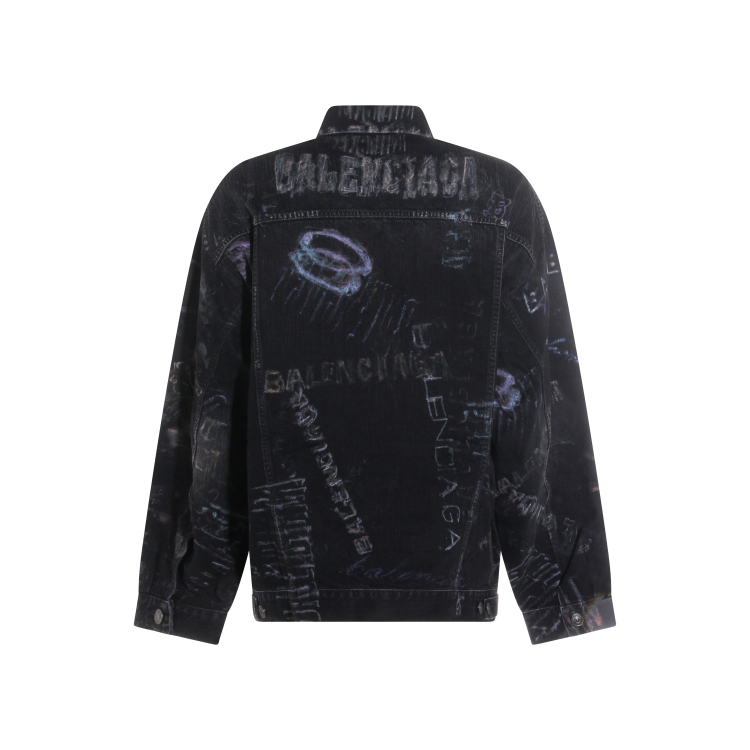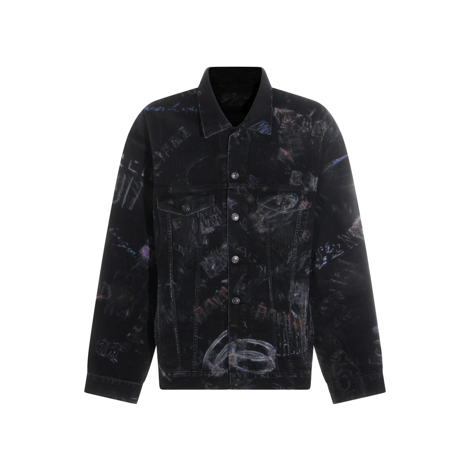 Black cotton denim jacket from Balenciaga featuring classic collar, long sleeves, graffiti pattern, frontal fastening and regular fit.