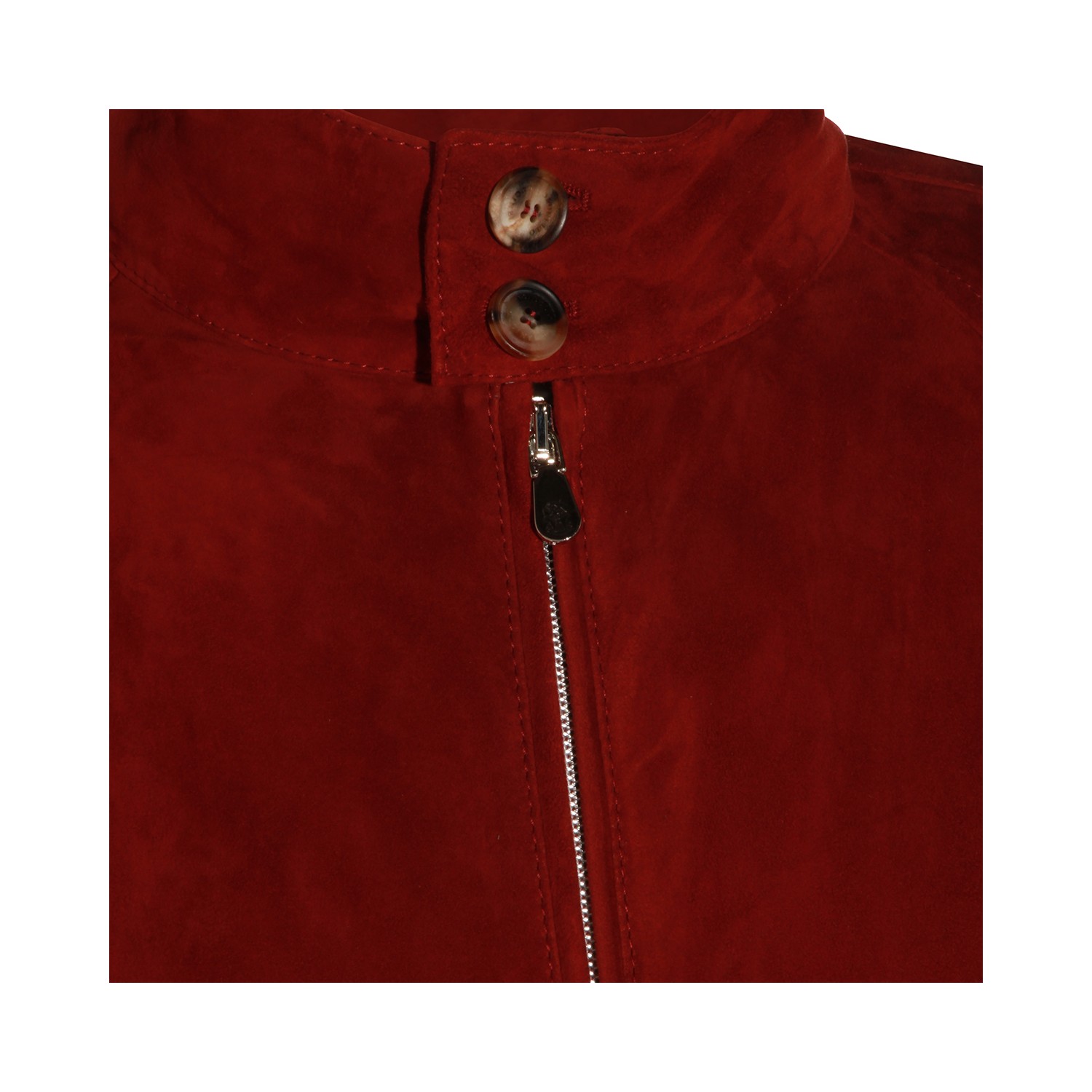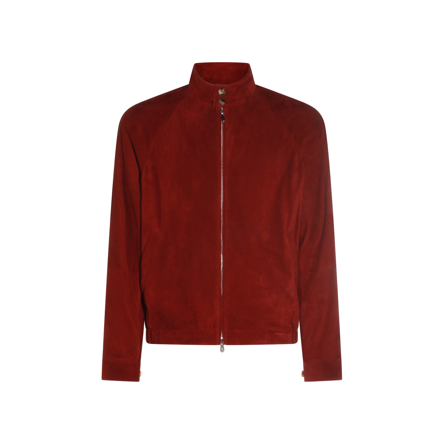 Cherry leather jacket from Brunello Cucinelli featuring long sleeves, high neck, zip closure at front, ribbed hems and side pockets.