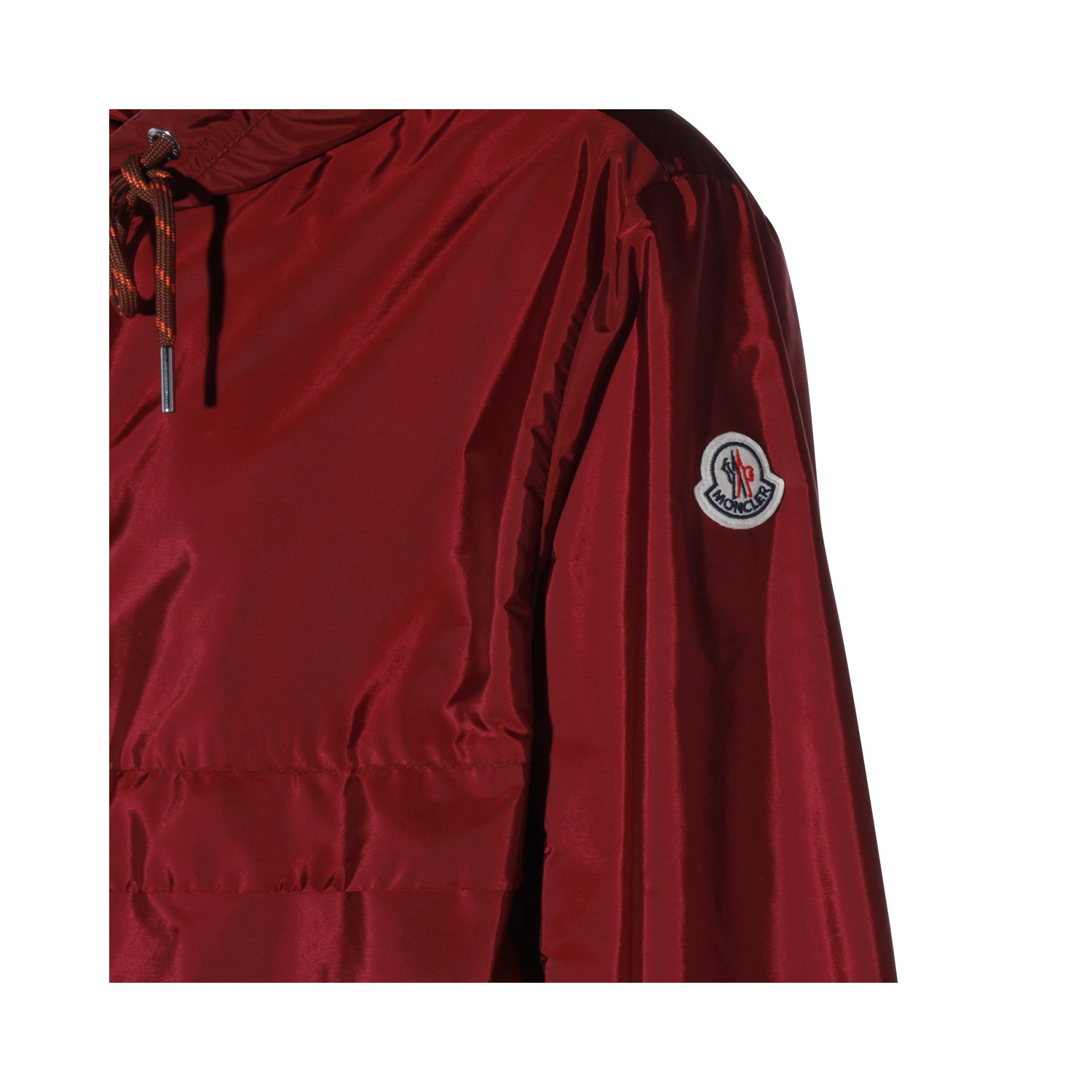 Burgundy Nidge casual jacket from Moncler featuring long sleeves, hoodie, zip closure, logo details and side pockets.