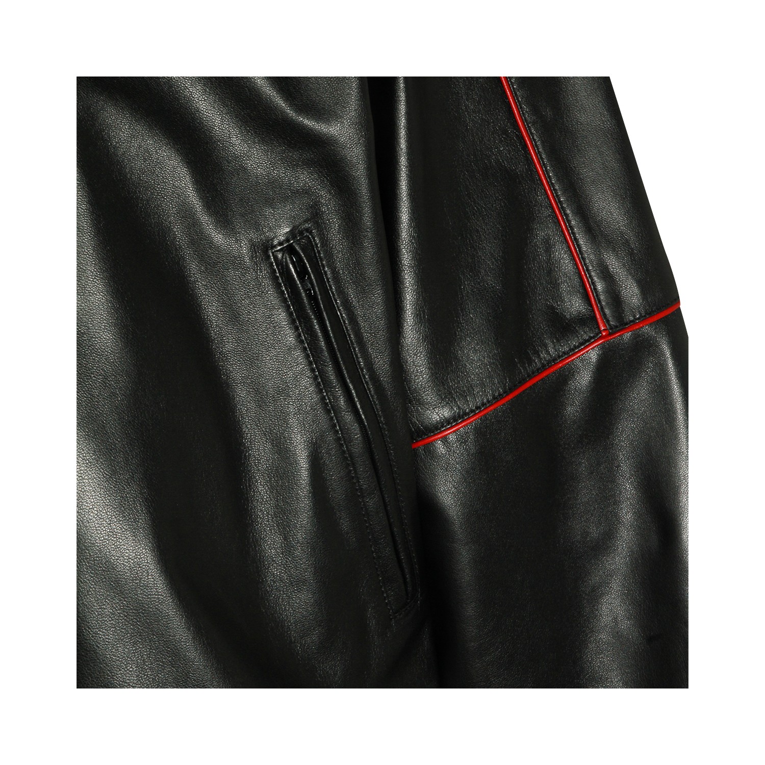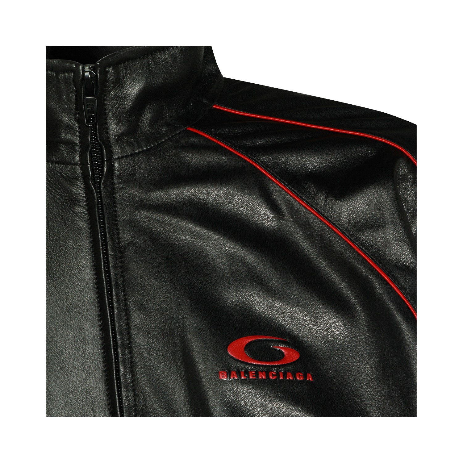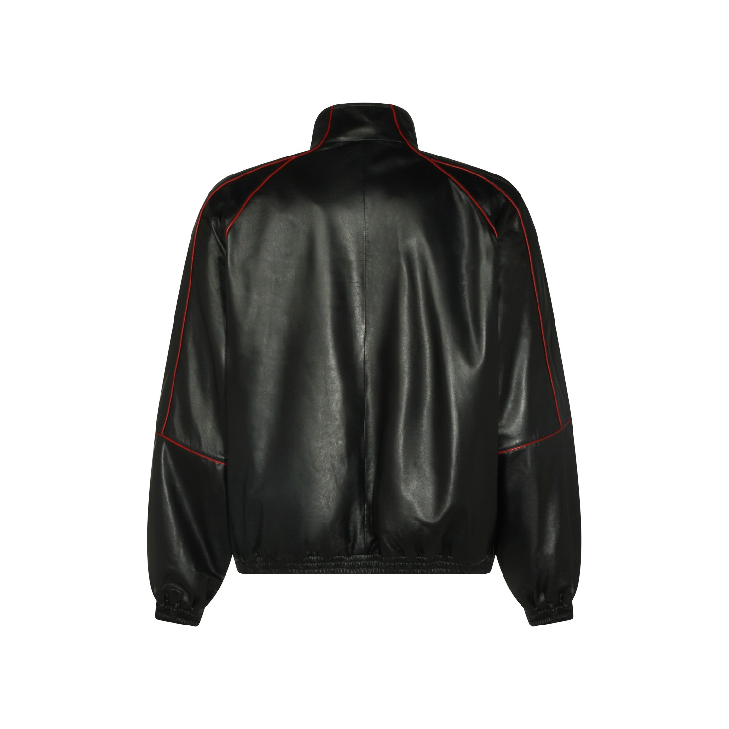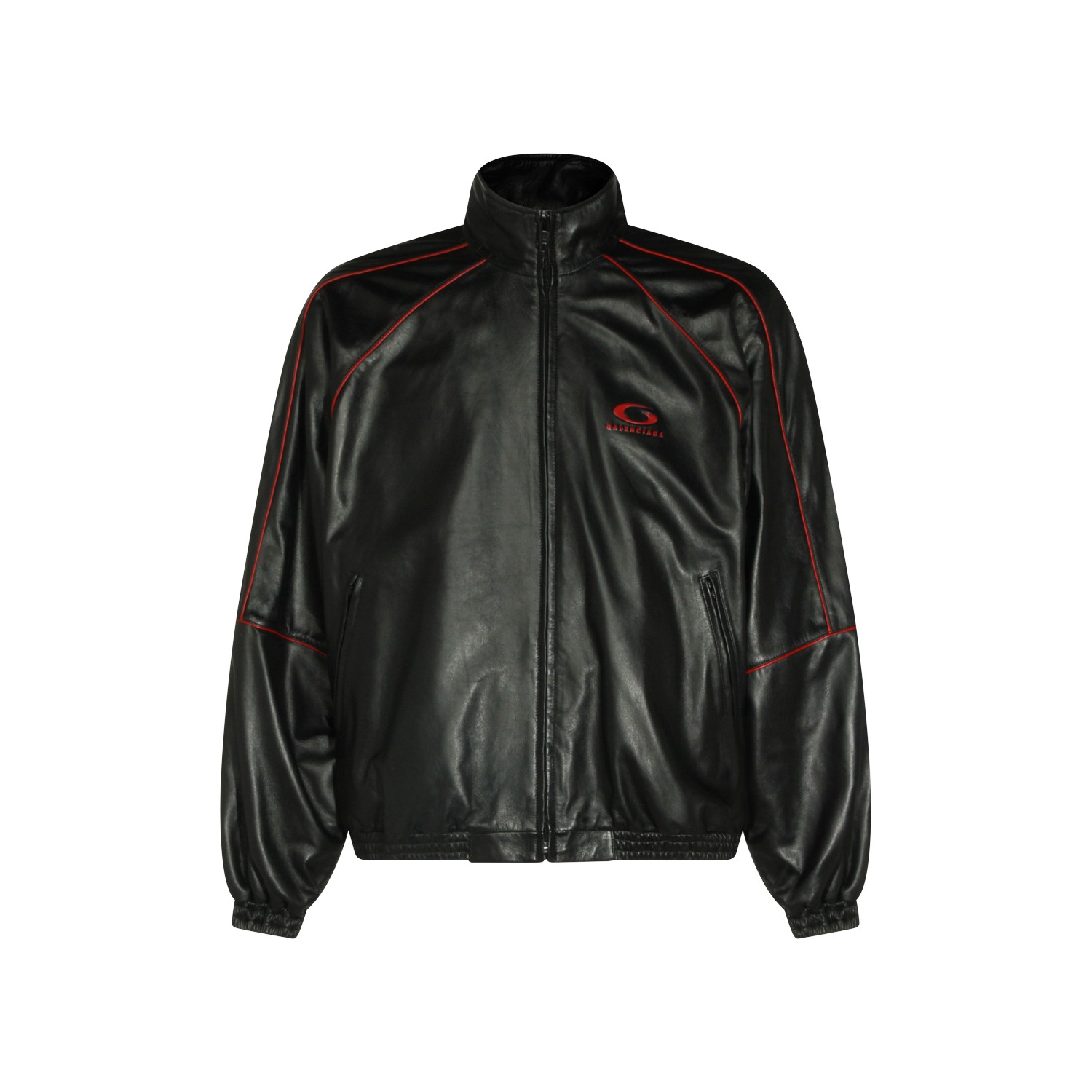 Black leather jacket from Balenciaga featuring high collar, long sleeves, zip fastening, contrasting red details, elasticated waist and cuffs, pockets and regular fit.