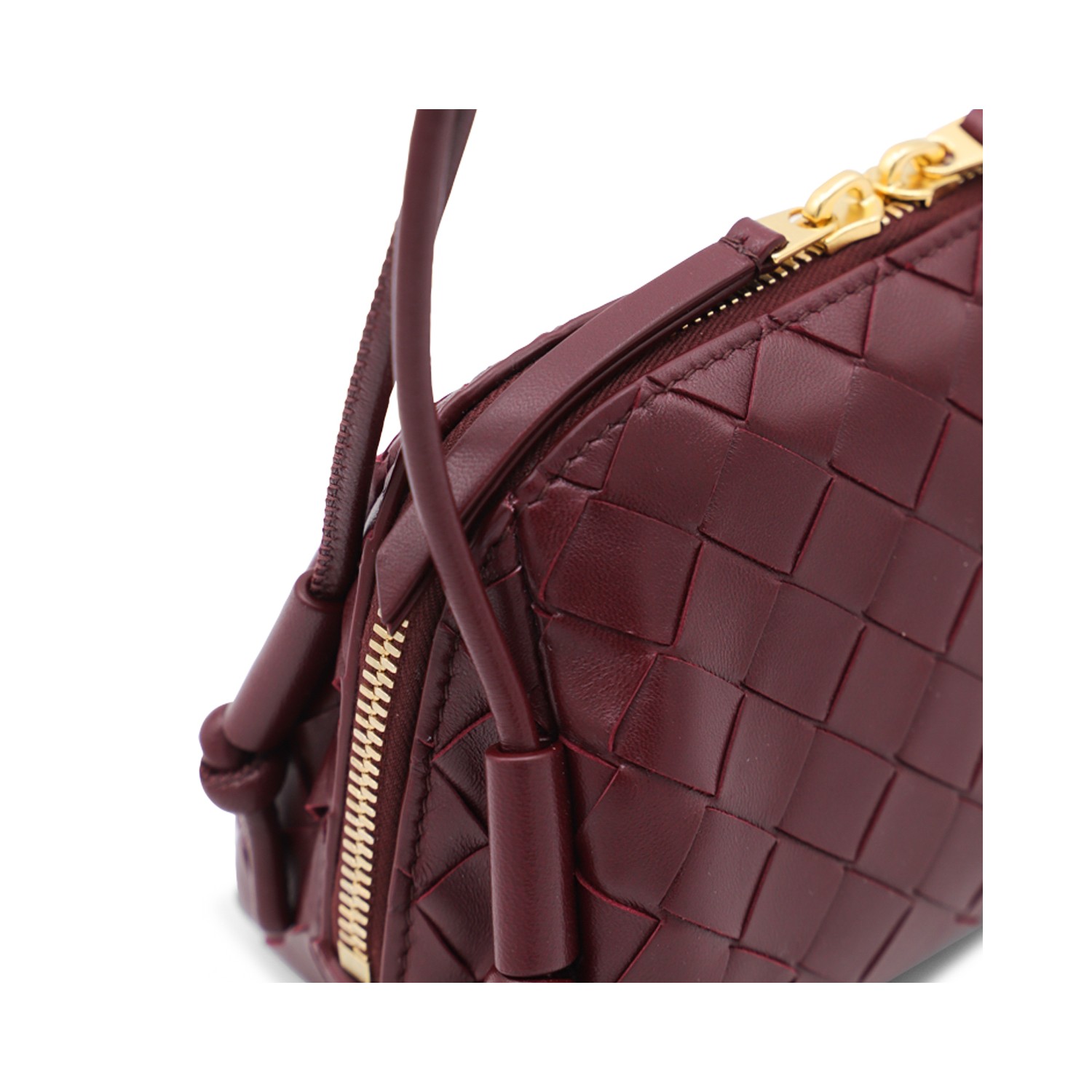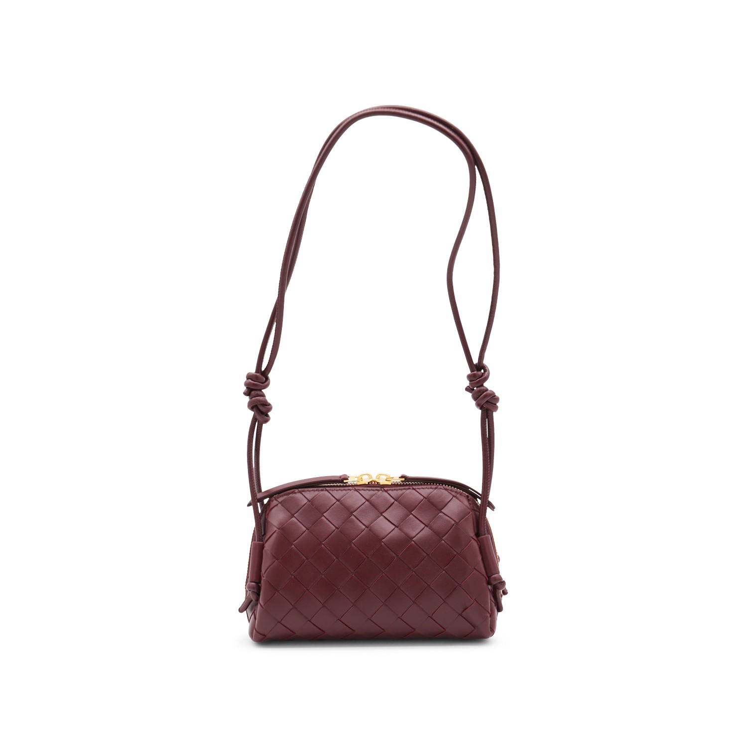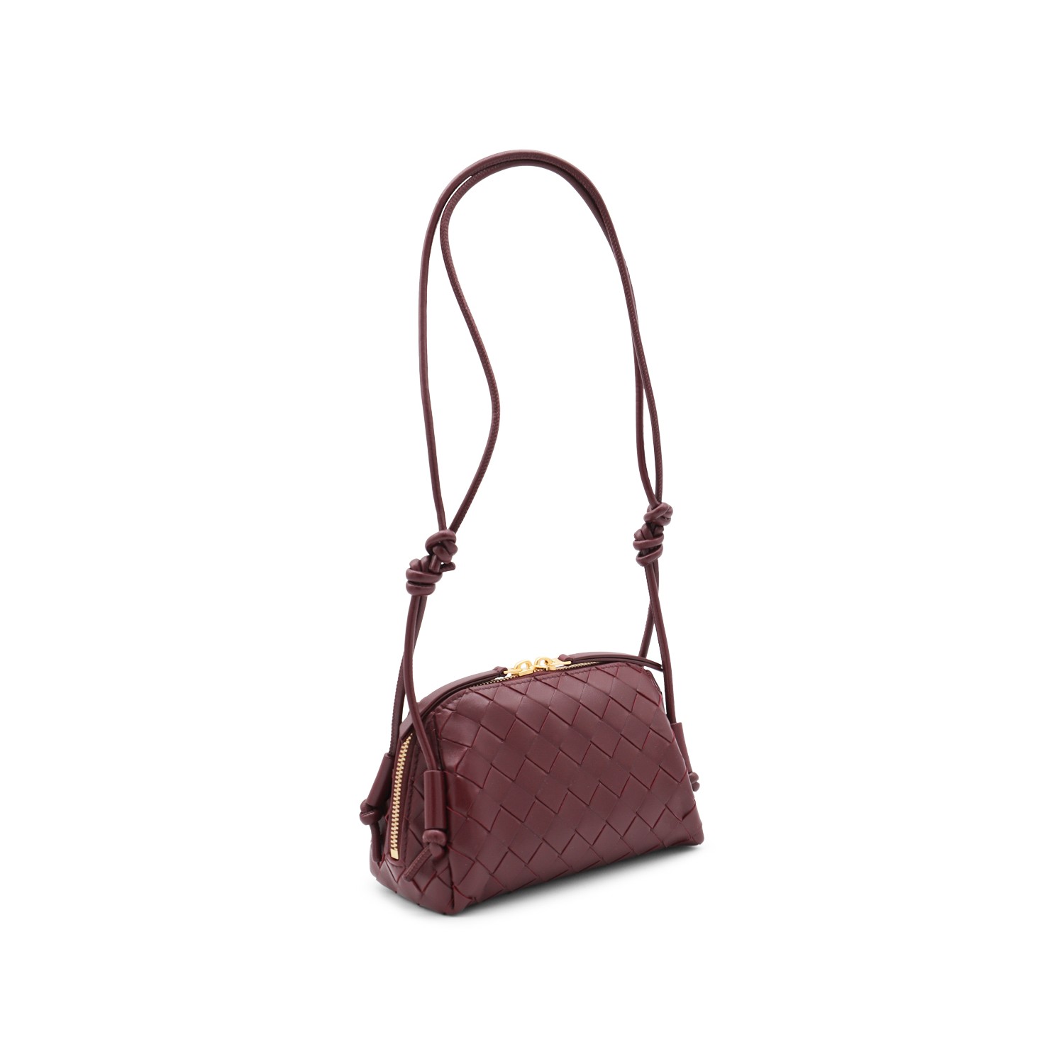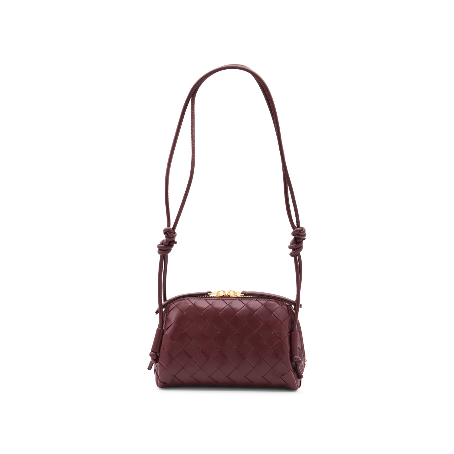 Dark red leather Concert pouche from Bottega Veneta featuring gold tone hardware, adjustable strap, double zip fastening and inside pocket.