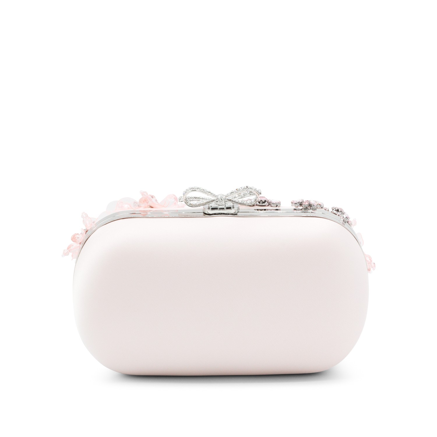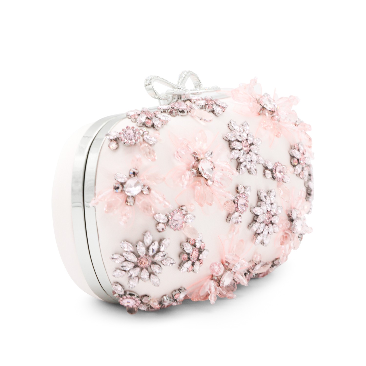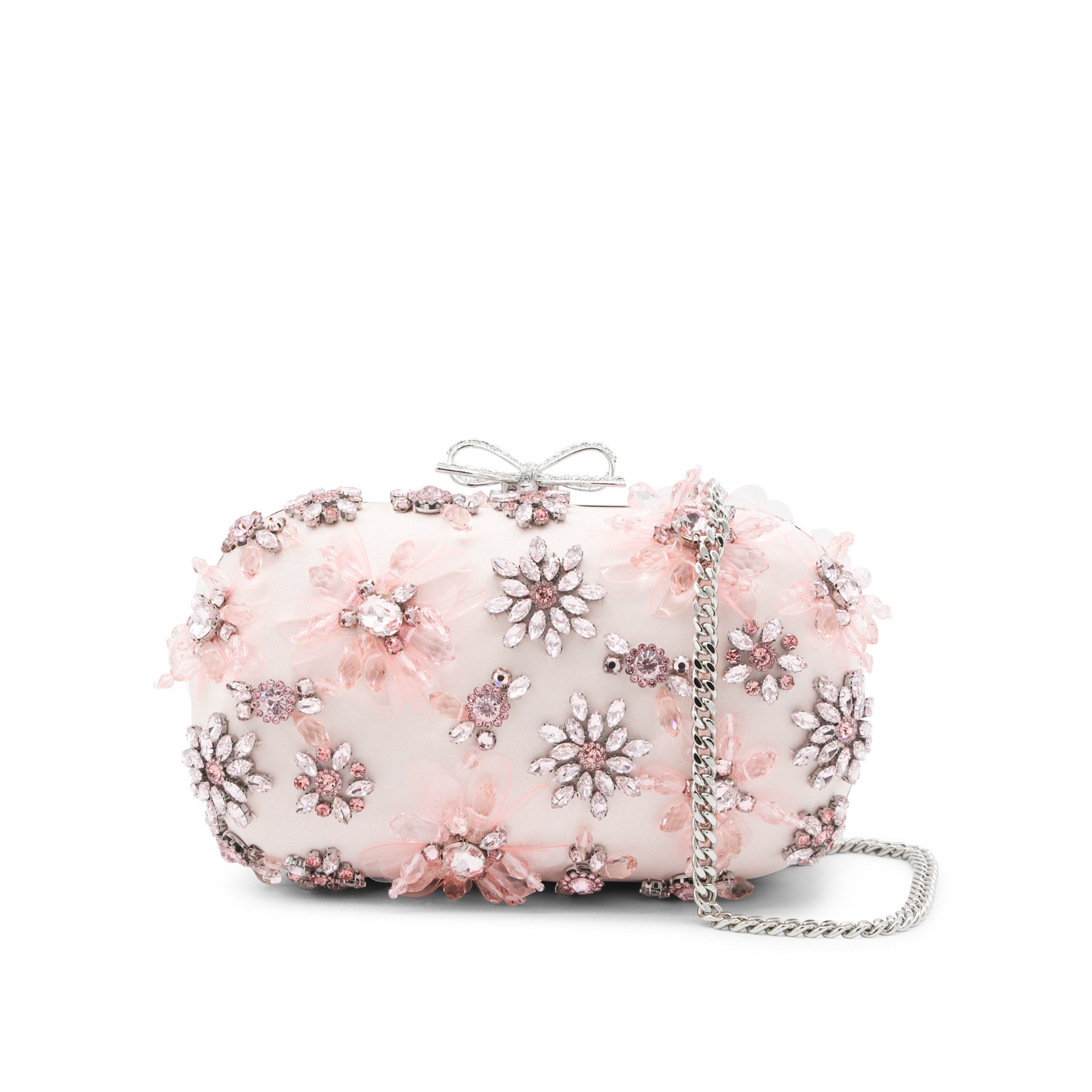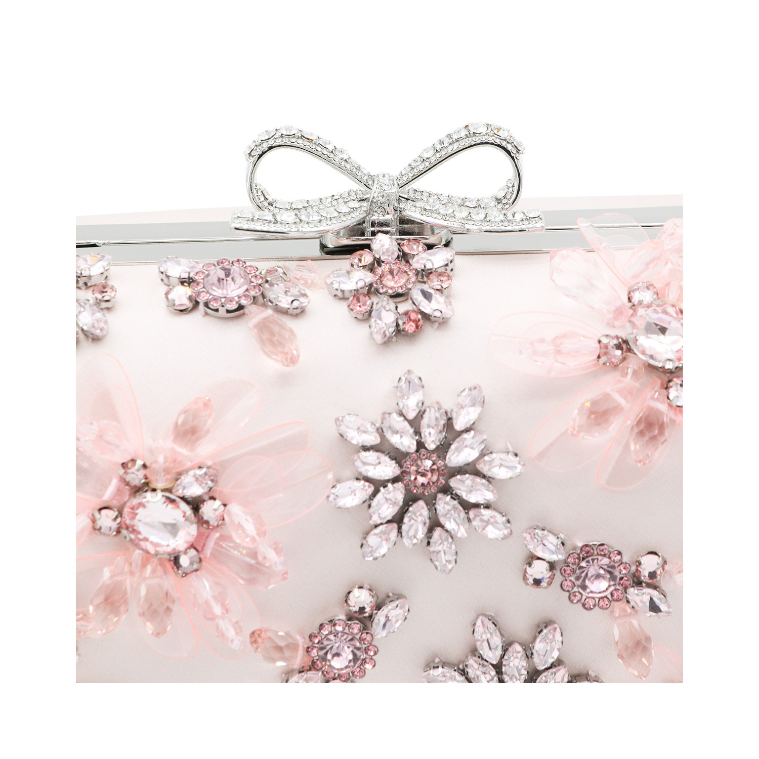 Pink clutch from Self-Portrait featuring upper fastening, inside pocket, all over details and removable strap.