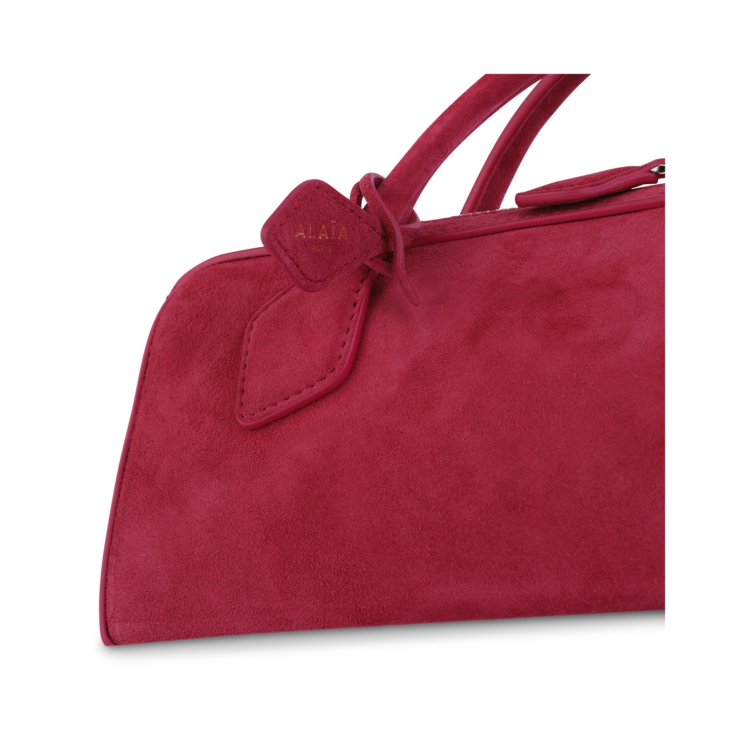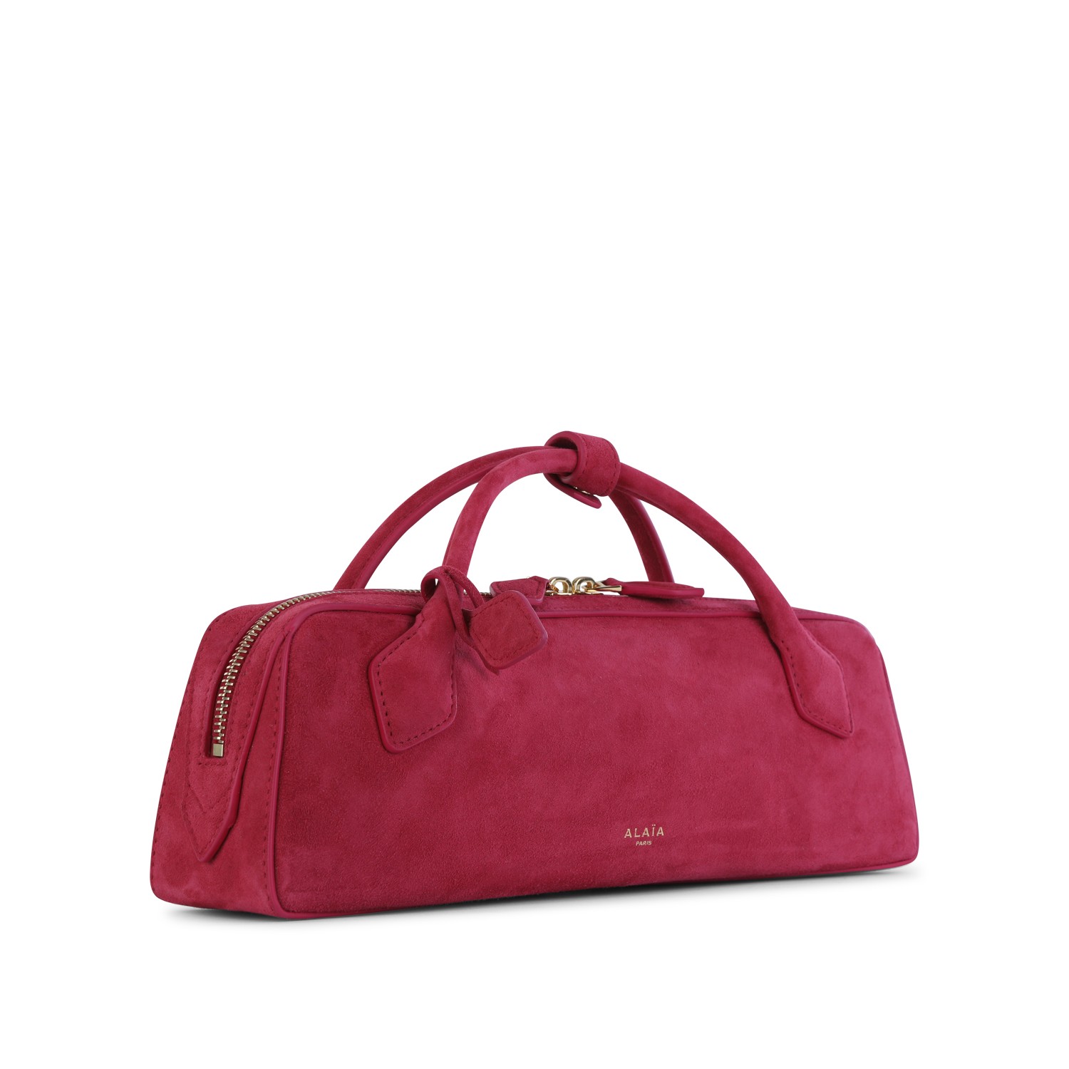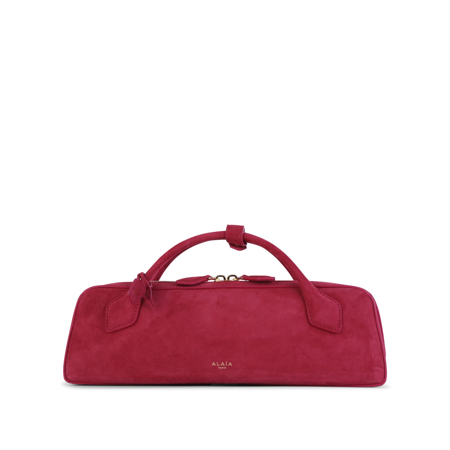 Strawberry pink leather Le Teckel clutch from Alaia featuring top handles, main compartment, zip fastening and frontal logo.