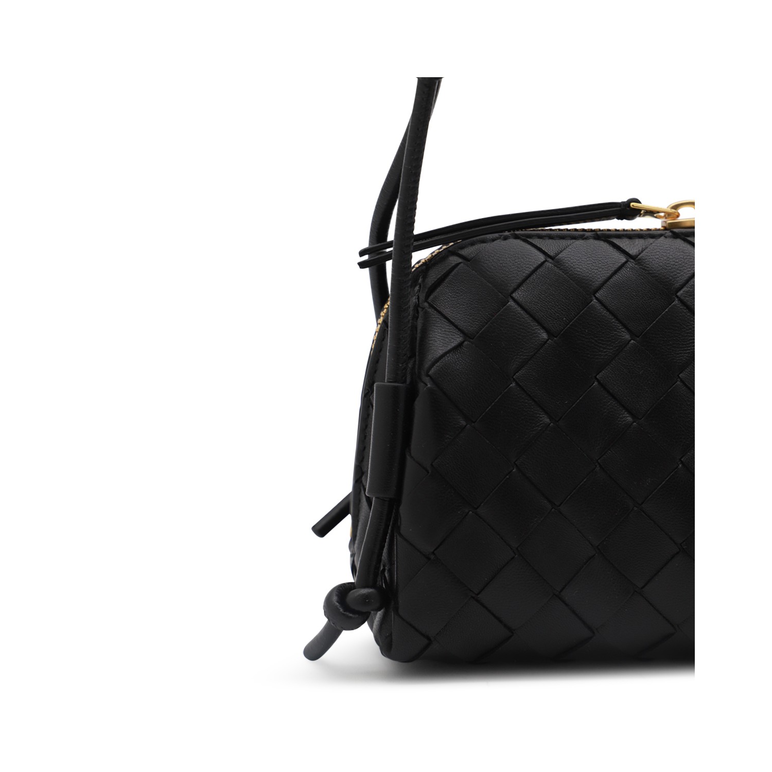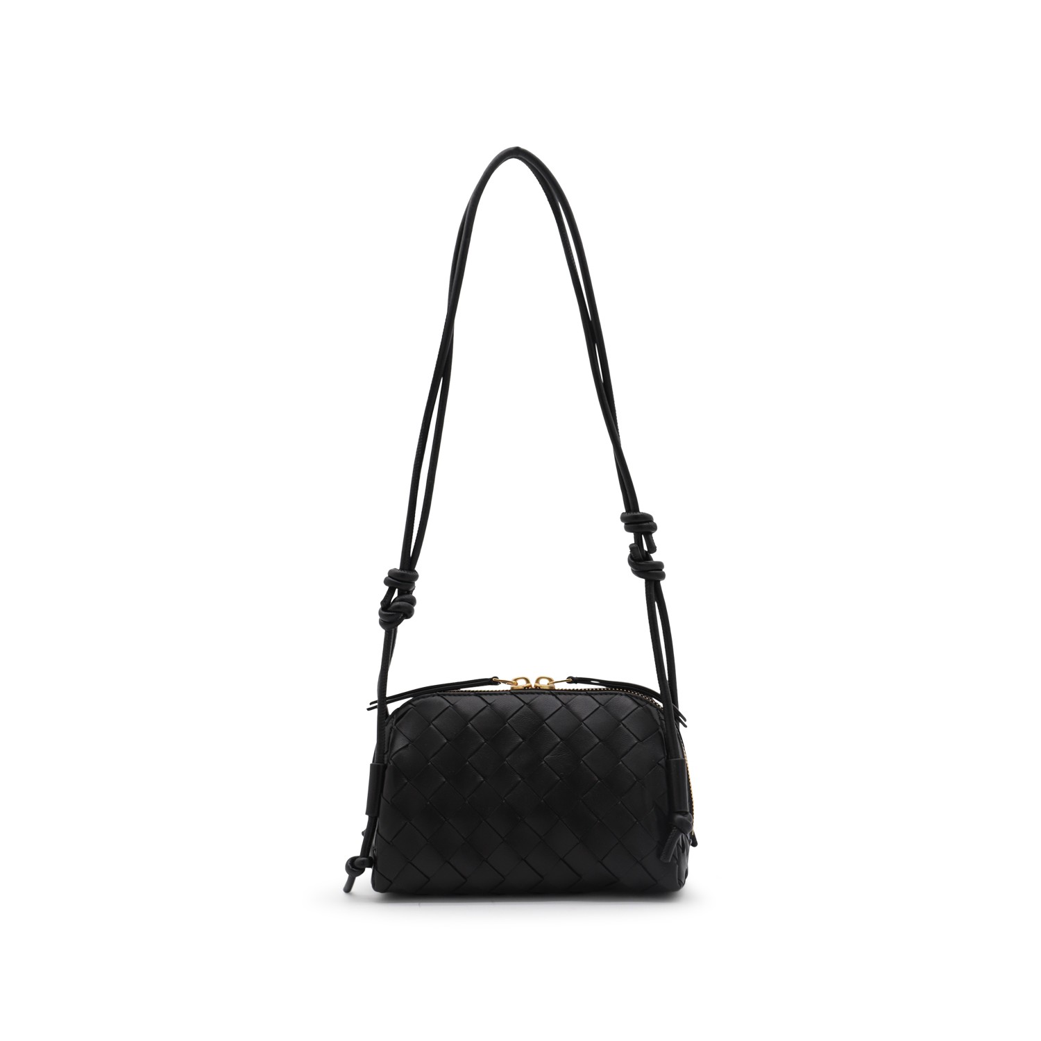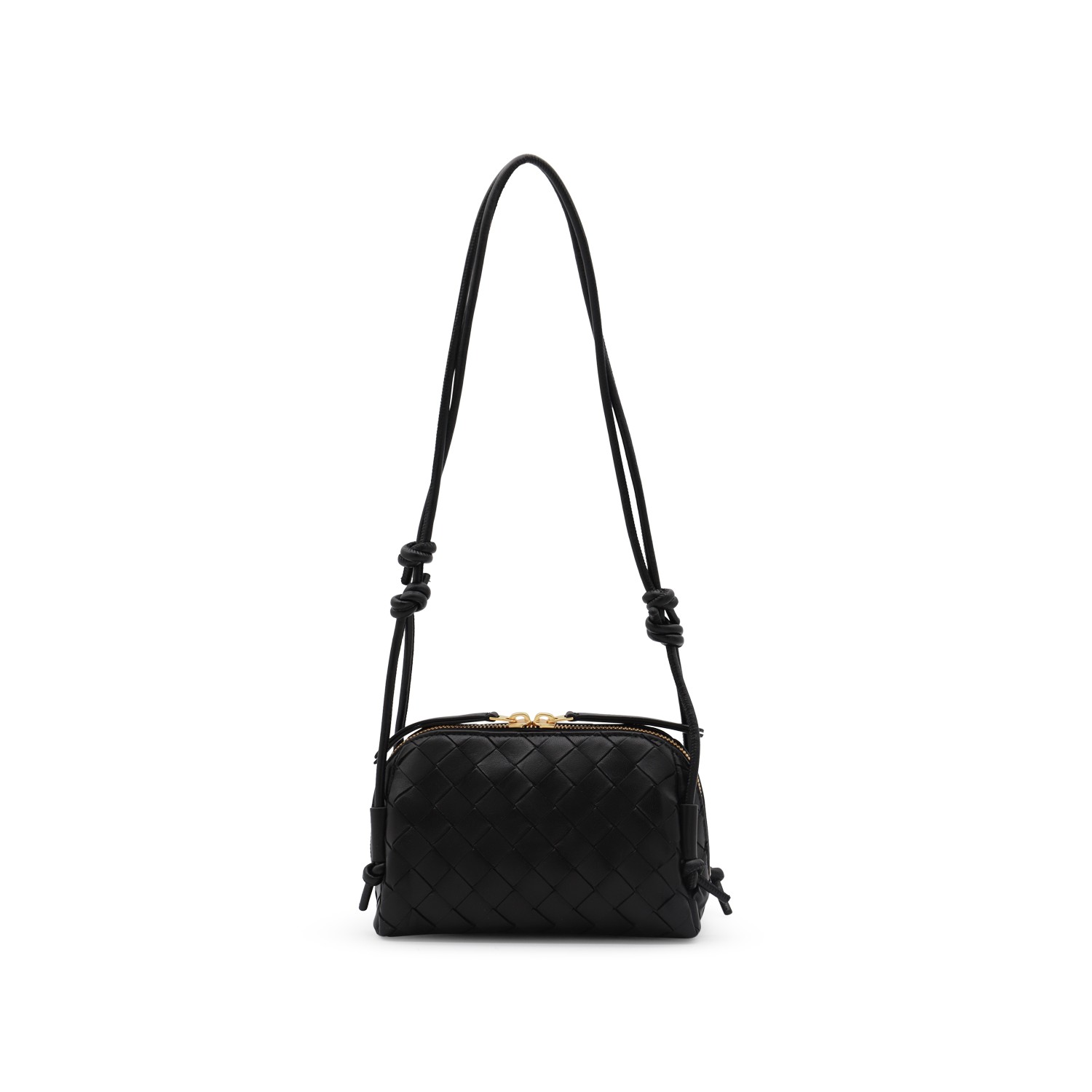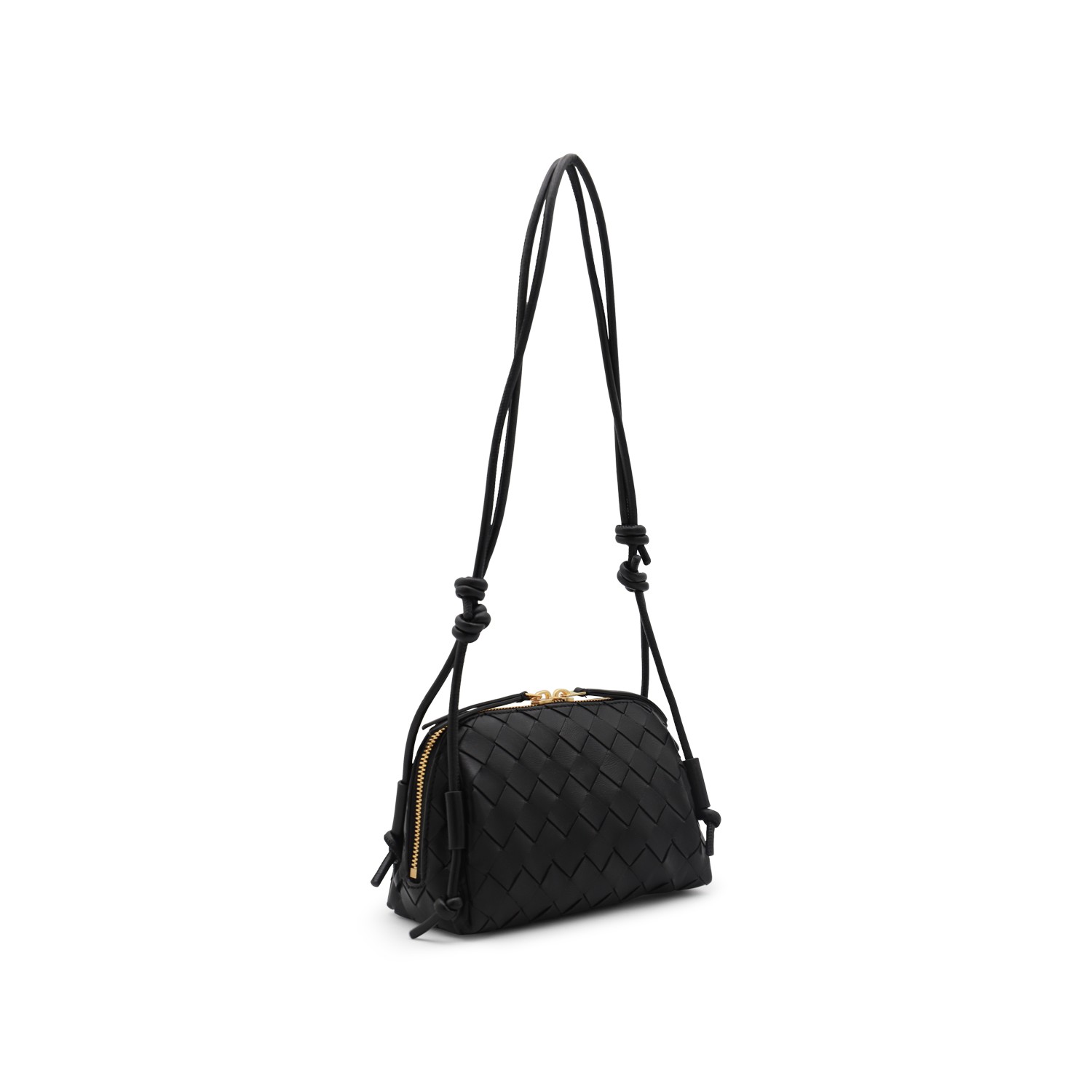Black leather Concert pouch from Bottega Veneta featuring adjustable shoulder strap, double zip fastening, main compartment and internal pocket.
