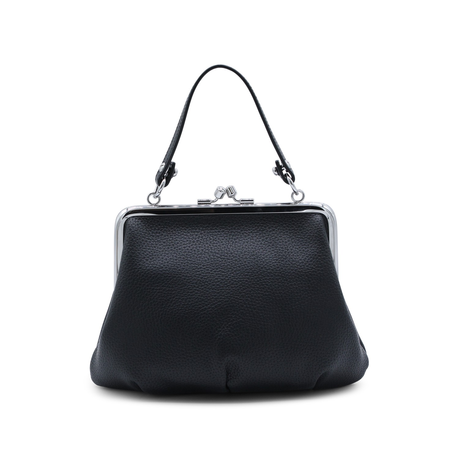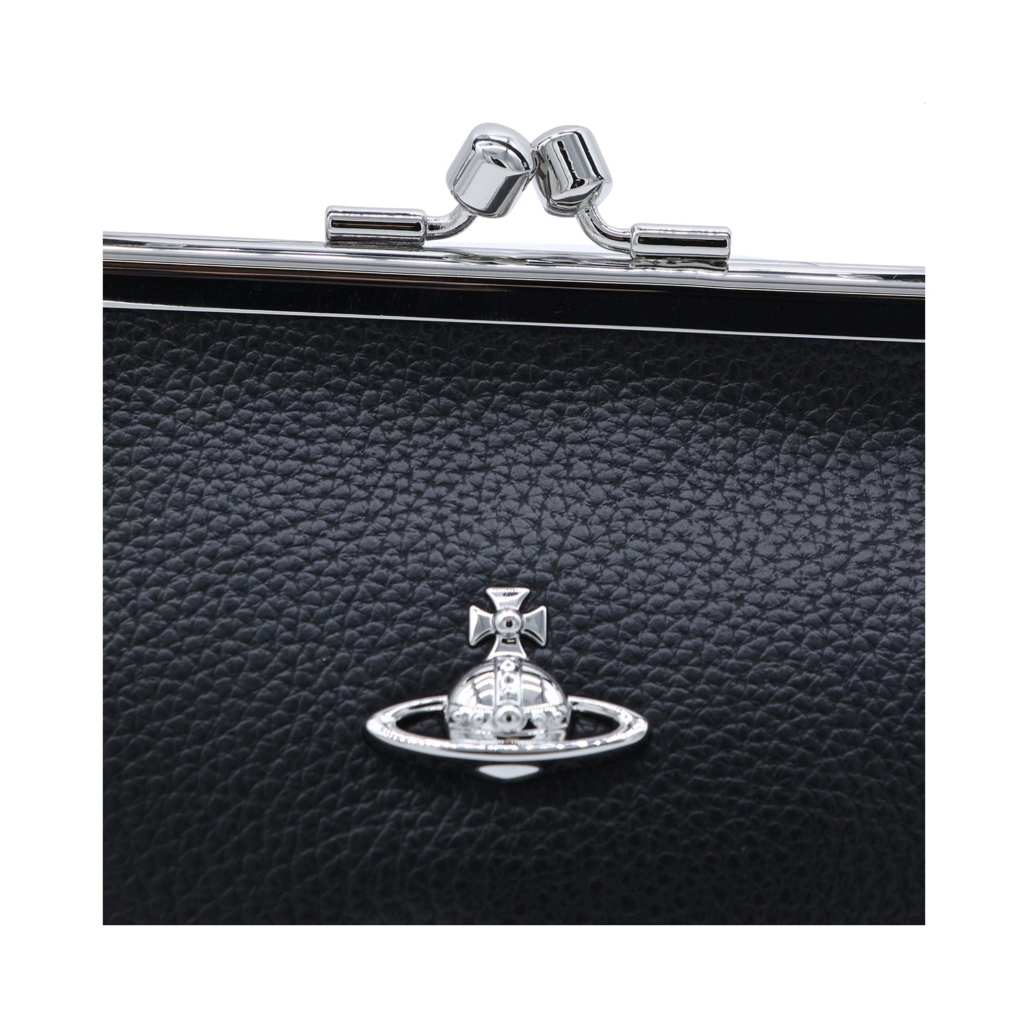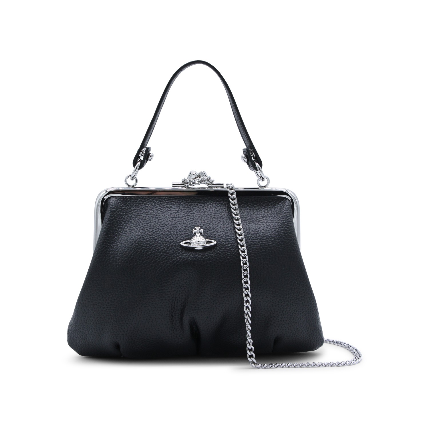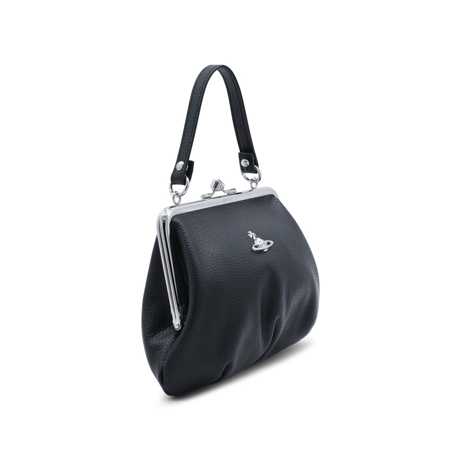 Black clutch from Vivienne Westwood featuring removable top handle, metal Orb logo, snap closure and main compartment.
