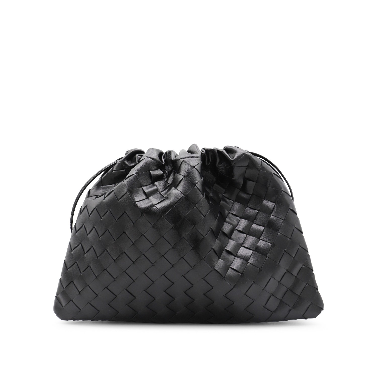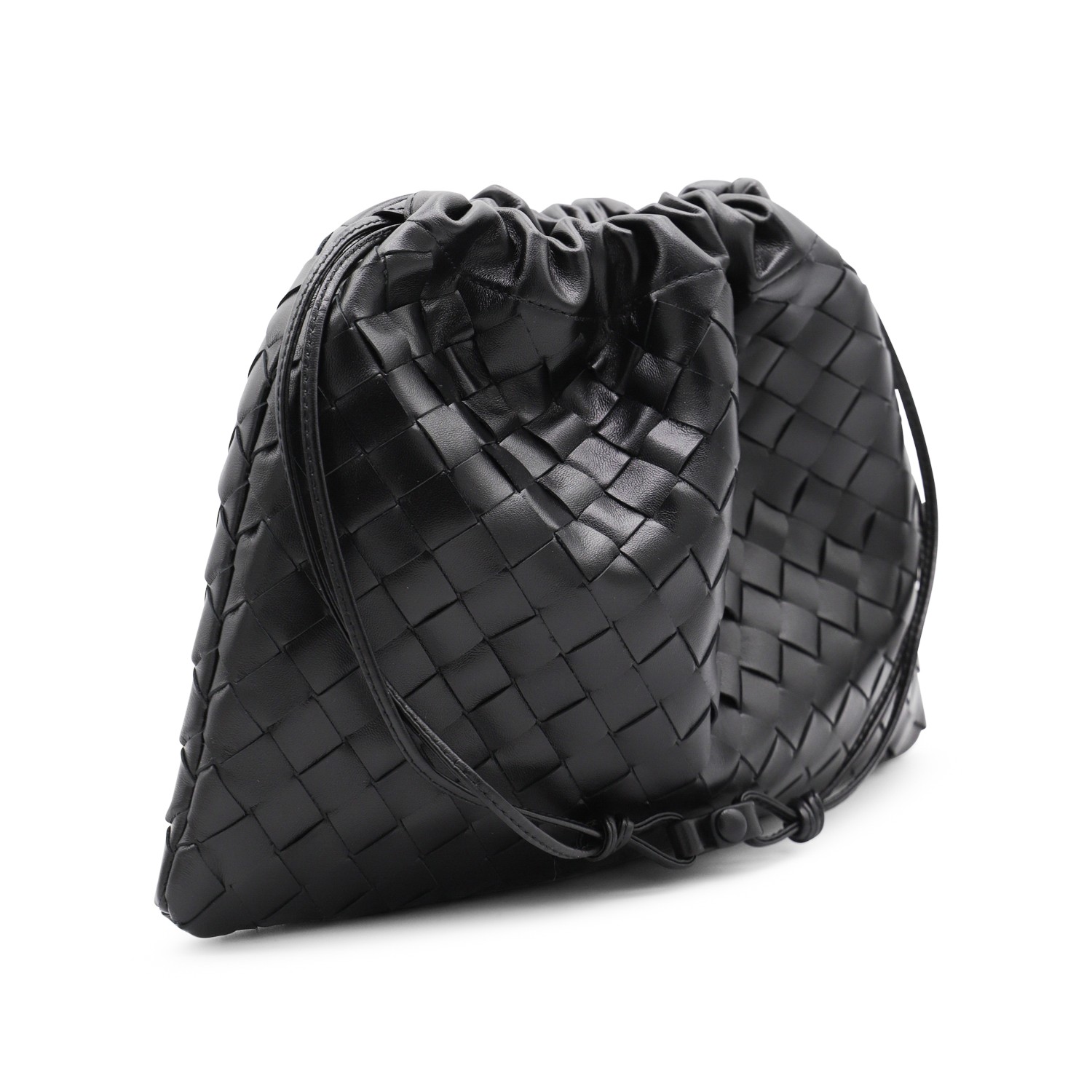 Black leather pouch from Bottega Veneta featuring akk-over Intreccio motif, drawstring fastening, leather details, main compartment and pocket.