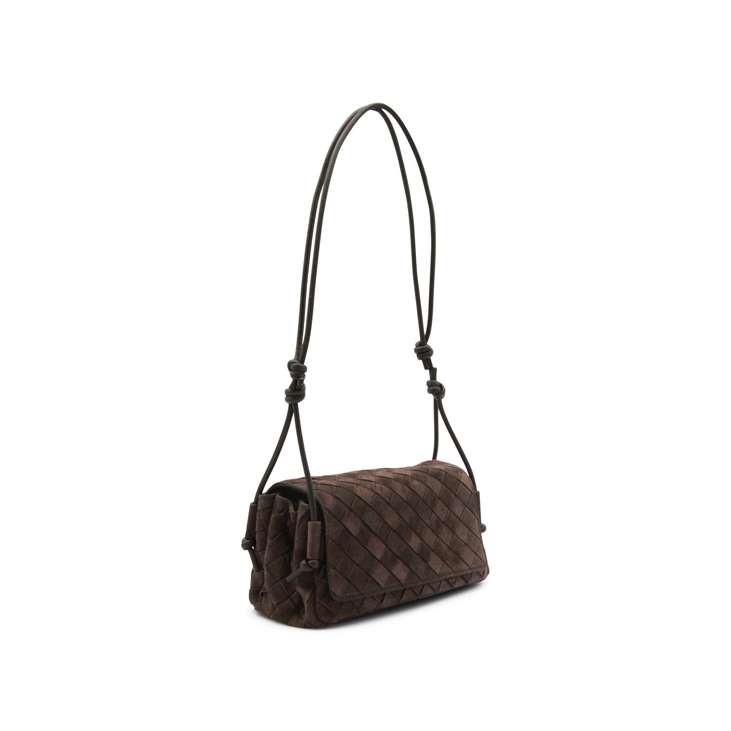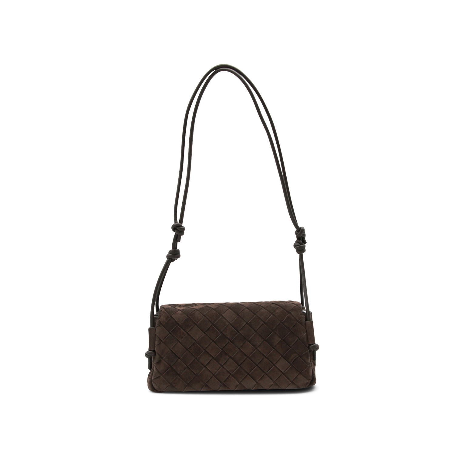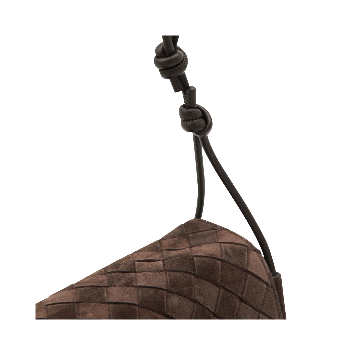 Fondant leather Notturno pouch from Bottega Veneta featuring suede, all-over Intreccio motif, adjustable shoulder strap, magnetic flap closure, compartments and internal zip pocket.