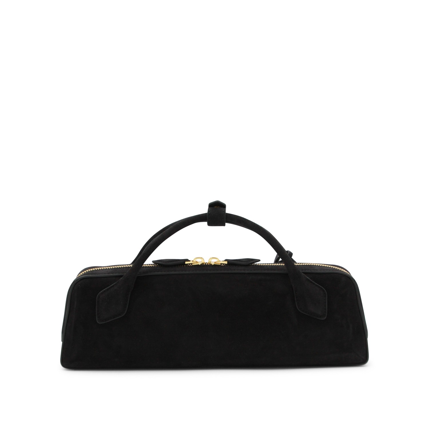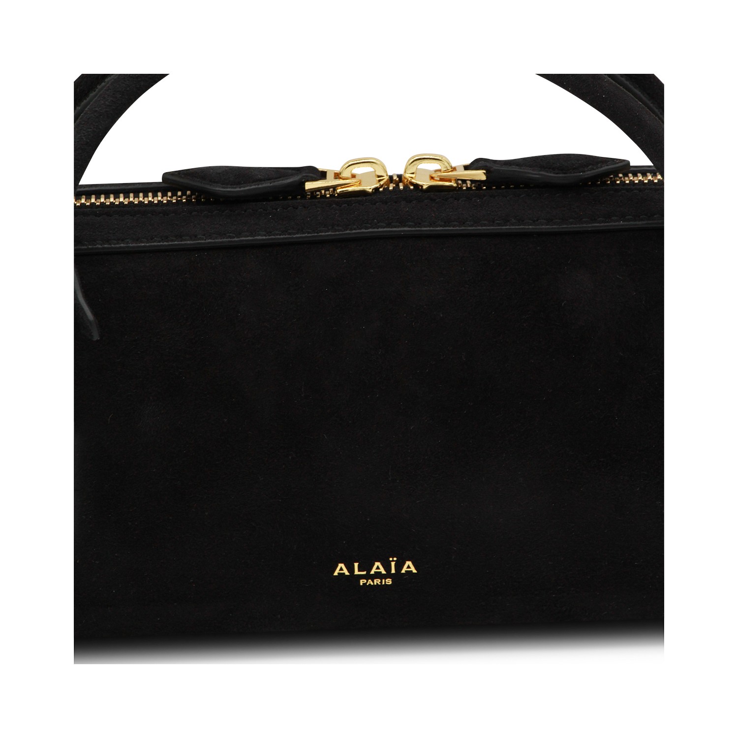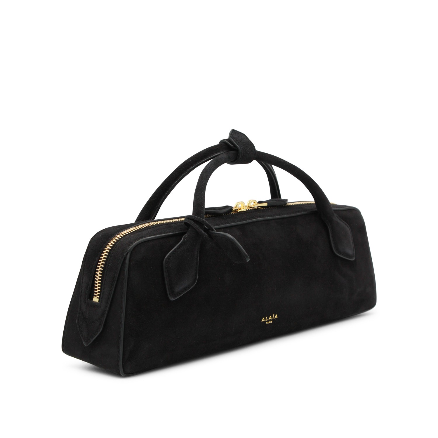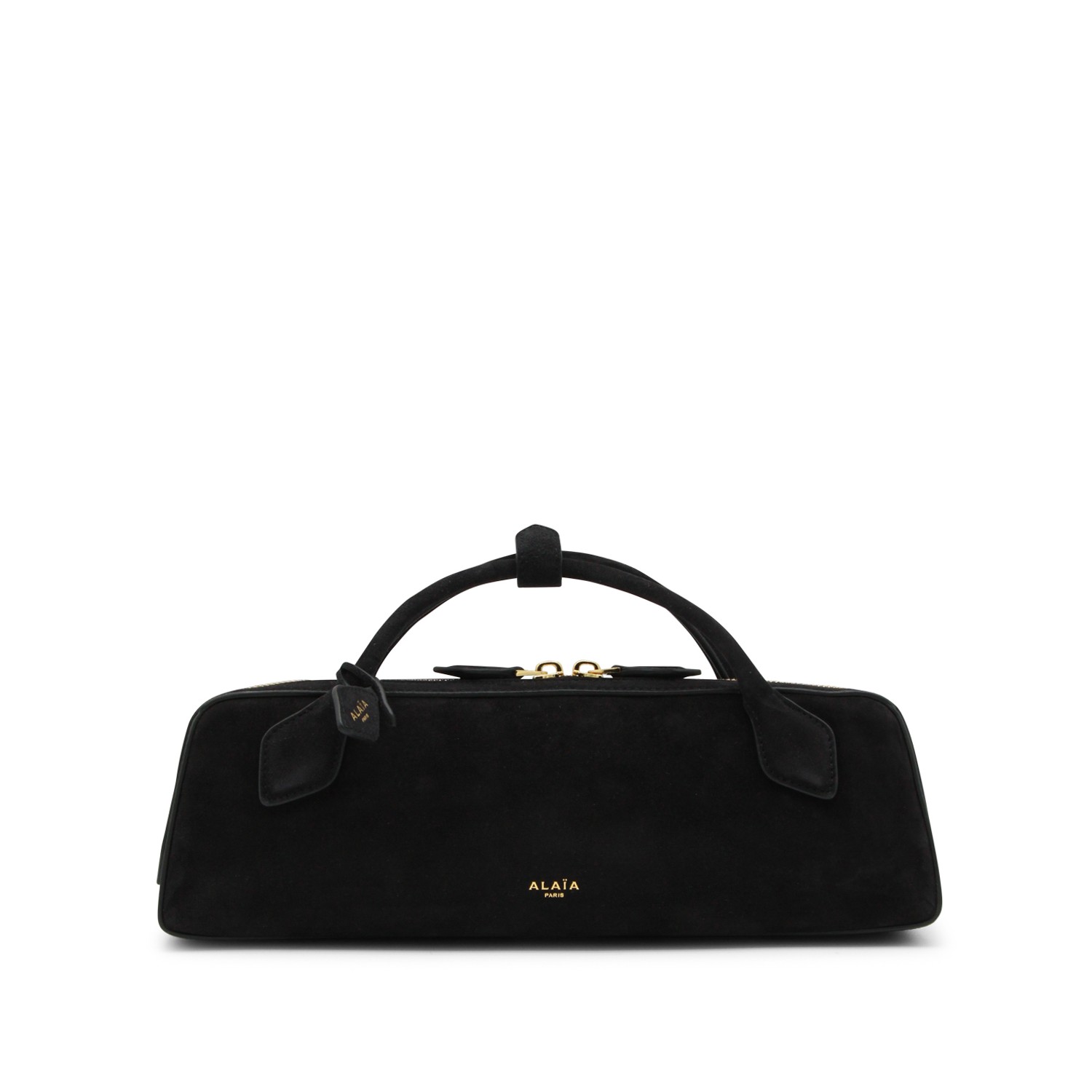 Black leather Le Teckel clutch from Alaia featuring tubolar handles, frontal logo print, double zip closure and main compartment.