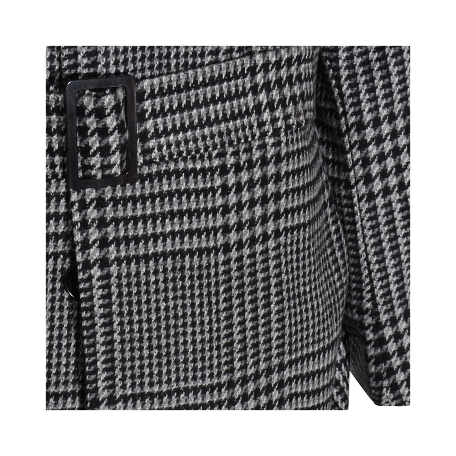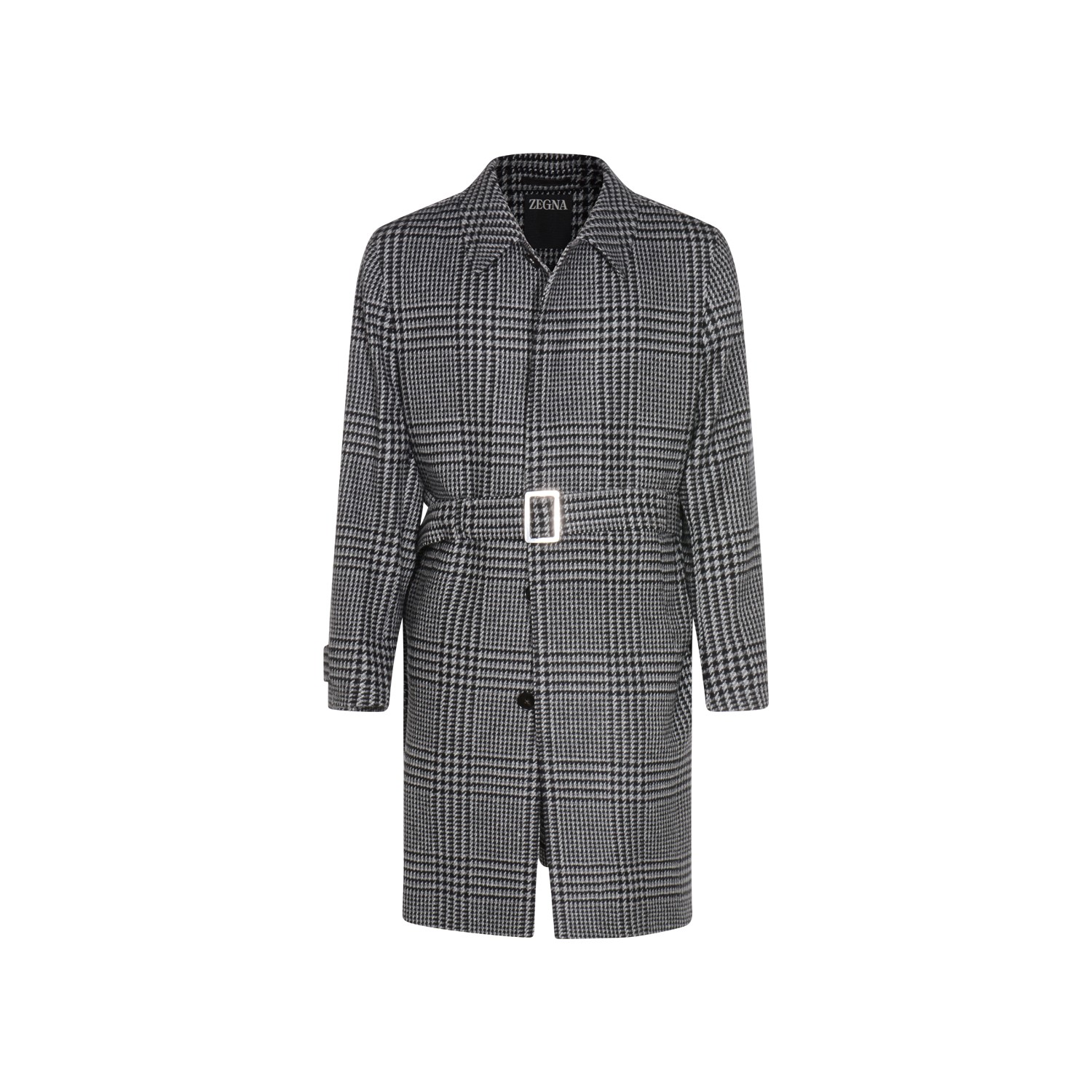 Grey and black wool coat from Zegna featuring long sleeves, belt waist, pockets, midi length and all over pattern.