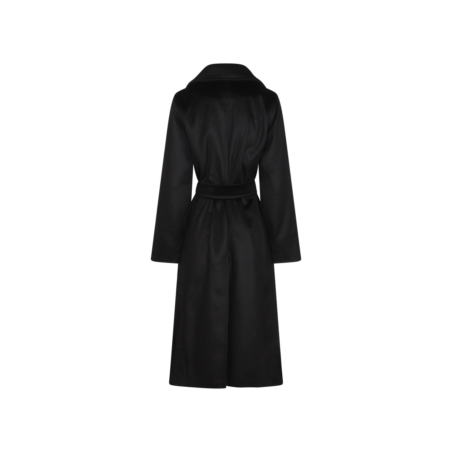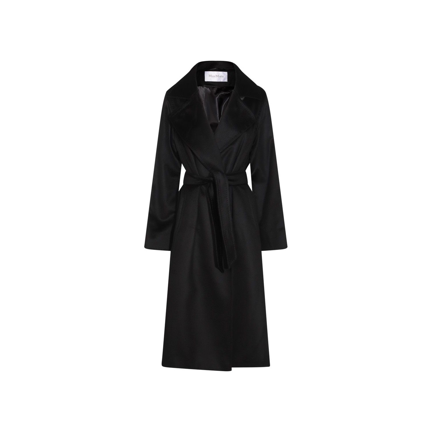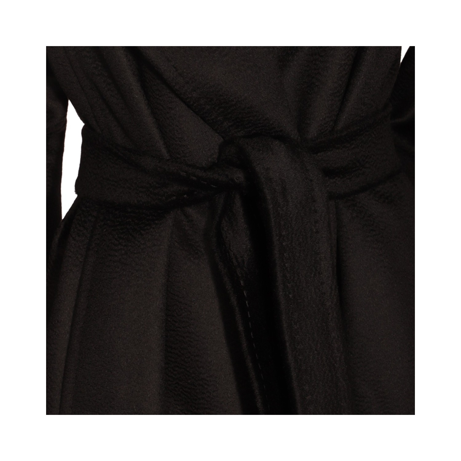 Black wool Manuela coat from Max Mara featuring lapel collar, long sleeves, matchy belt closure, pockets and regular vestibility.