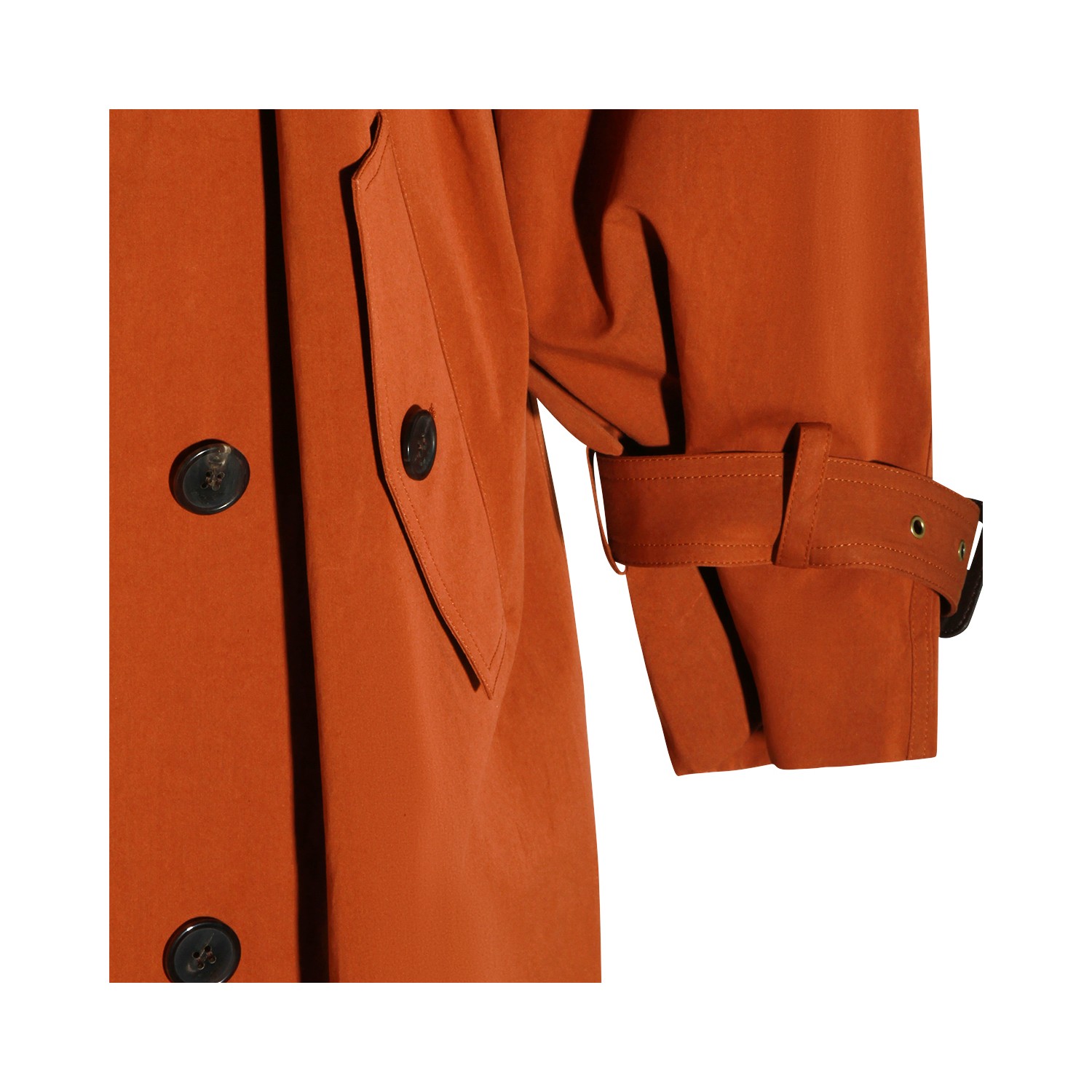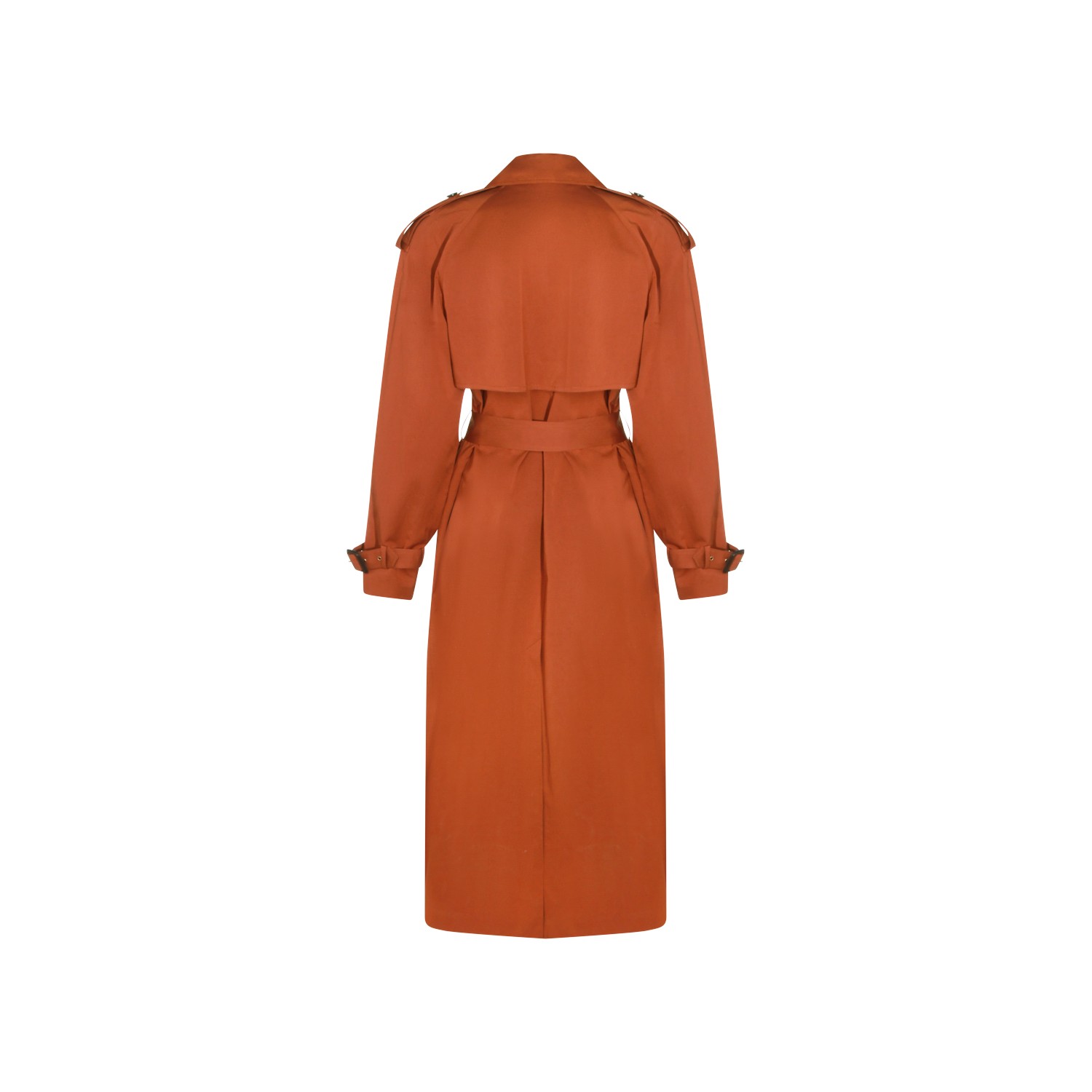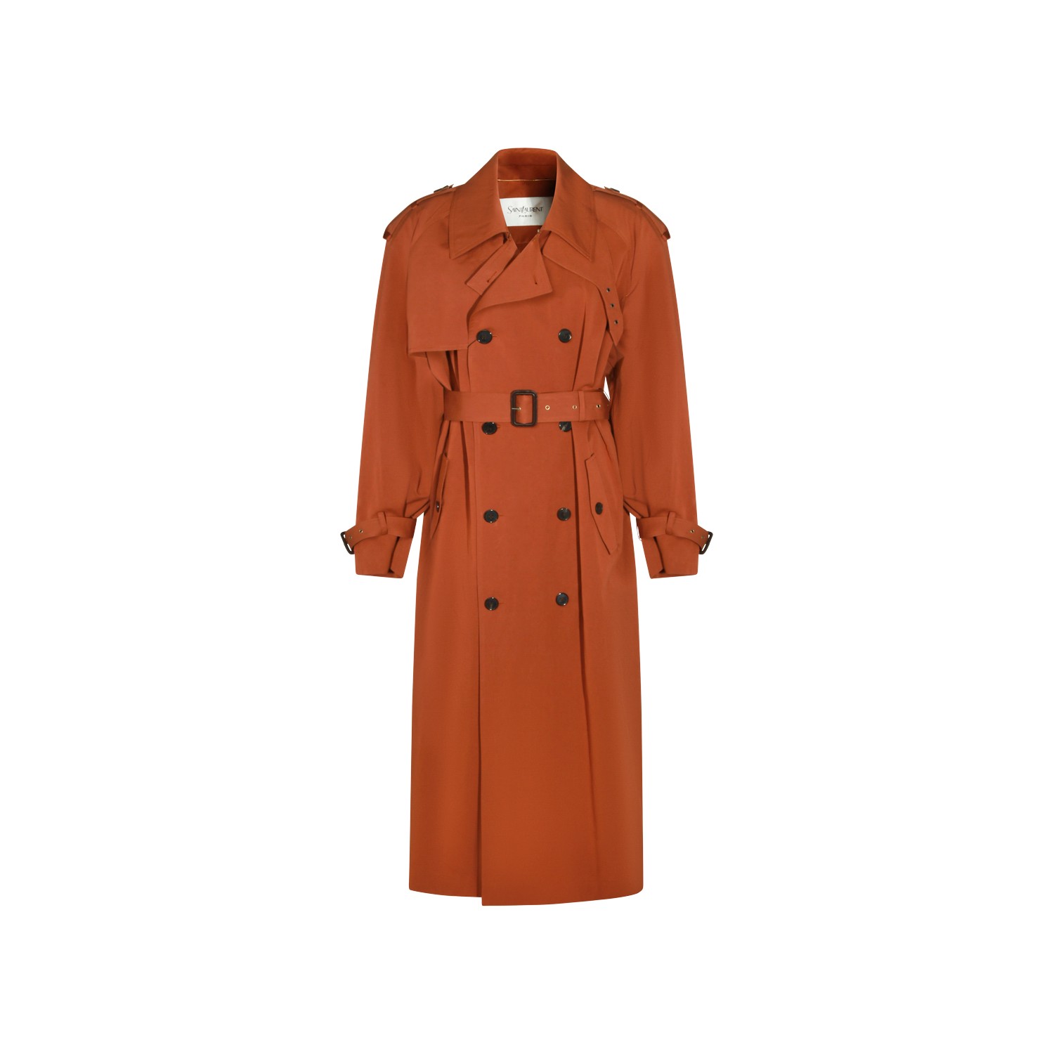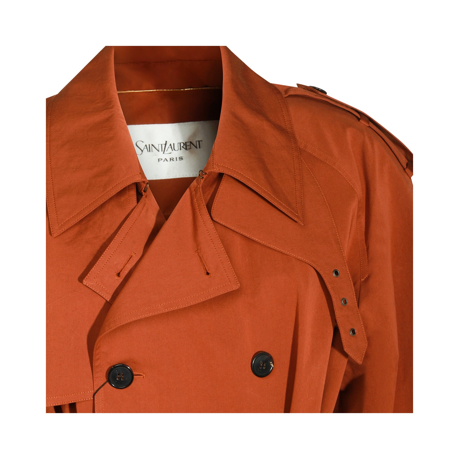 Mocha cotton trench coat from Saint Laurent featuring lapel collar, long sleeves, double breasted closure, matchy belt waist, buttoned welt pockets and long lenght.