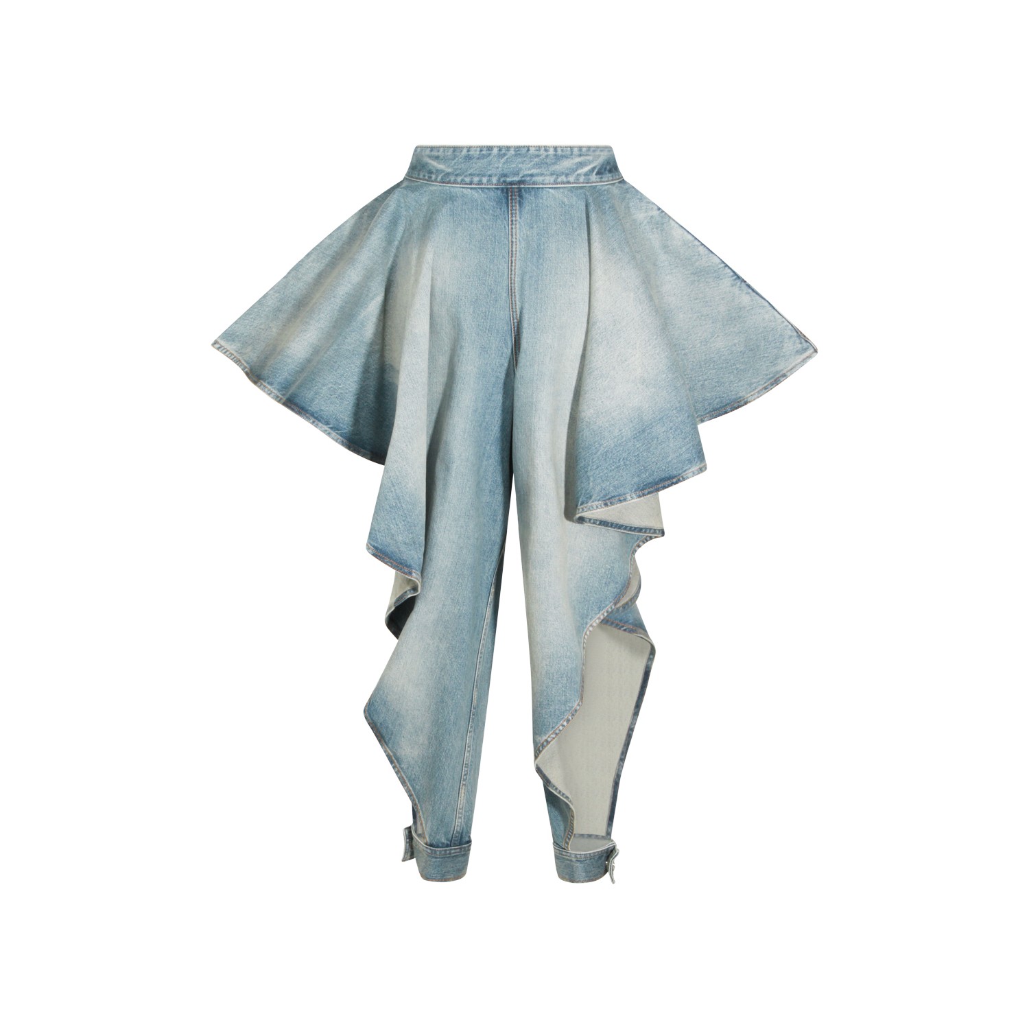 Faded blue panelled denim jeans from Alaia featuring used effect, high waist, button closure and panelled line.