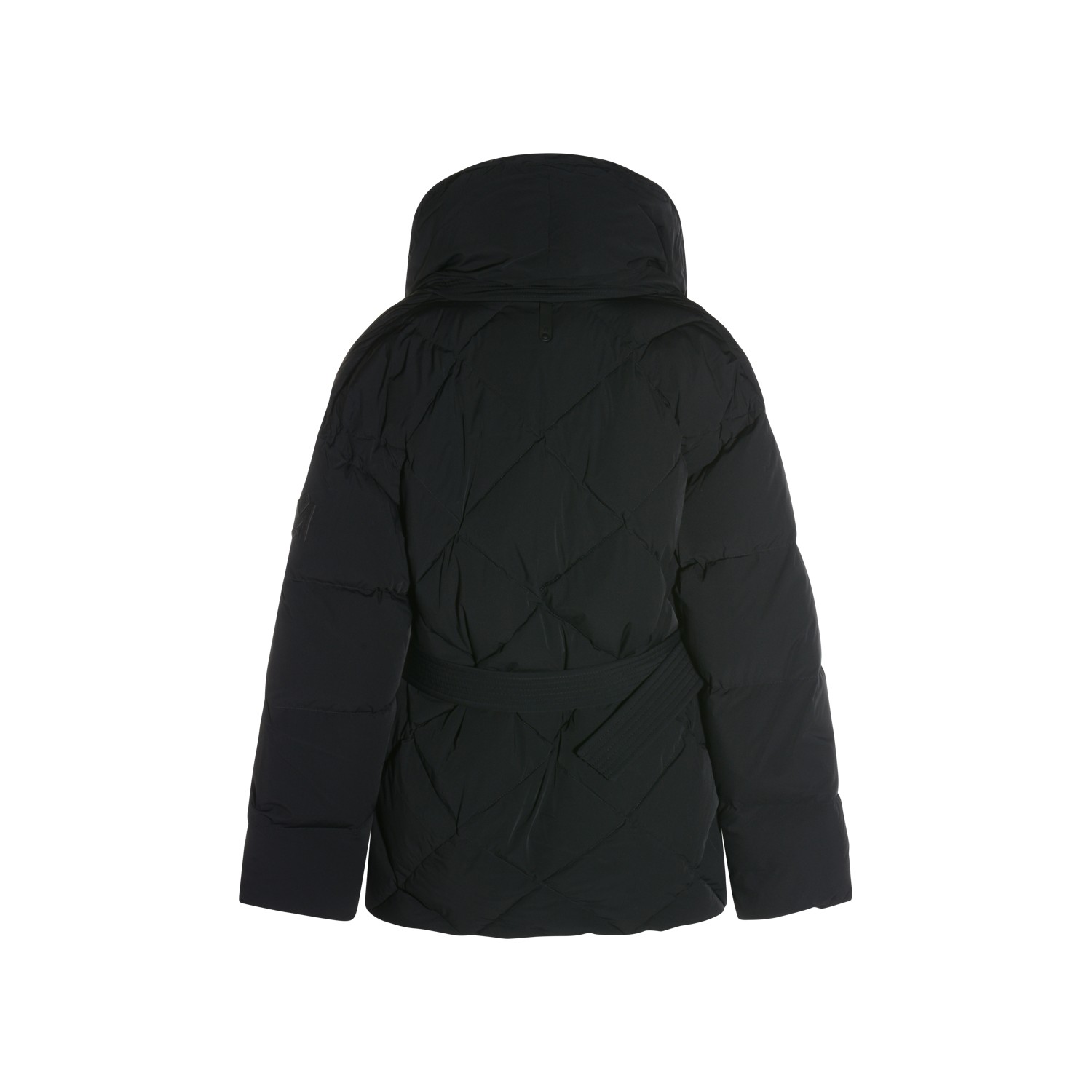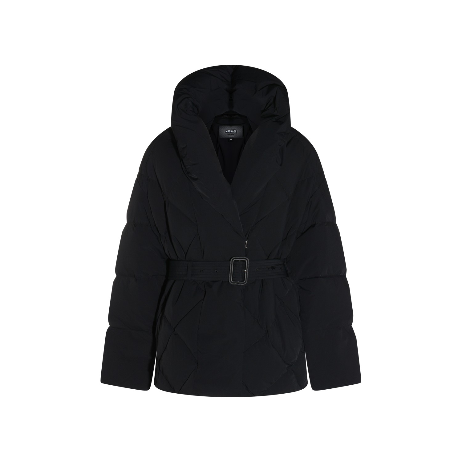 Black down jacket from Mackage featuring shawl collar, long sleeves, padded, belt waist, frontal closure, pockets and regular vestibility.