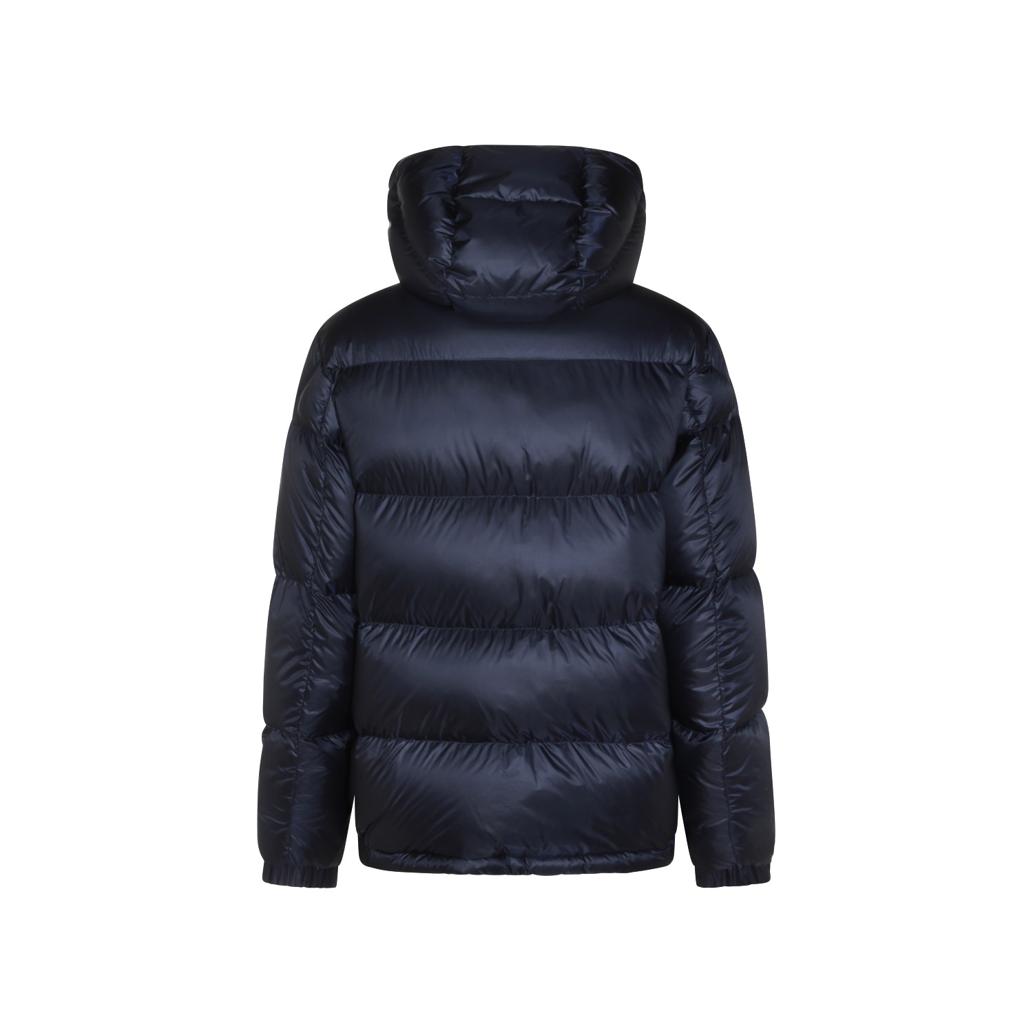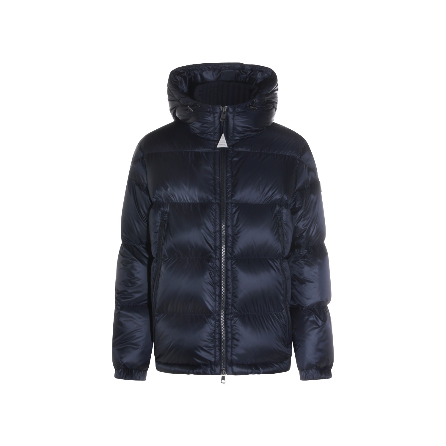 Navy Rivau down jacket from Moncler featuring high collar, hood, long sleeves, padded, zip fastening and regular vestibility.