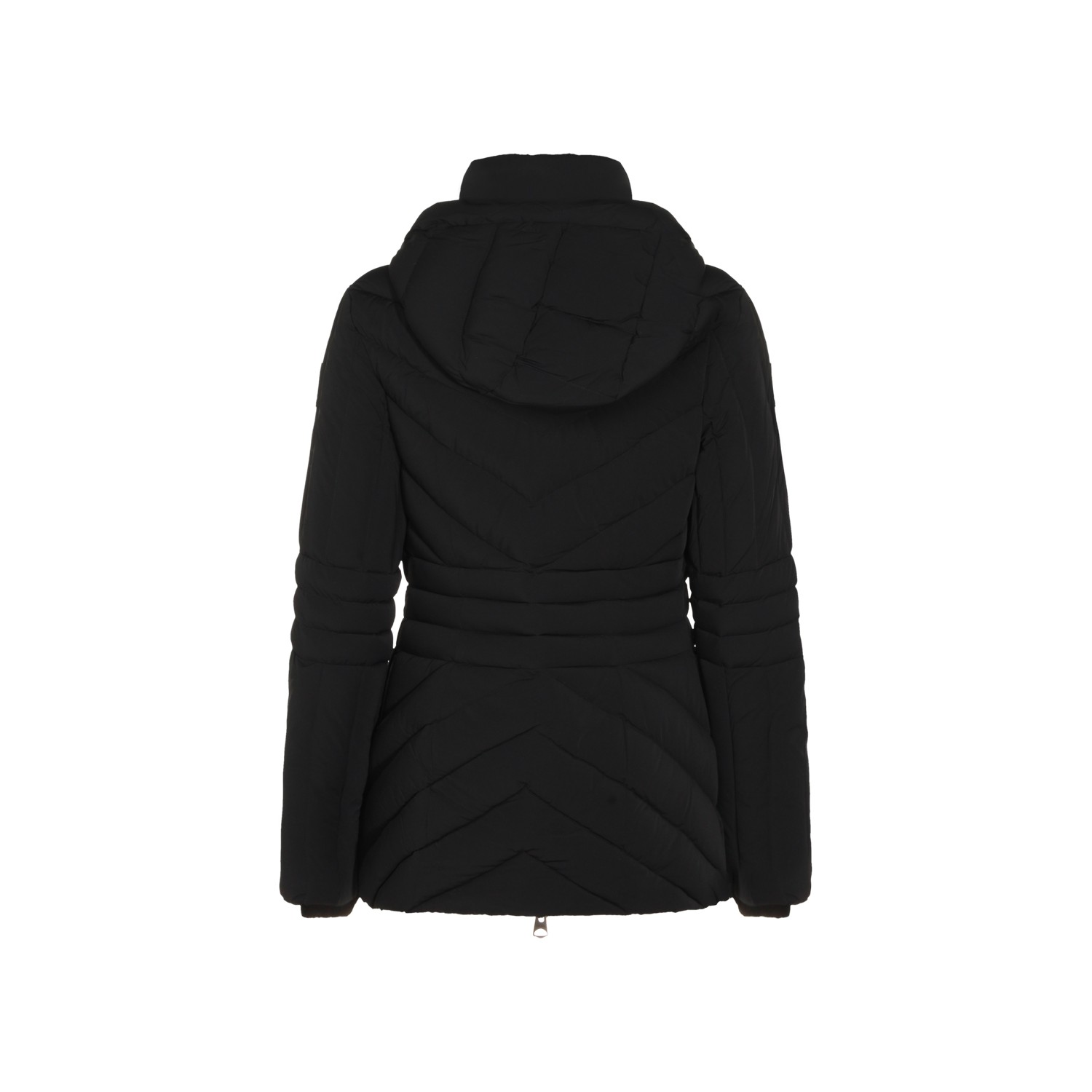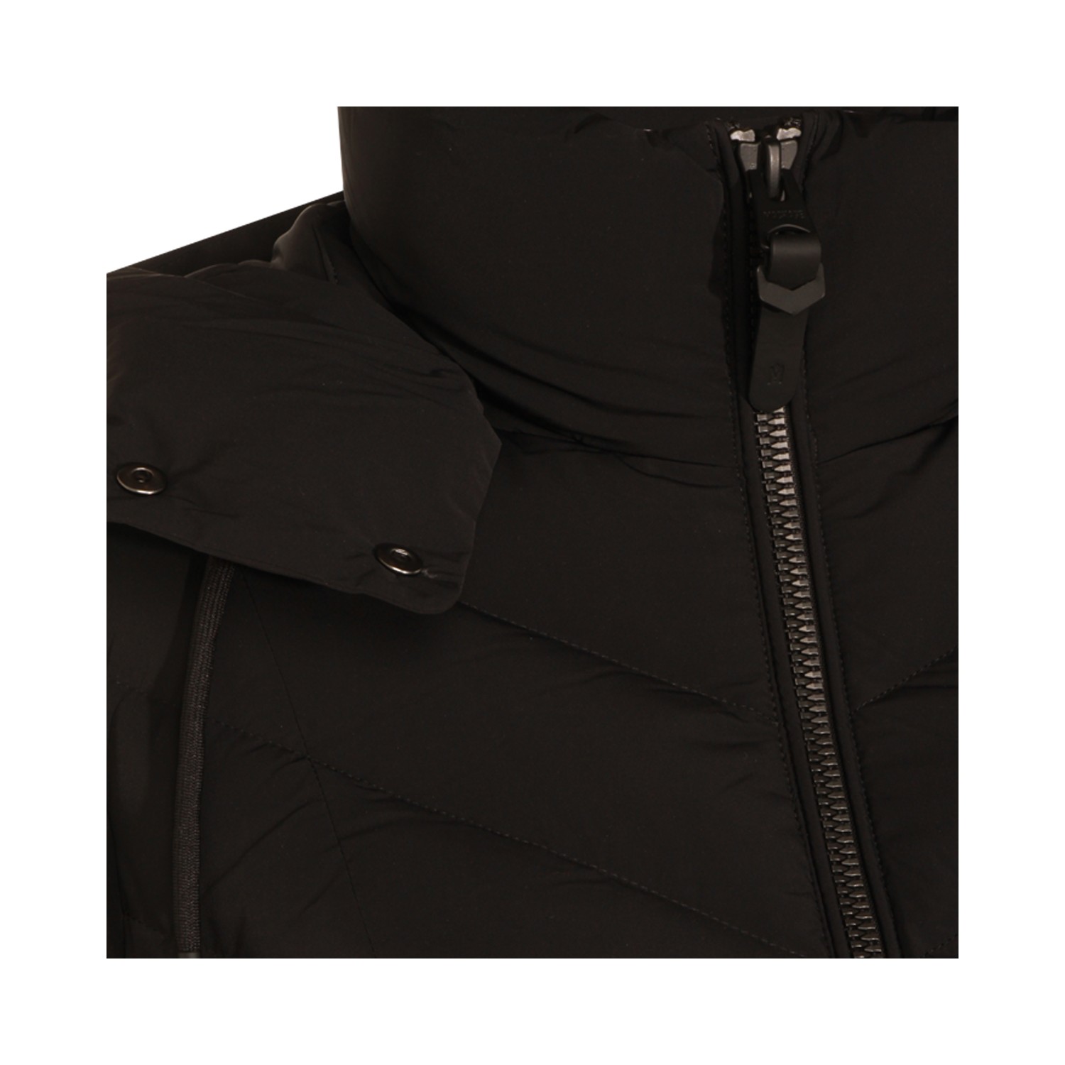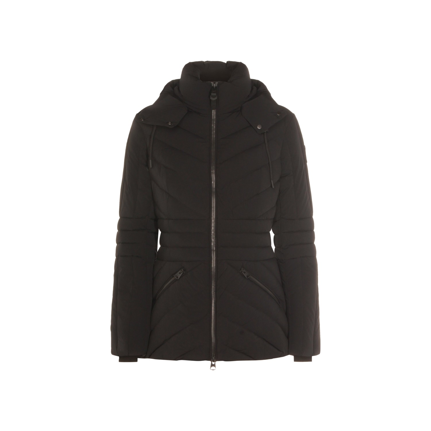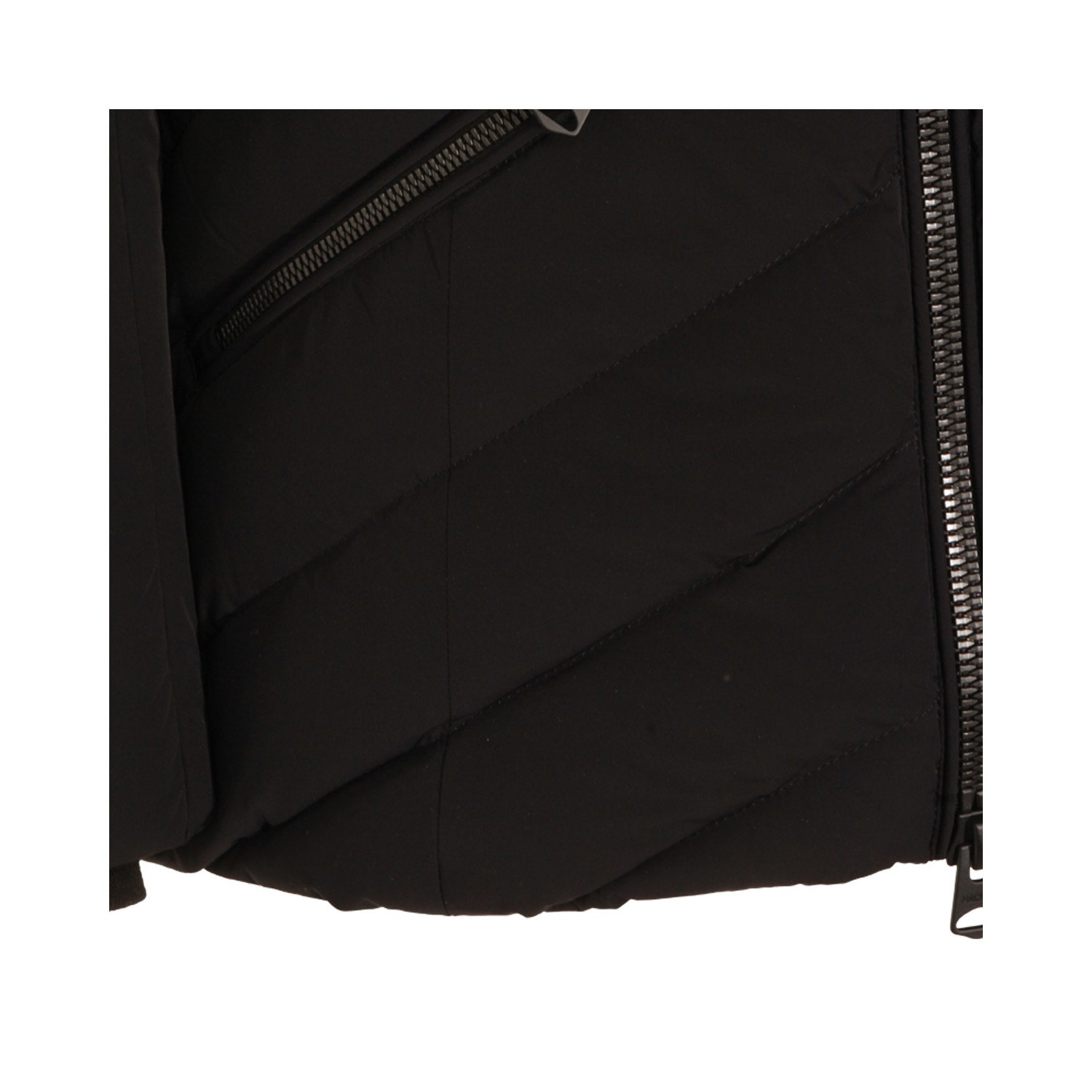 Black down jacket from Mackage featuring high collar, hood, long sleeves, zip fastening, padded and regular vestibility.