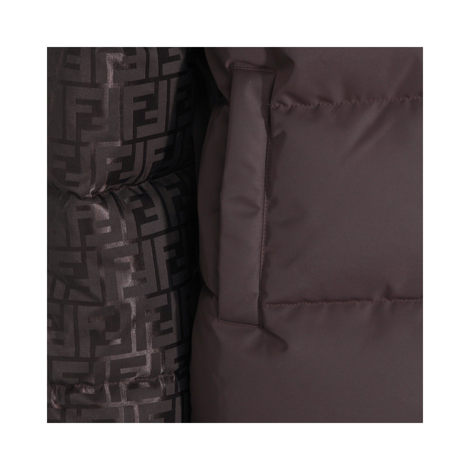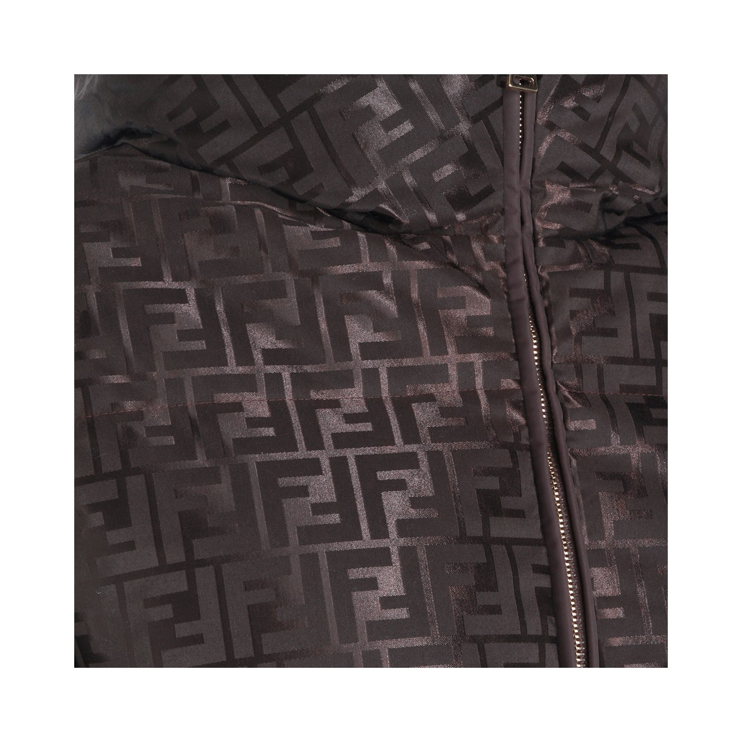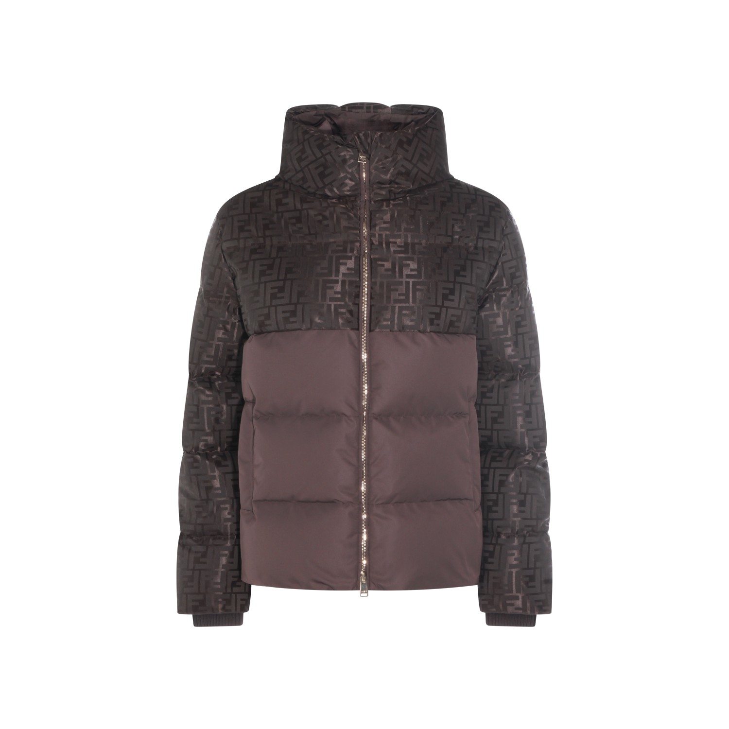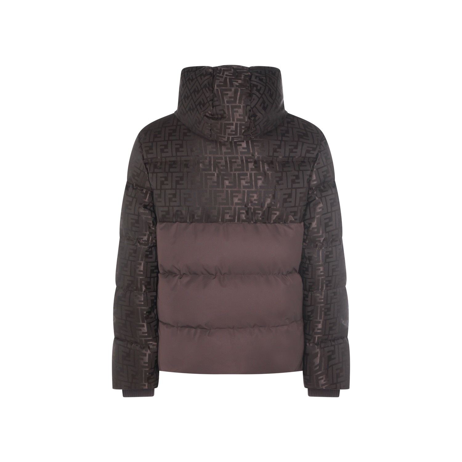 Brown down jacket from Fendi featuring high collar, hood, FF logo texture, long sleeves, padded, zip fastening and pockets.