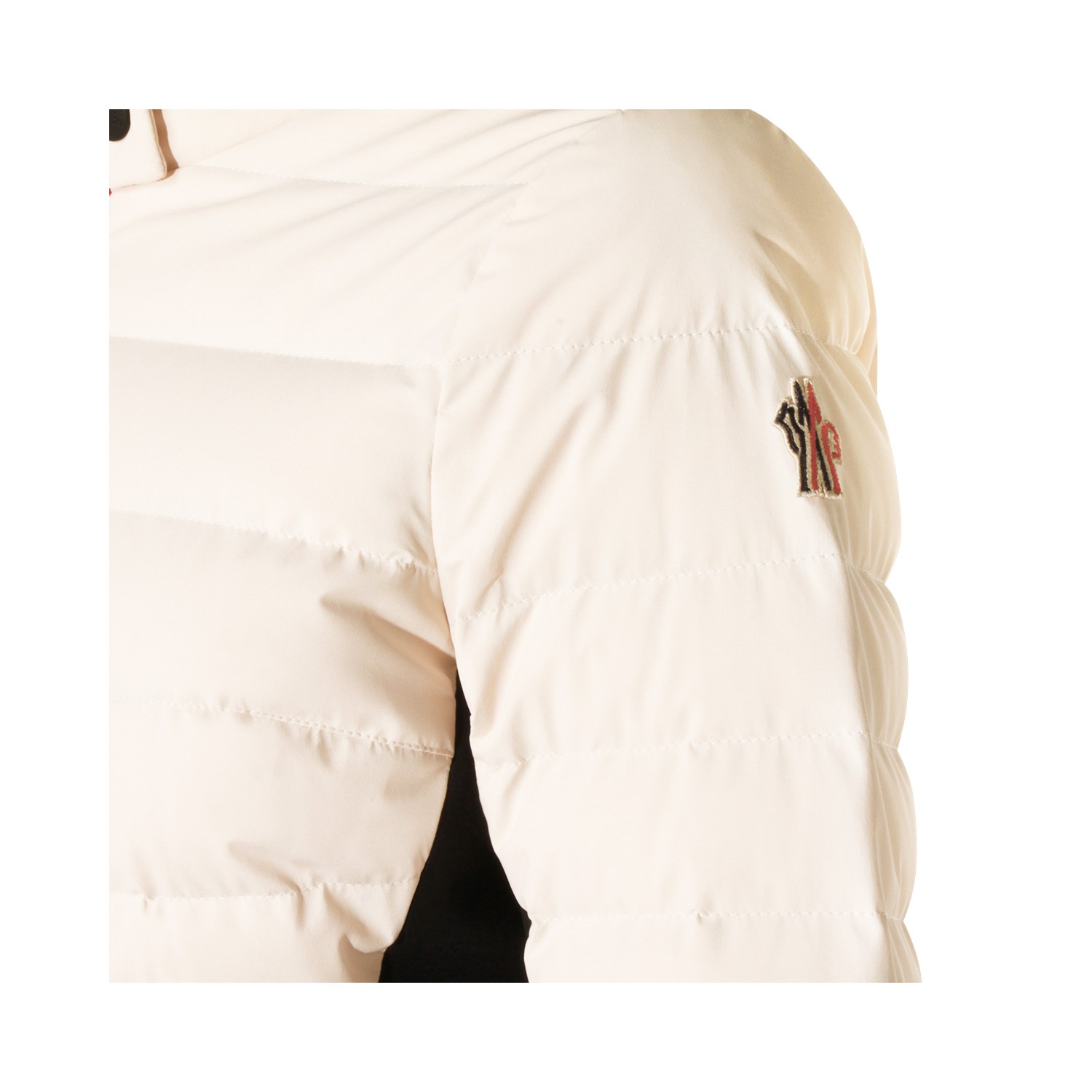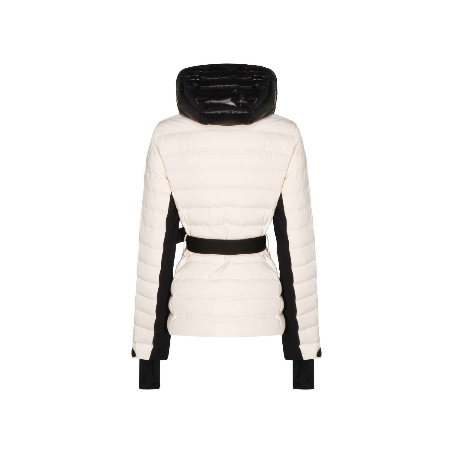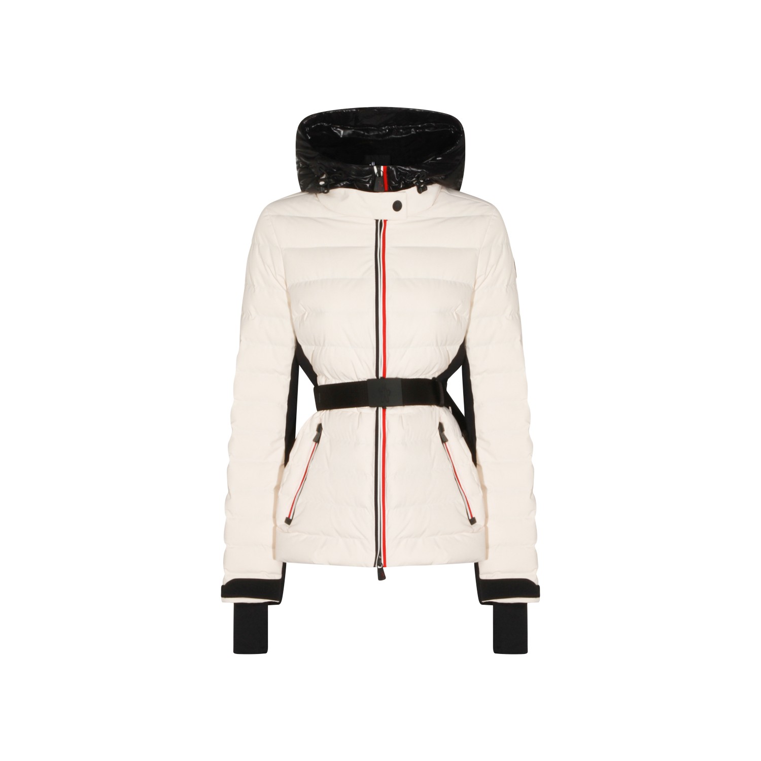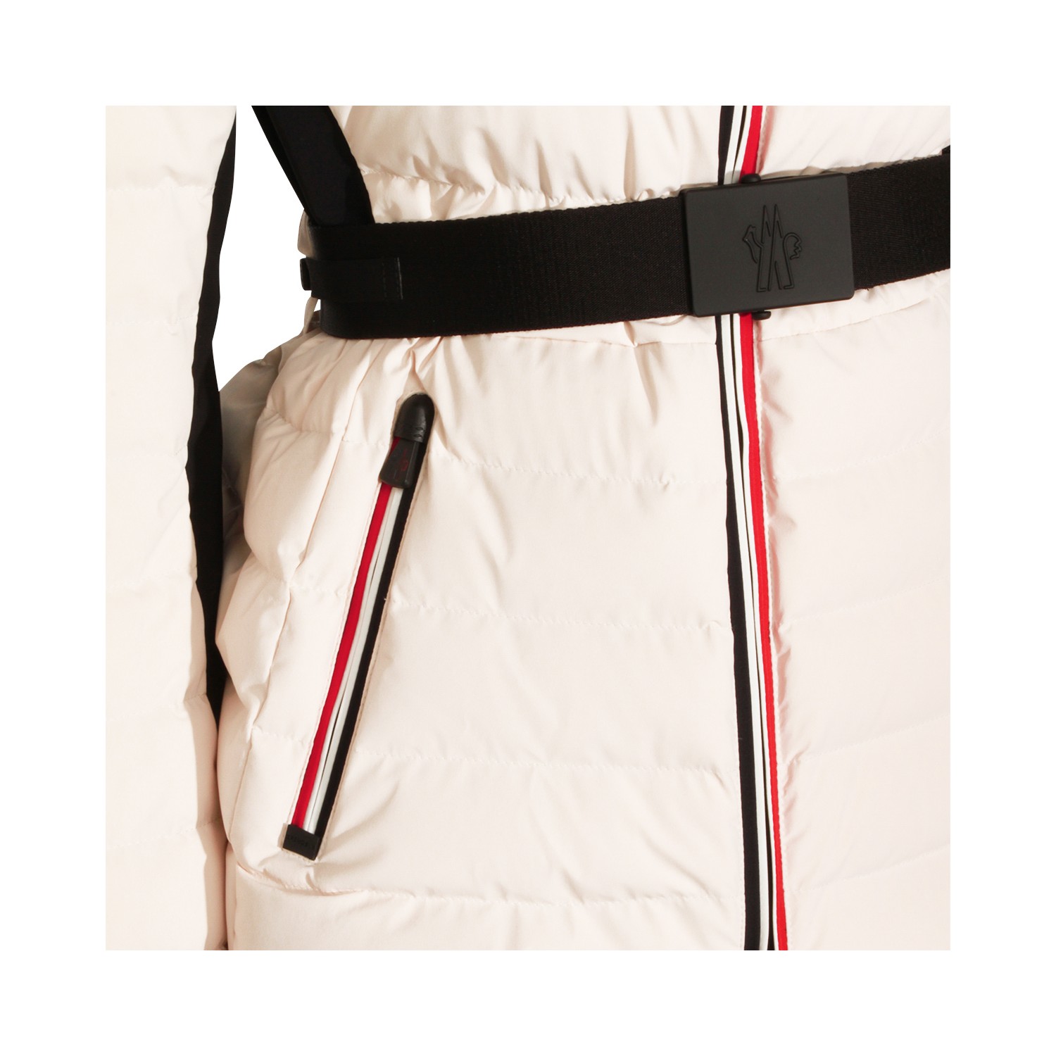 White down jacket from Moncler Grenoble featuring high collar, hood, long sleeves, padded, zip closure, belt waist, elasticated cuffs and pockets.