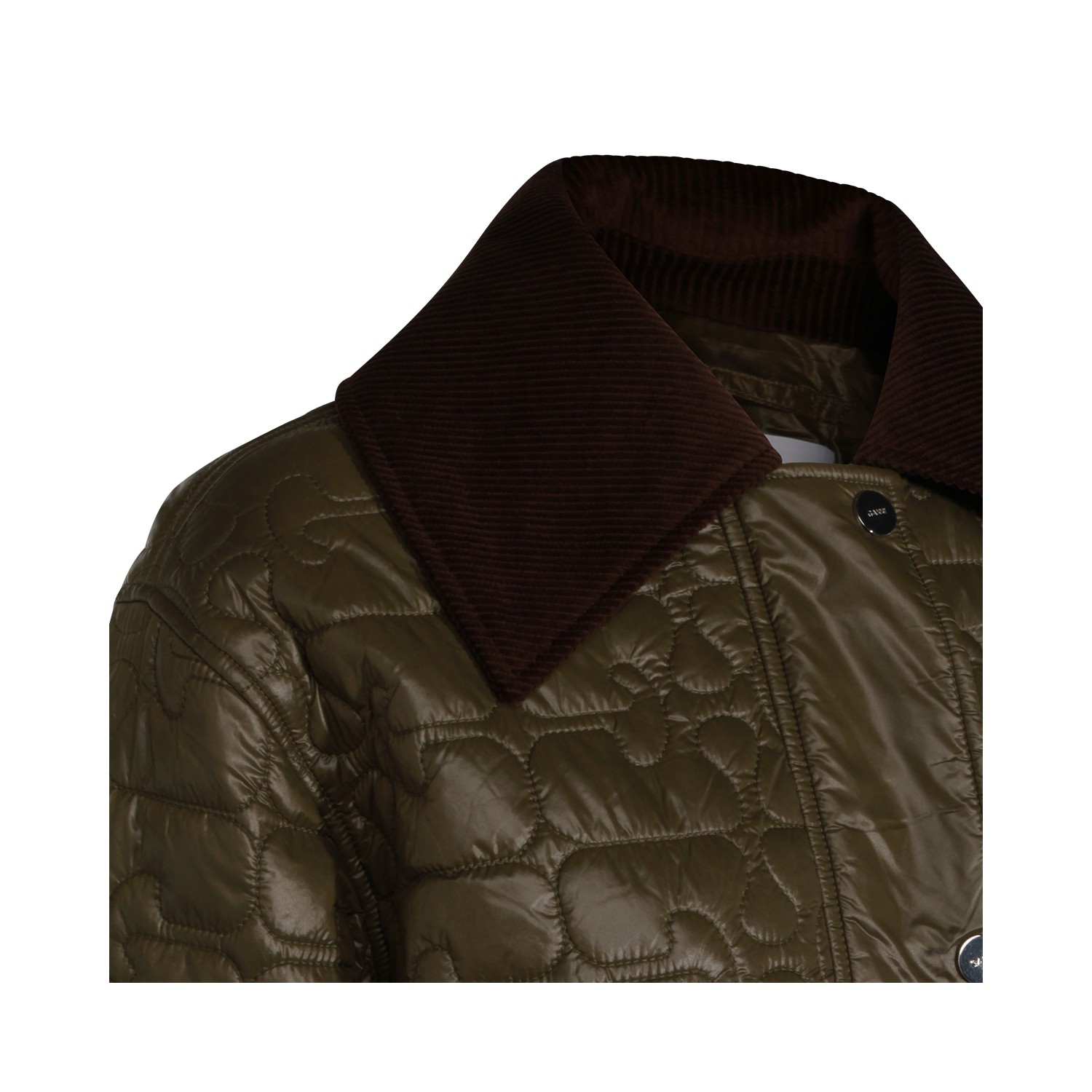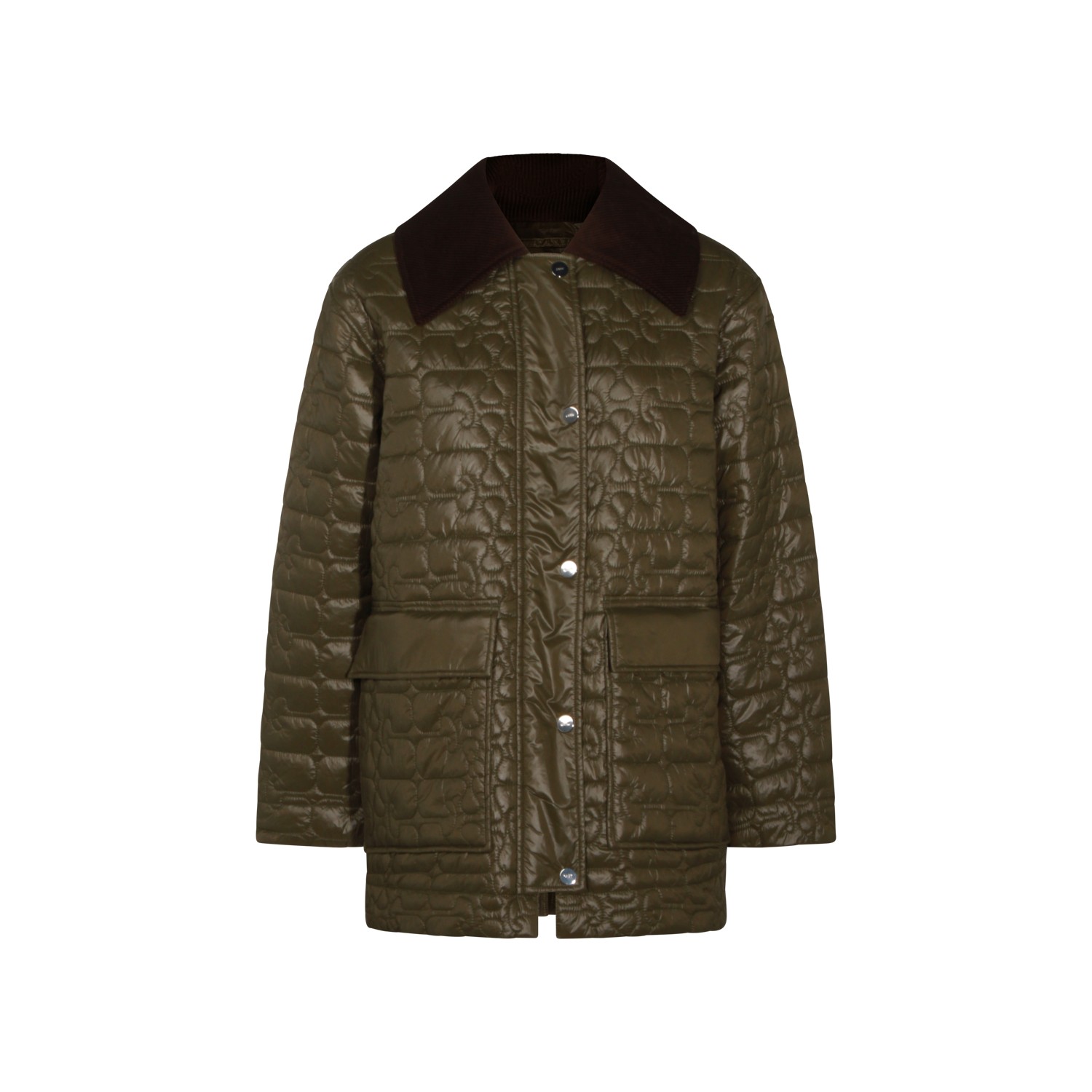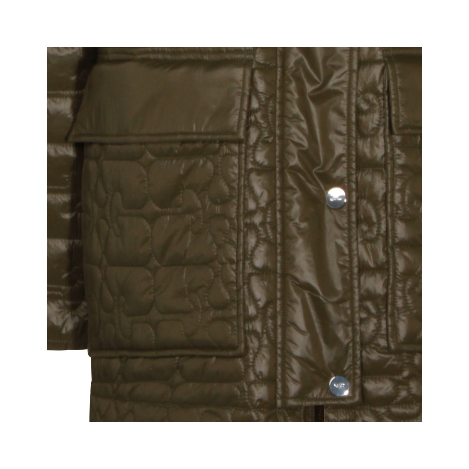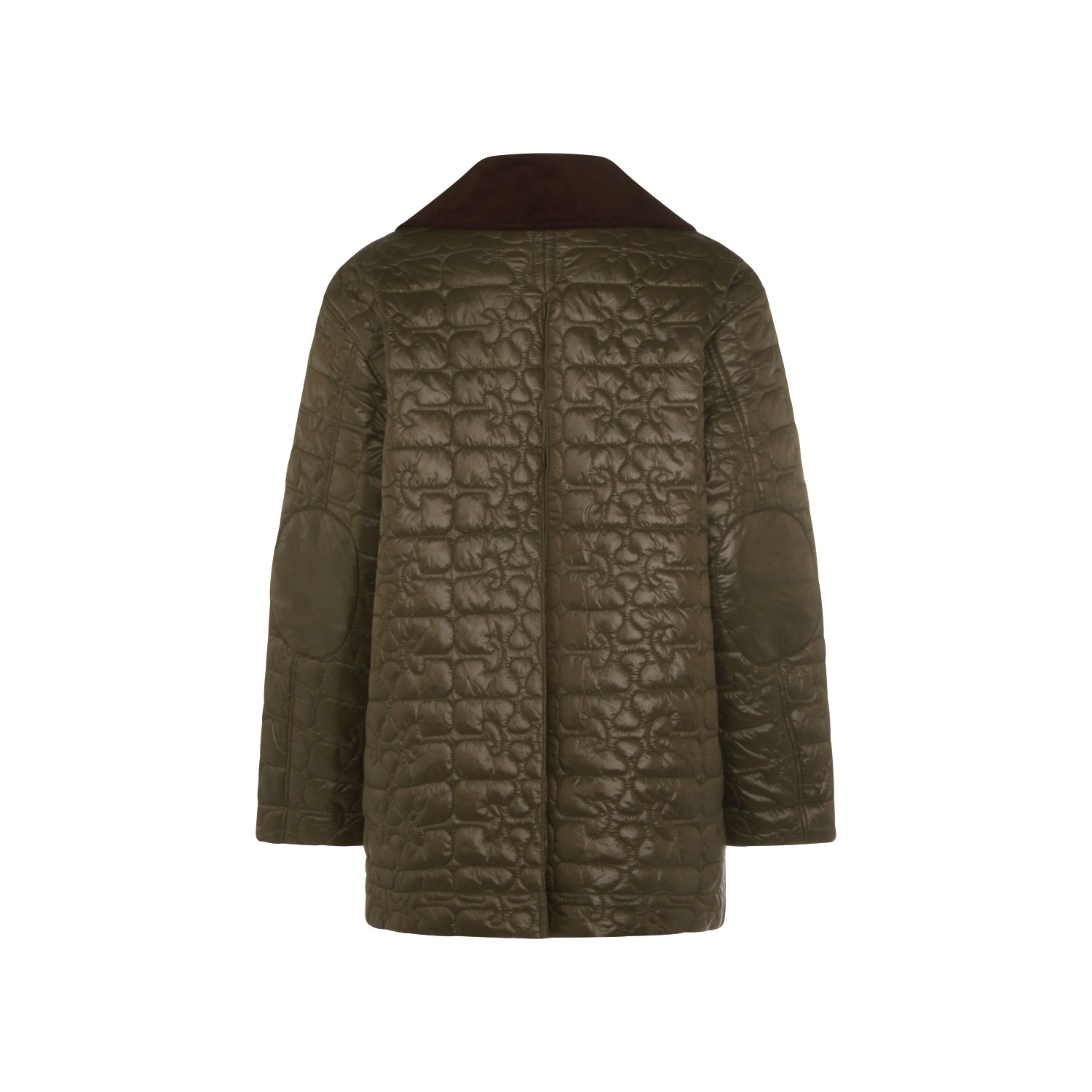 Olive green down jacket from Ganni featuring contrasting neck, long sleeves, buttons fastening, padded, frontal pockets and midi length.