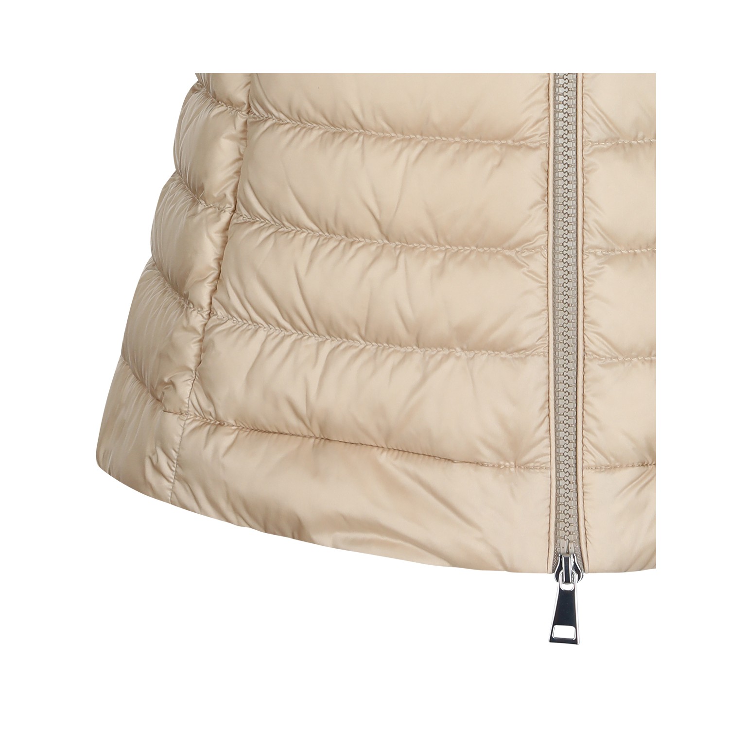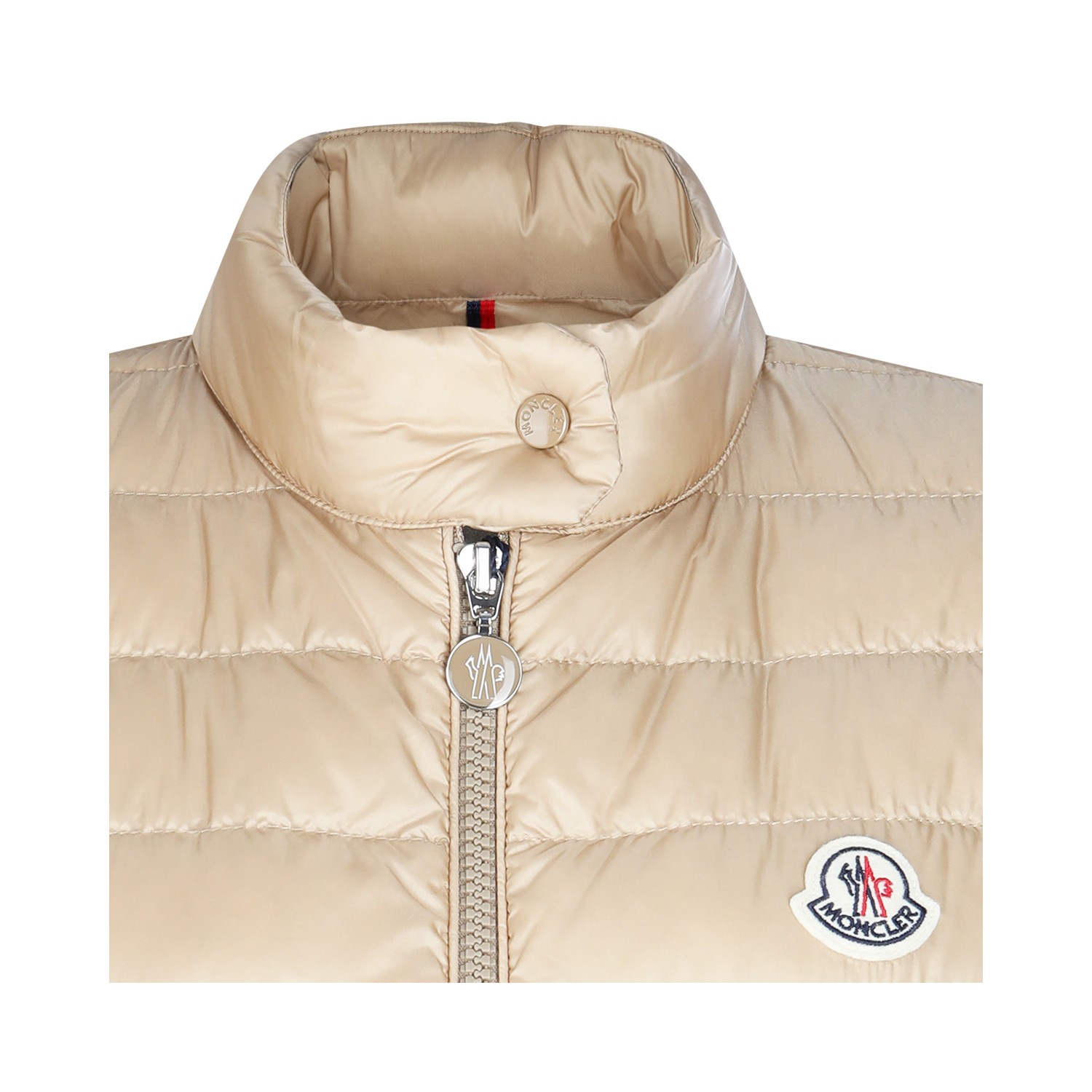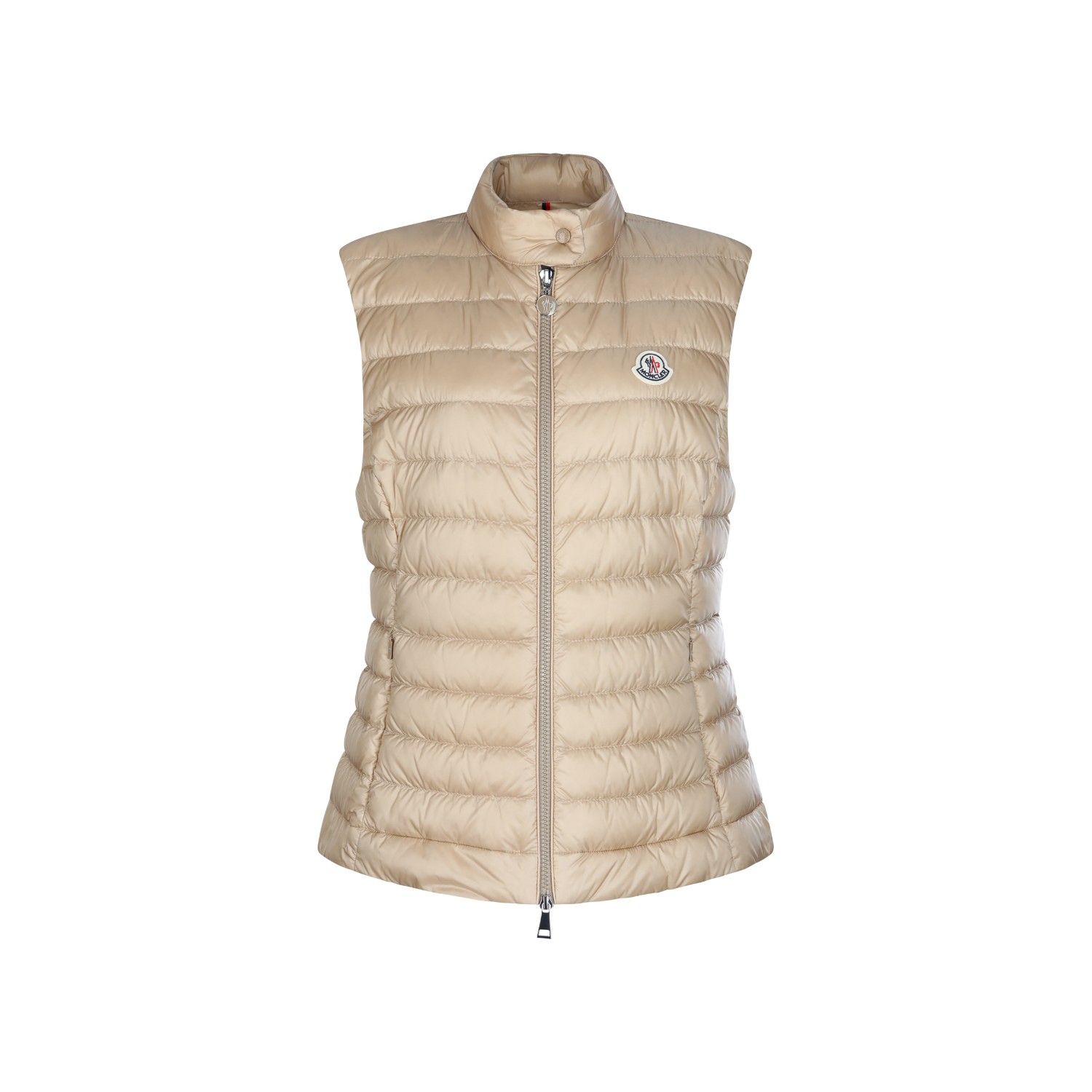 Beige down jacket from Moncler featuring high neck, sleeveless, zip fastening, pockets, padded, frontal logo and regular vestibility.