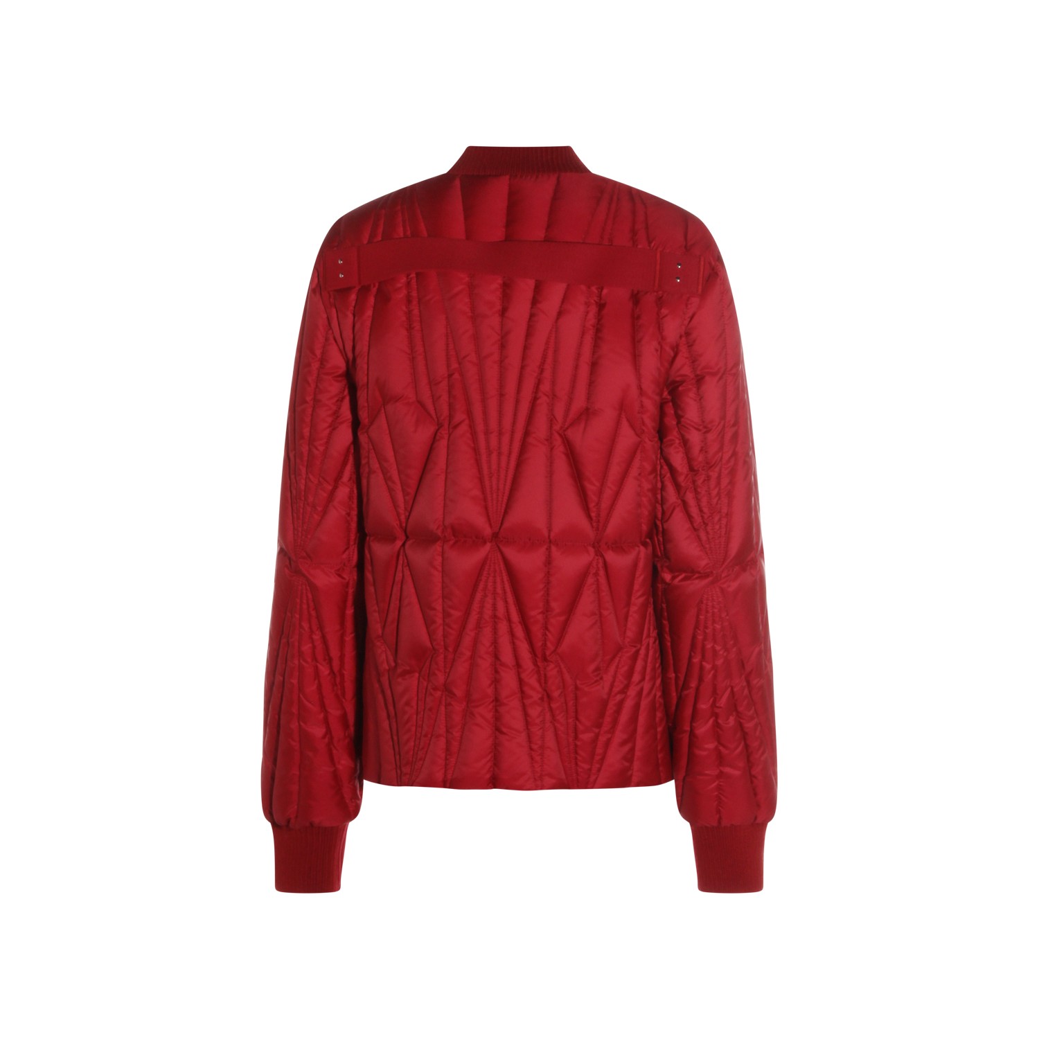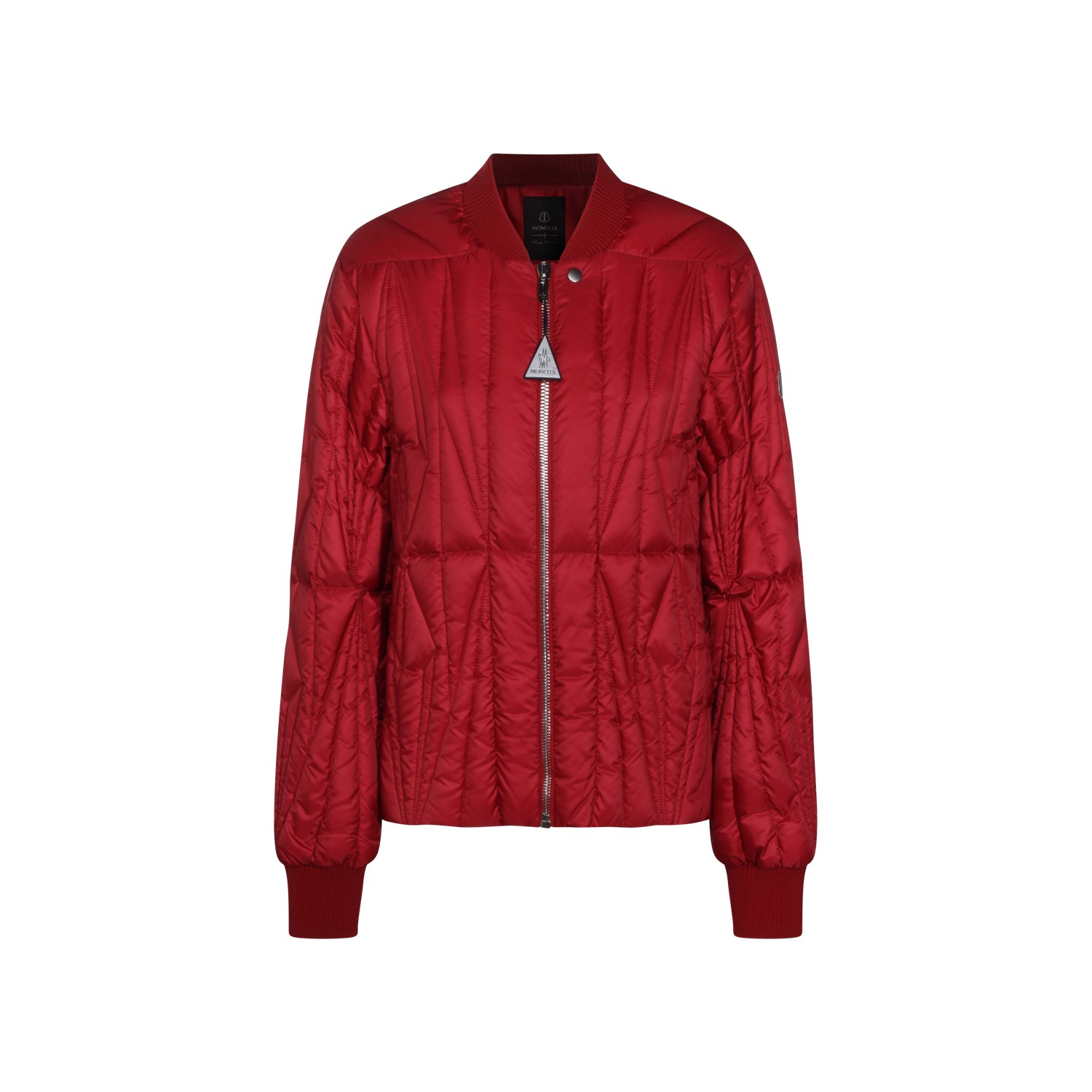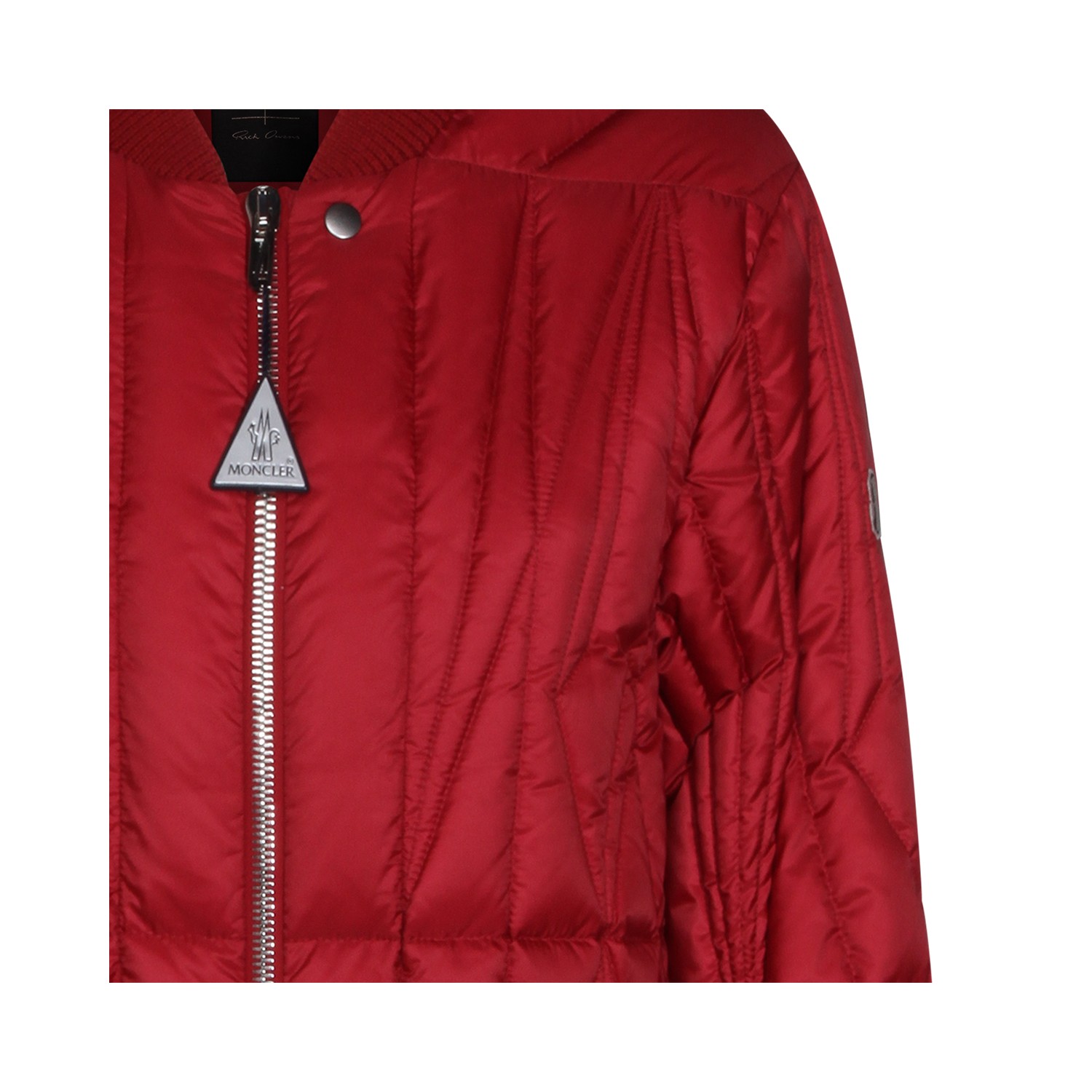 Red Geocamo Flight down jacket from Moncler + Rick Owens featuring bomber collar, zip and snap button closure, long sleeves, welt pockets with snap' button, internal zip pockets, back ribbon, wool blend knit finishes, padded and slim fit.