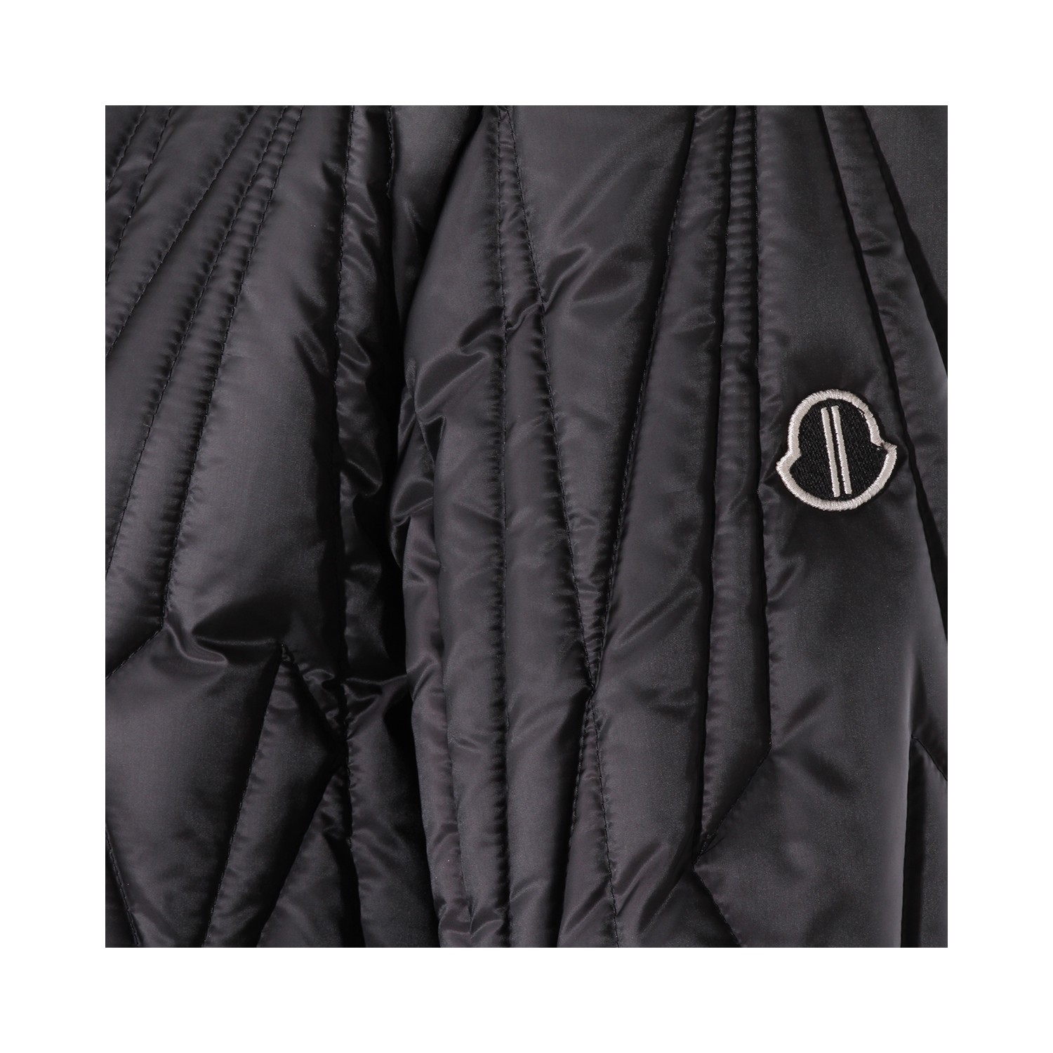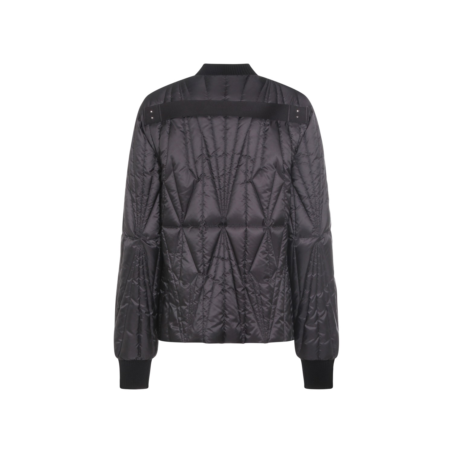 Black Geocamo Flight down jacket from Moncler + Rick Owens featuring bomber collar, zip and snap button closure, long sleeves, welt pockets with snap' button, internal zip pockets, back ribbon, wool blend knit finishes, padded and slim fit.