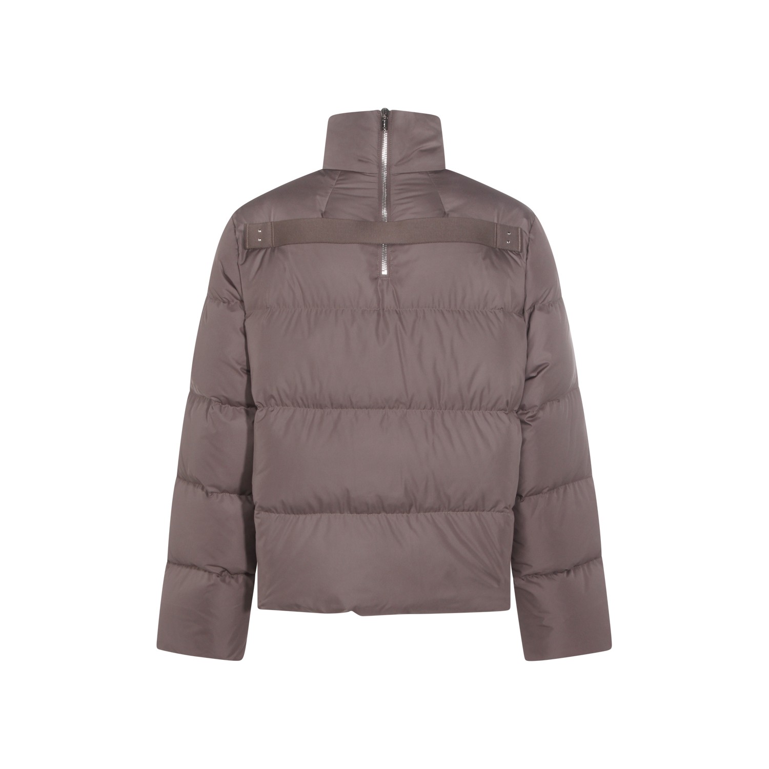 Dark grey Cyclopic down jacket from Moncler + Rick Owens featuring raised collar with zip fastening on the back, zip closure, long sleeves, welt pockets with snap button, internal zipo pockkets, ribbon on the back, embroidered logo patch, wool blend knit finishes, padded and oversized fit.