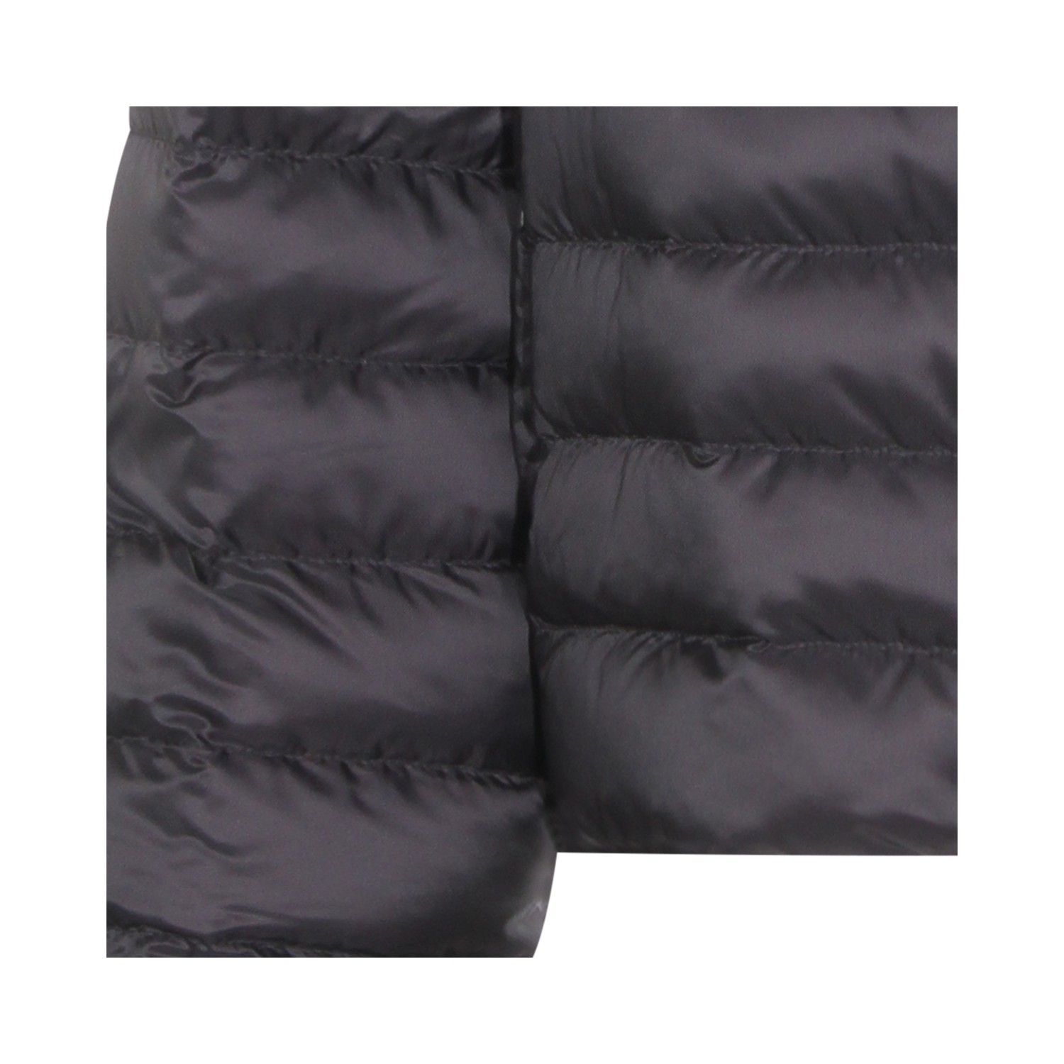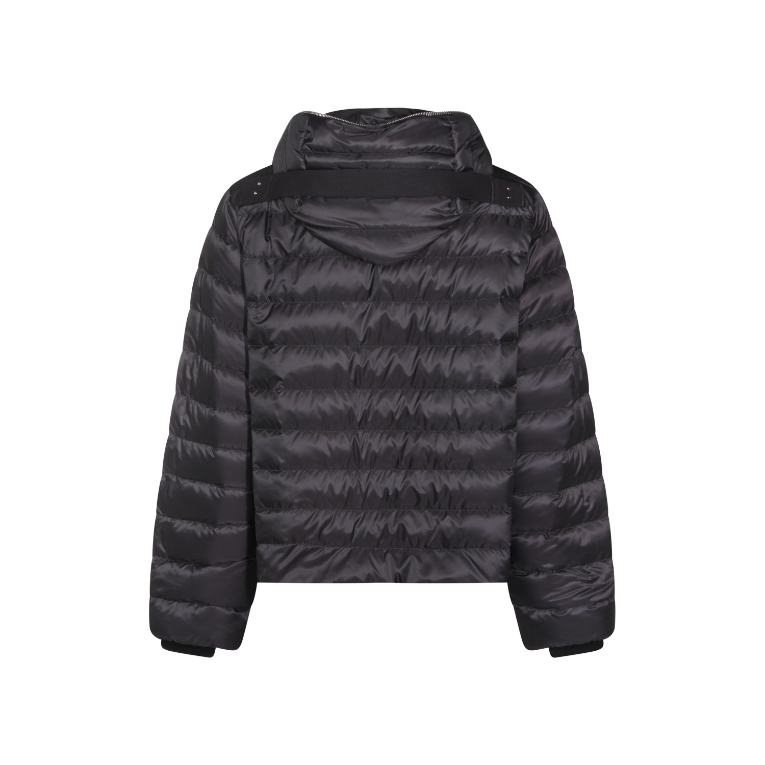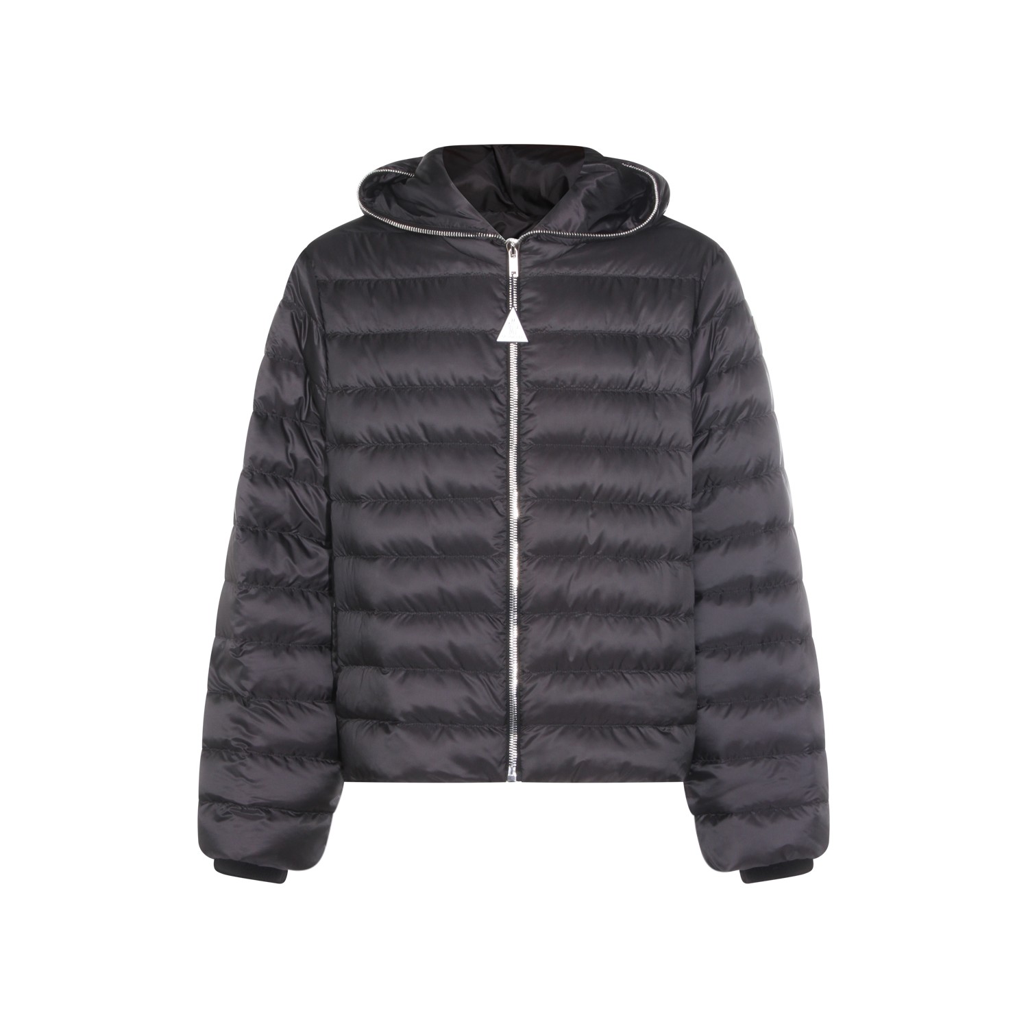 Black Ziplock down jacket from Moncler + Rick Owens featuring hood, zip closure, snap button pockets, ribbon on the back, embroidered logo patch, wool blend knit finishes, padded and loose fit.