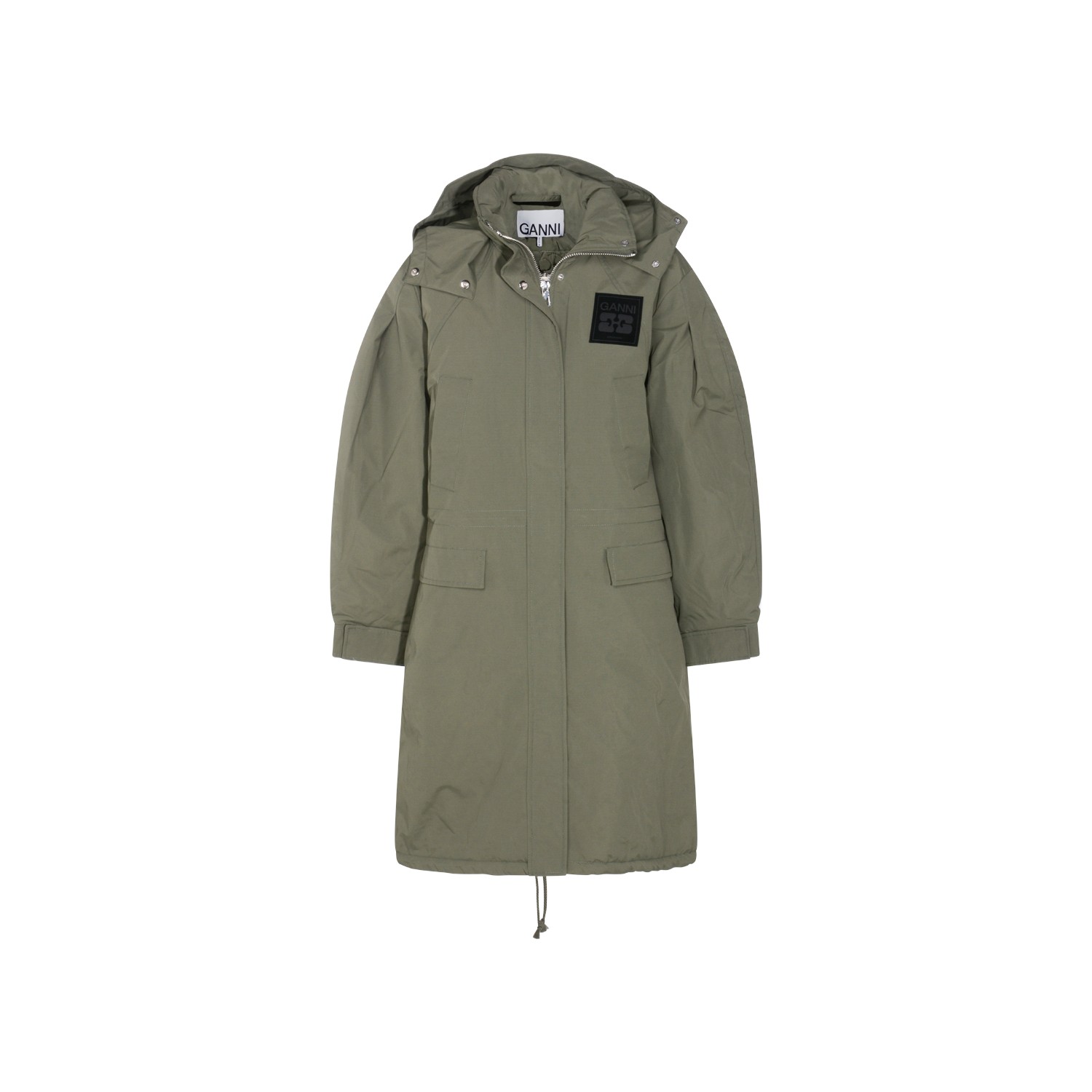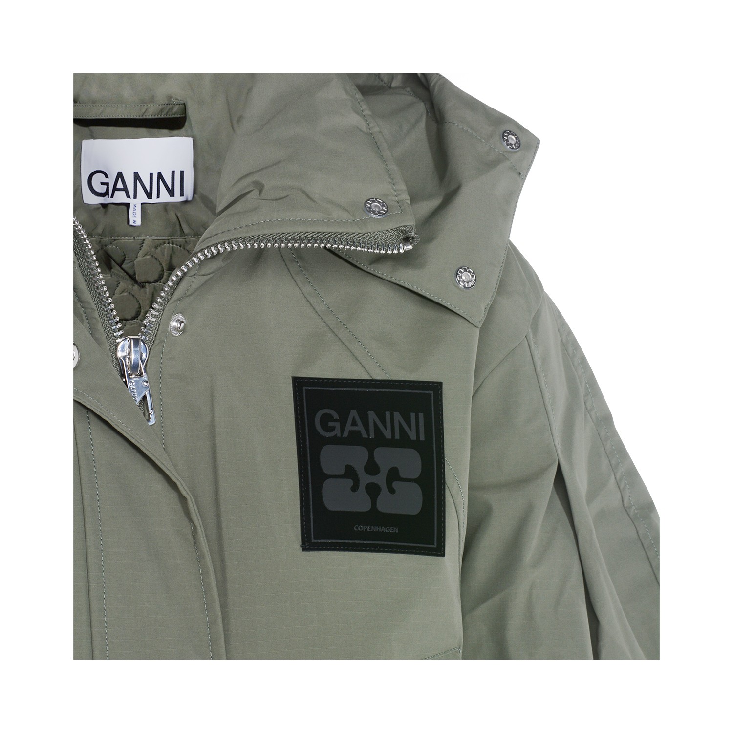 Green down jacket from Ganni featuring long sleeves, high collar, hood, logo patch and regular vestibility.