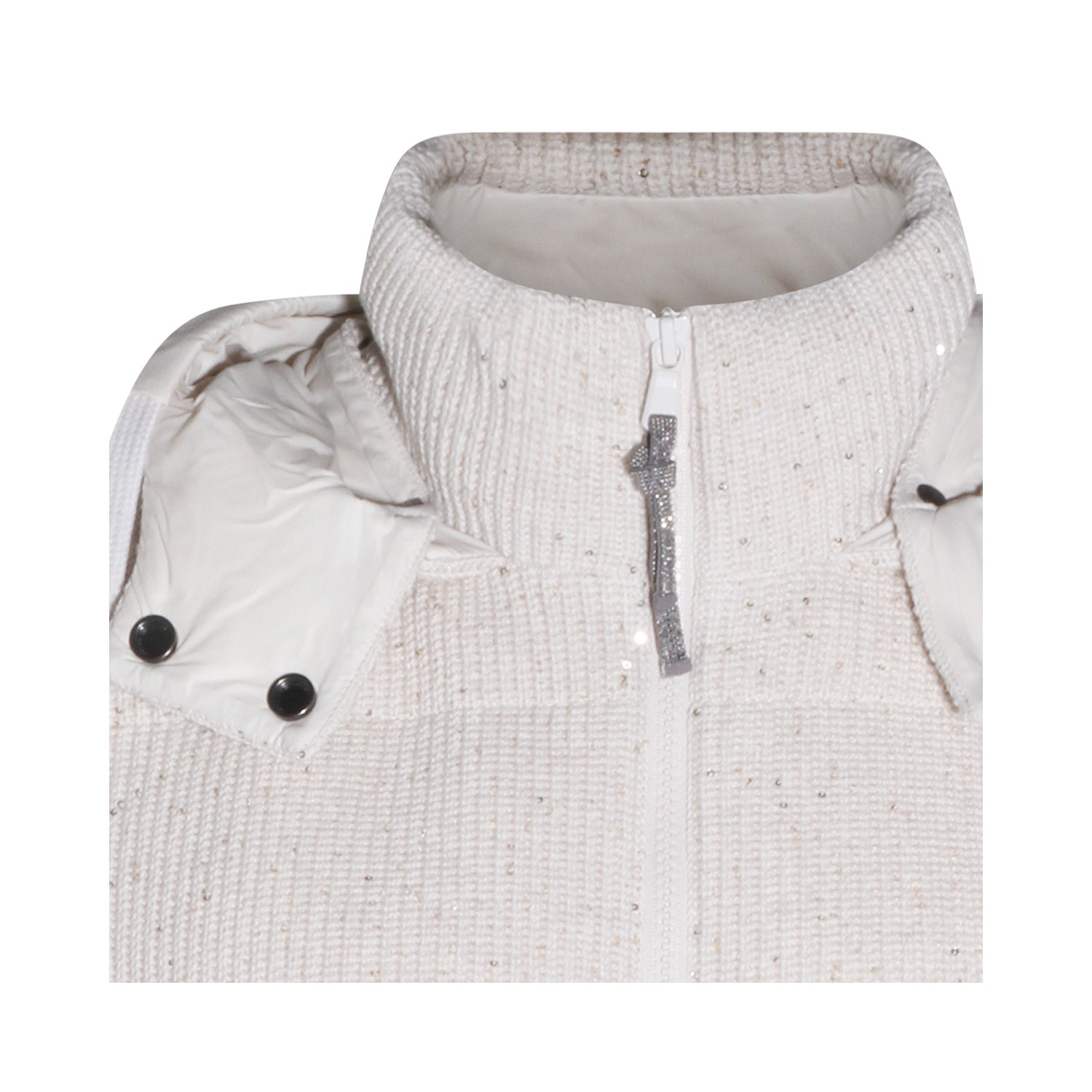 Beige cotton down jacket from Brunello Cucinelli featuring high collar, removable hood, sleeveless, padded, zip fastening, pockets and regular vestibility.