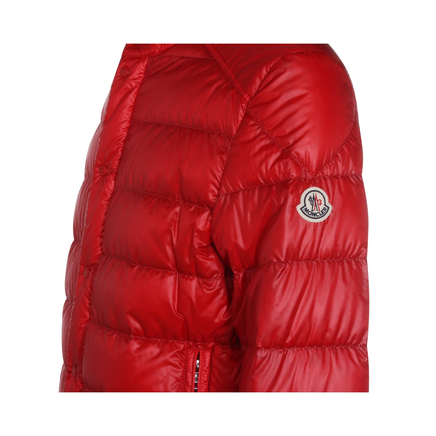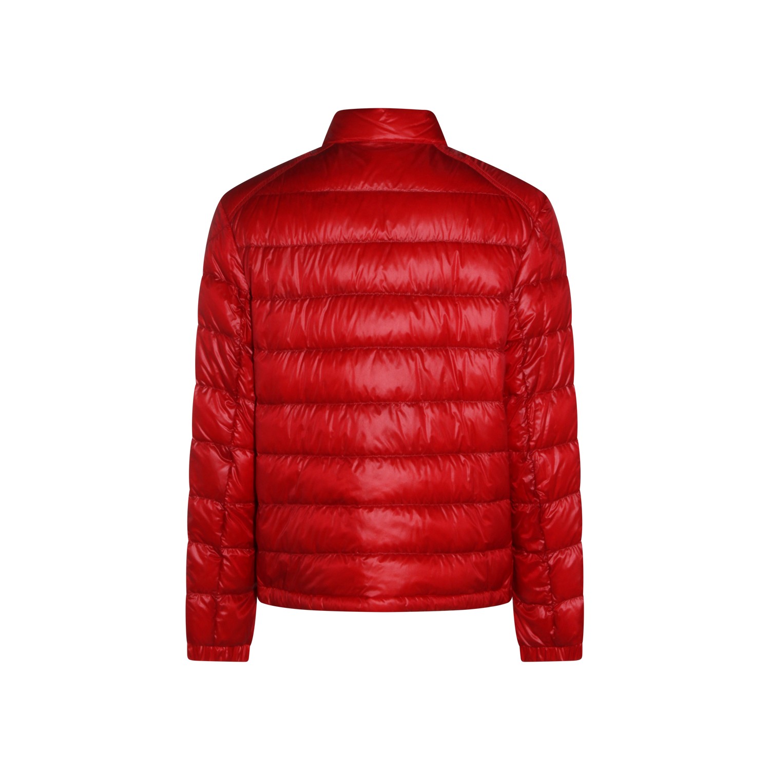 Red down jacket from Moncler featuring long sleeves, buttons fastening, pockets, logo patch and regular vestibility.