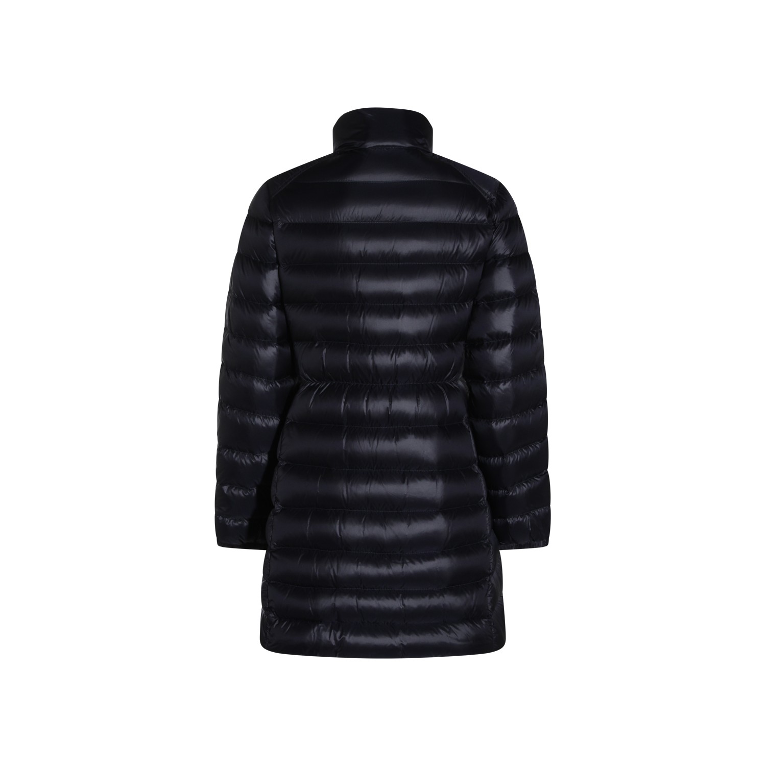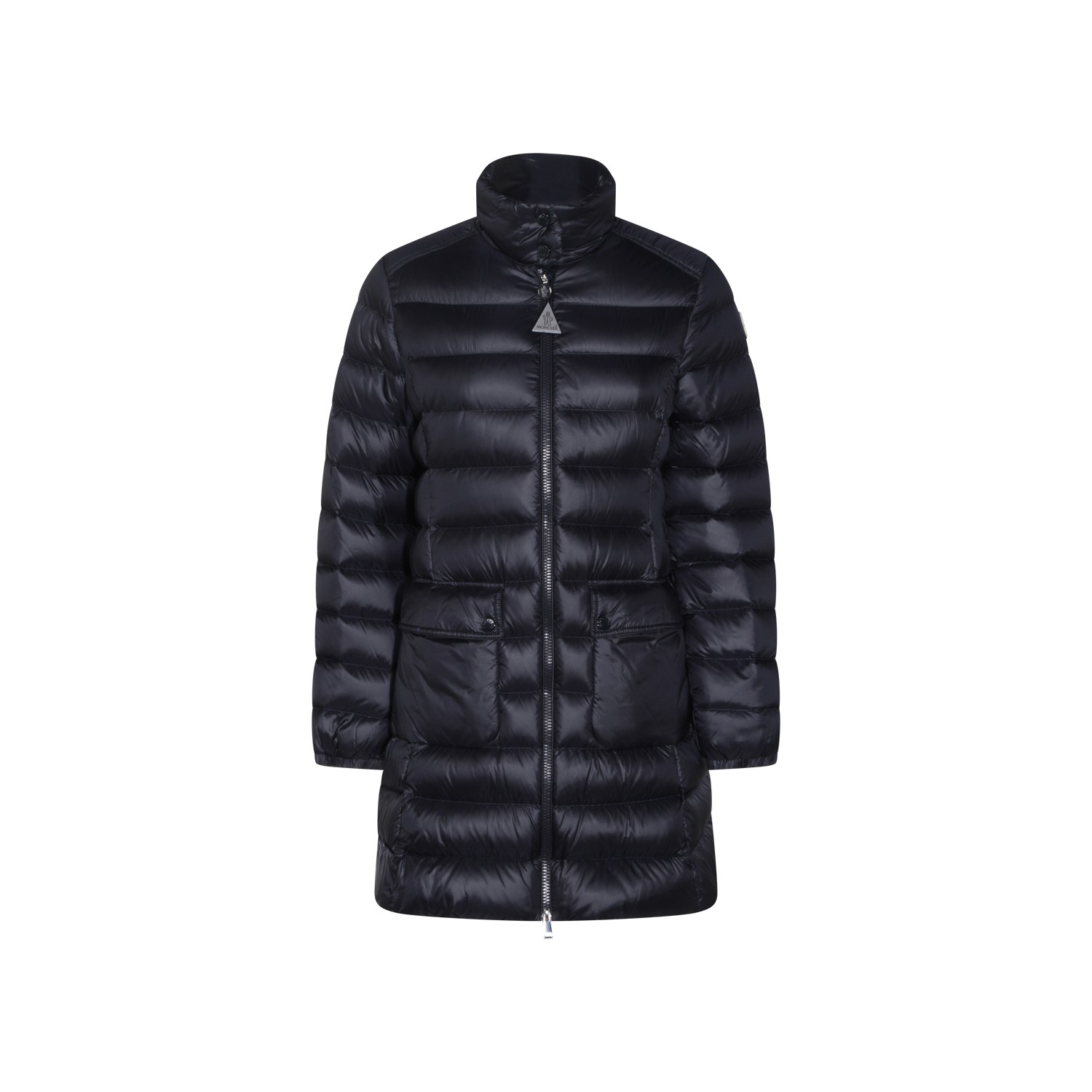 Navy down jacket from Moncler featuring high collar, long sleeves, quilted, padded, zip fastening, pockets and midi lenght.