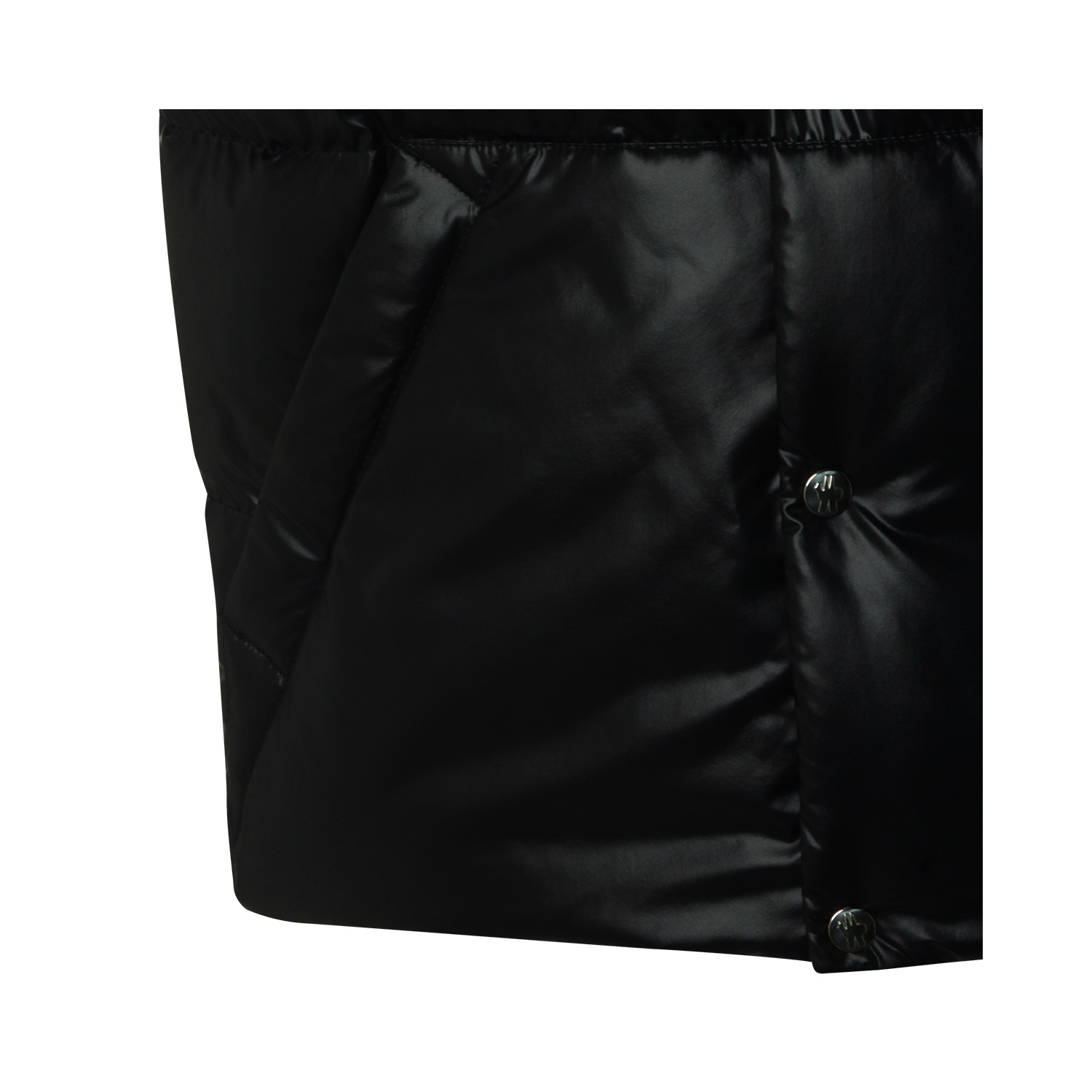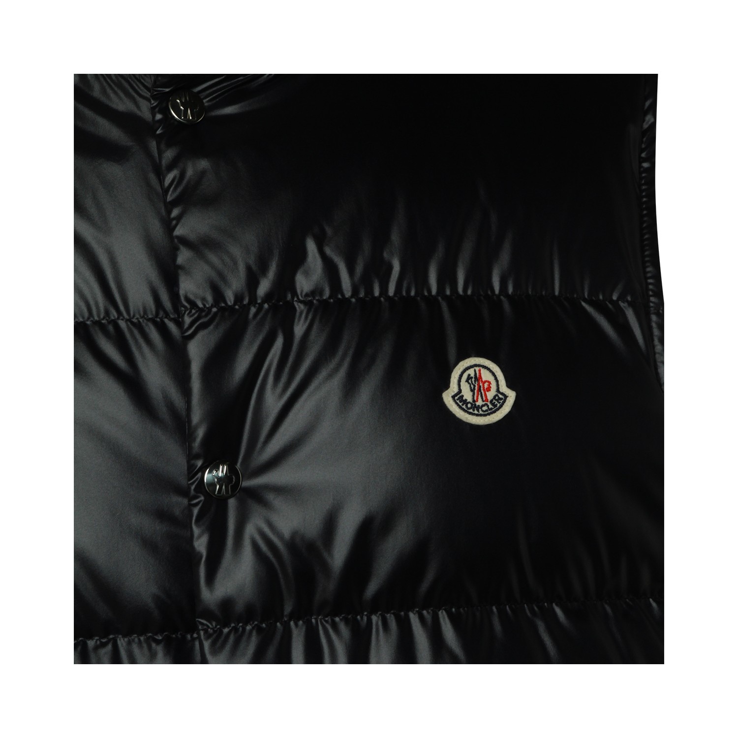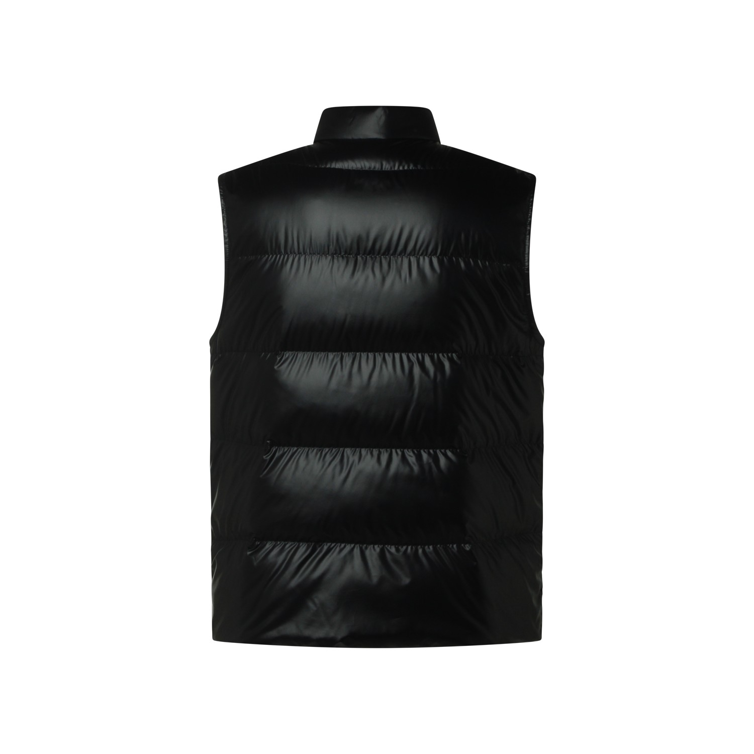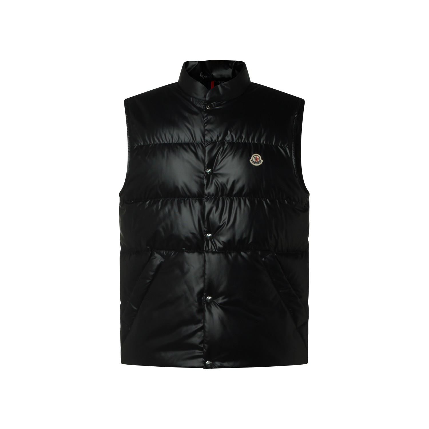 Navy Restigo down jacket from Moncler featuring vest line, magnetic button closure, high neck, regular fit, logo patch at chest and side pockets.