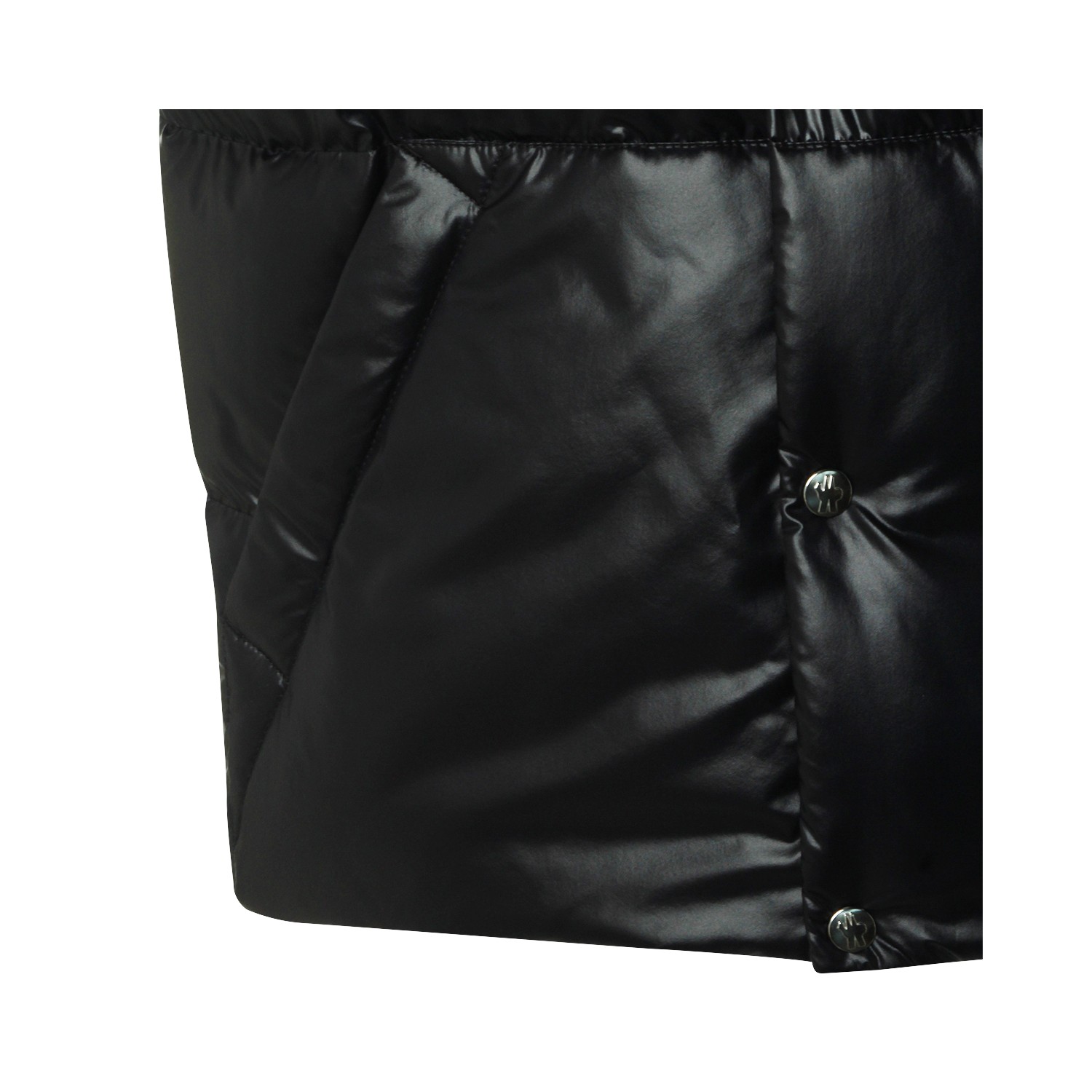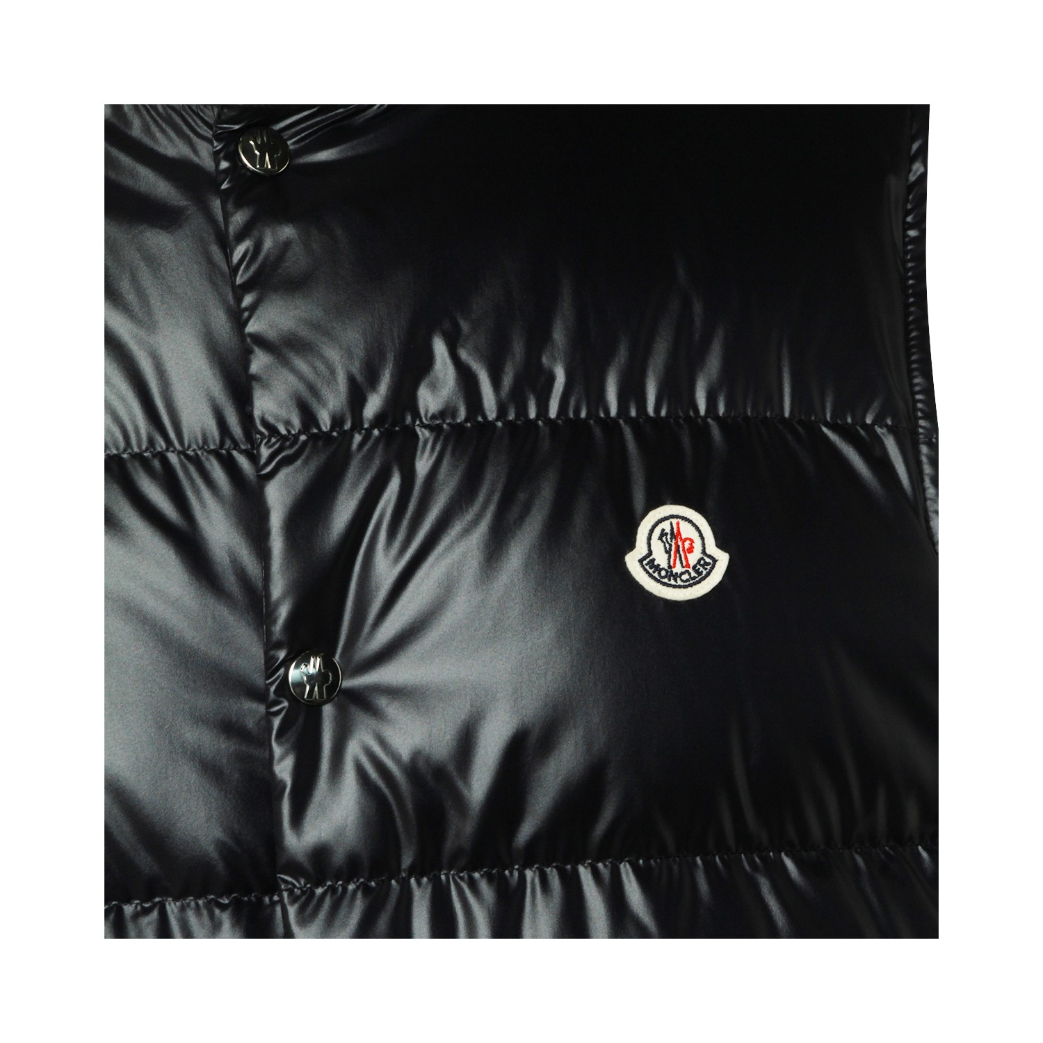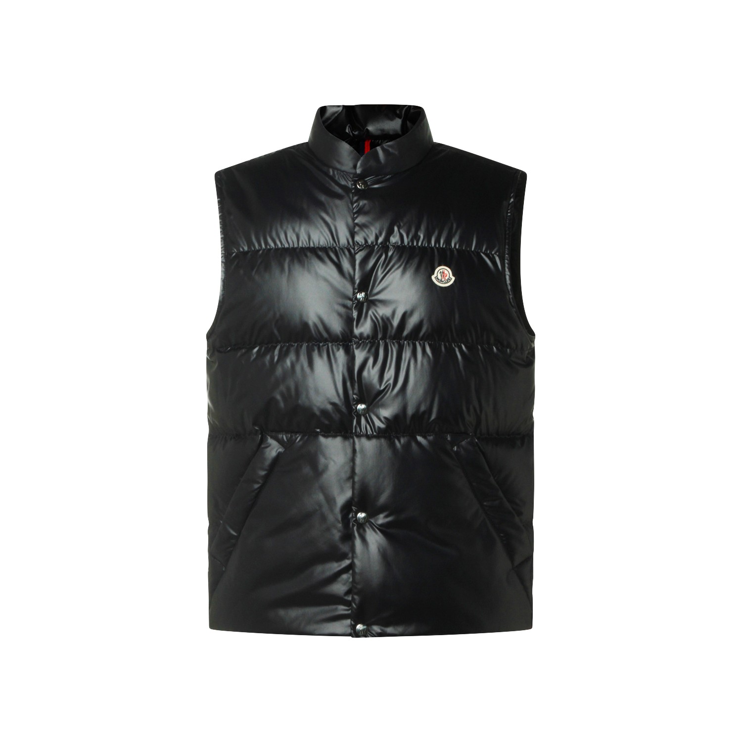 Black Restigo down jacket from Moncler featuring high collar, sleeveless, padded, buttons fastening, logo patch, pockets and regular vestibility.