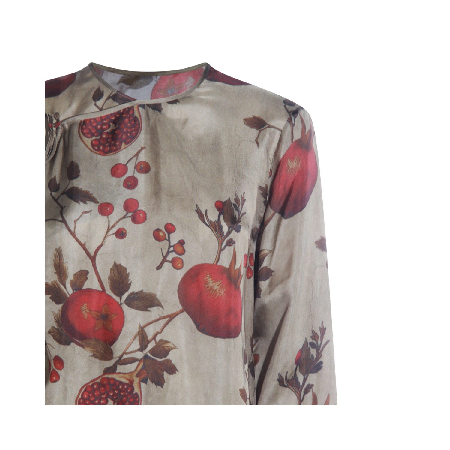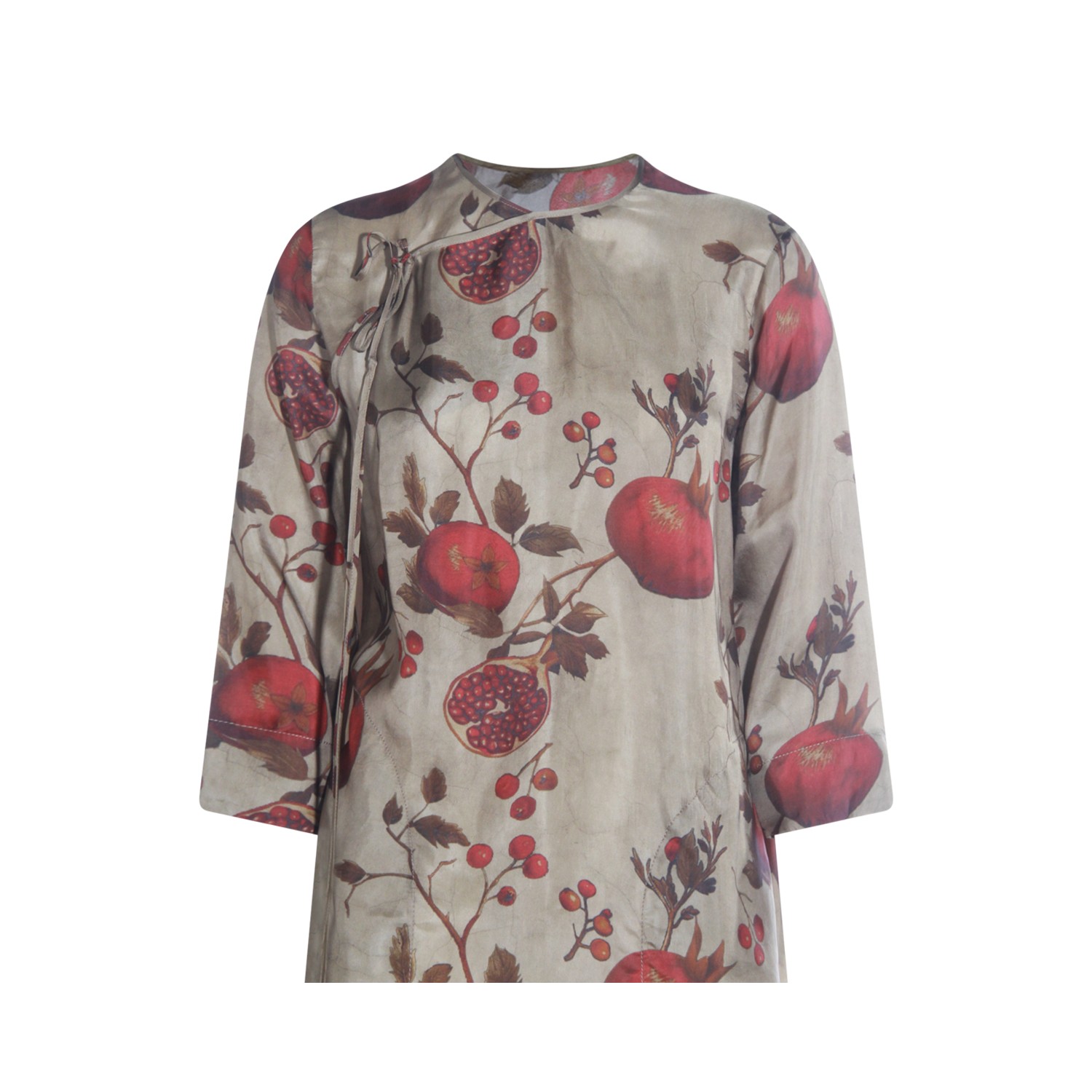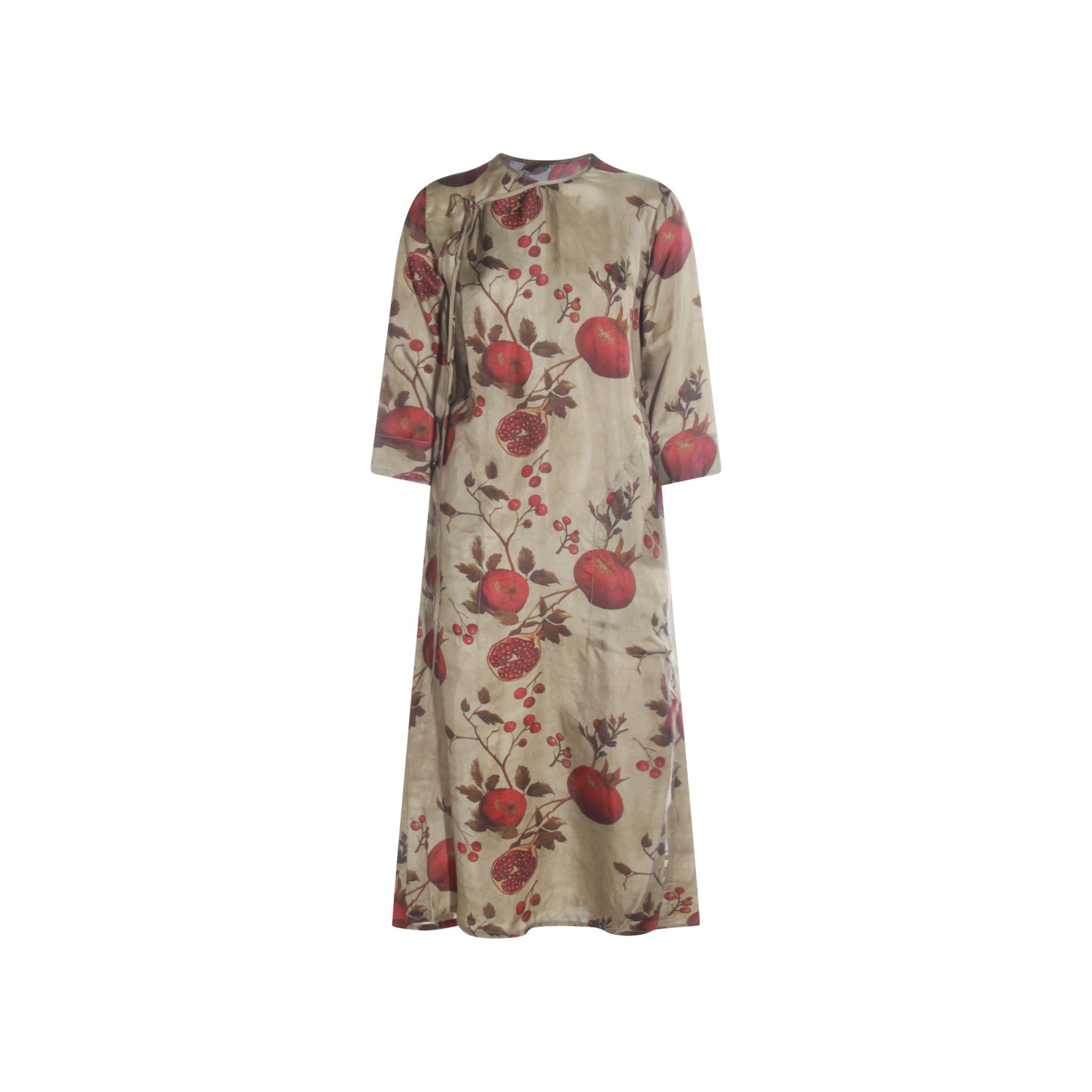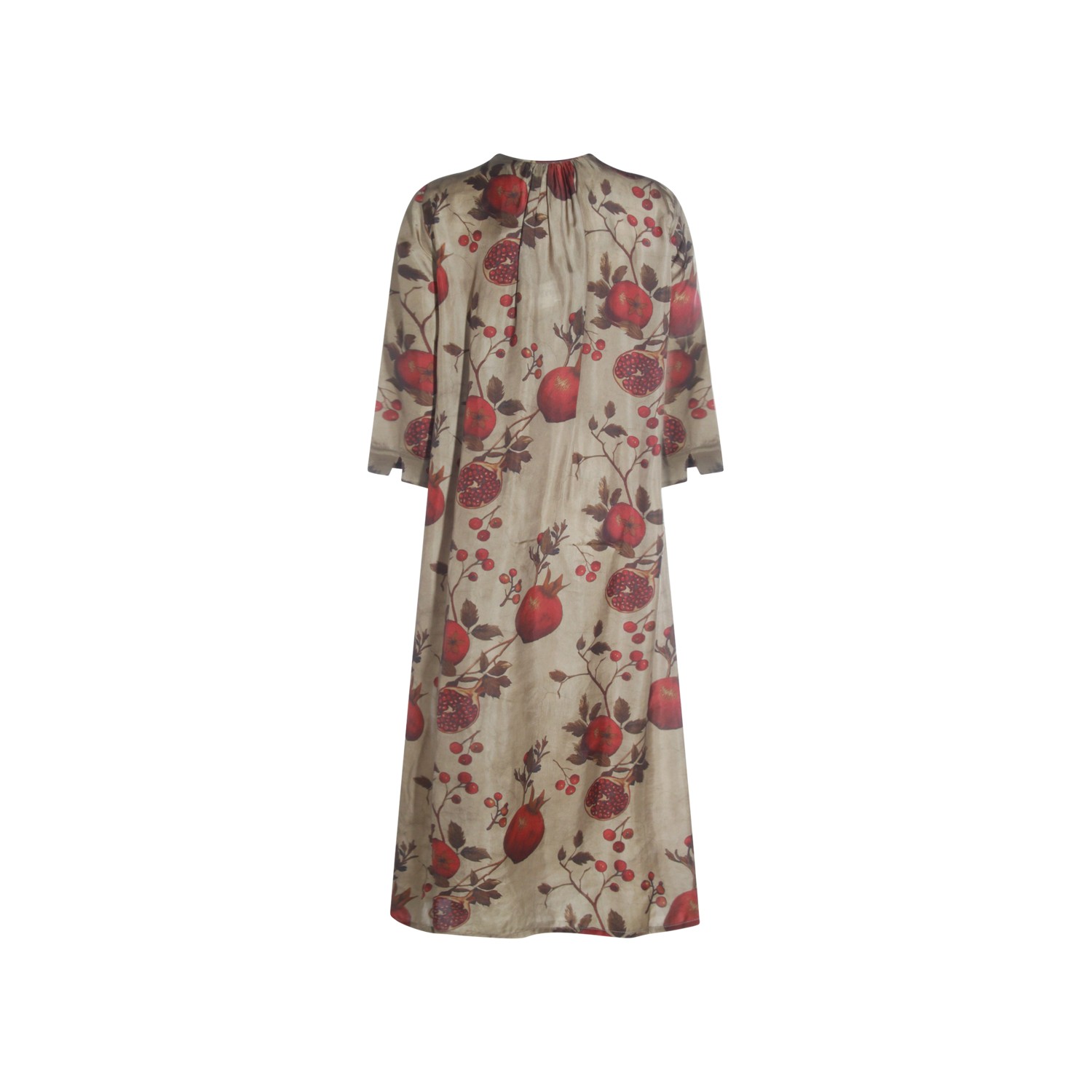 Red and green viscose Agina dress from Uma Wang featuring round collar, mid sleeves, all-over fruit pattern and soft vestibility.