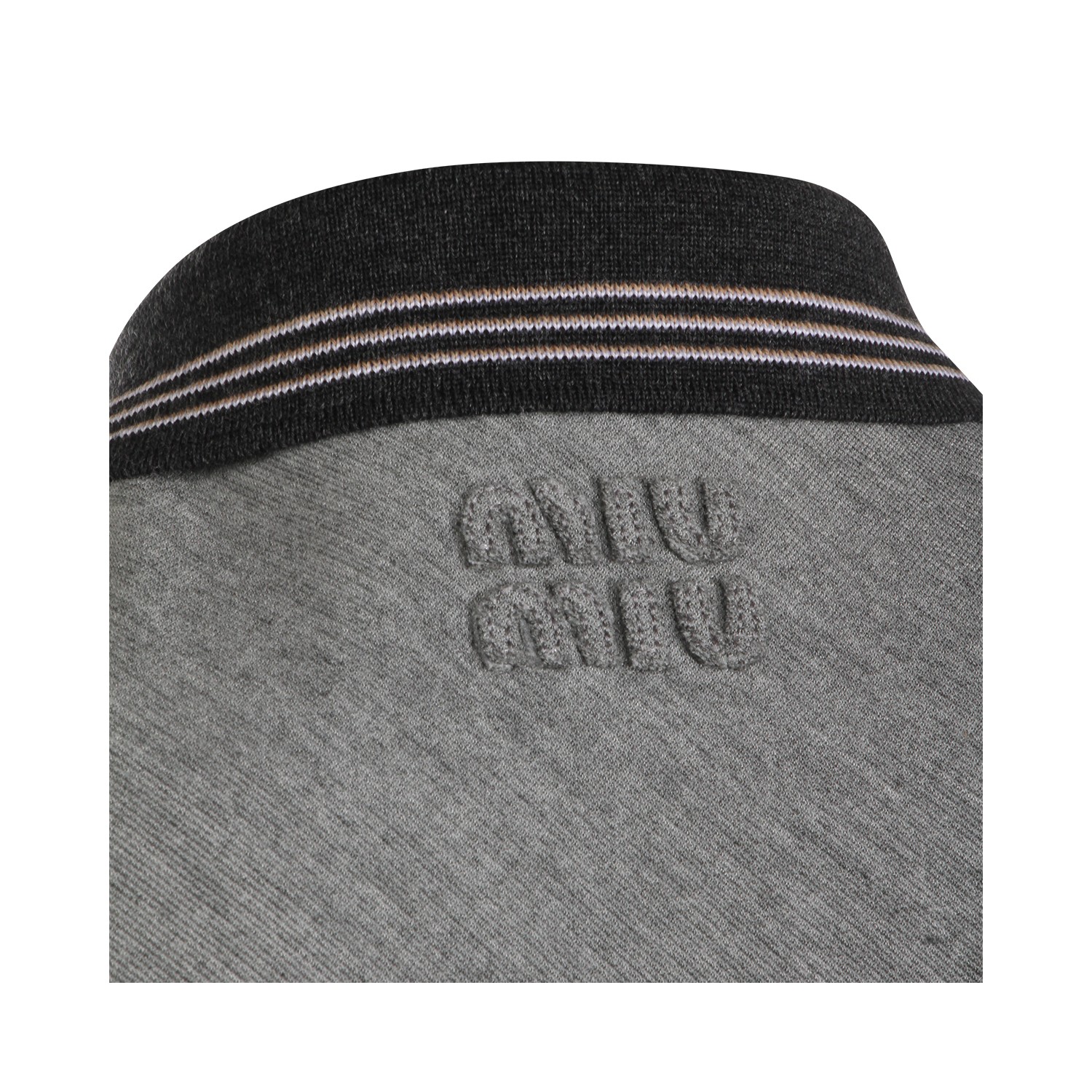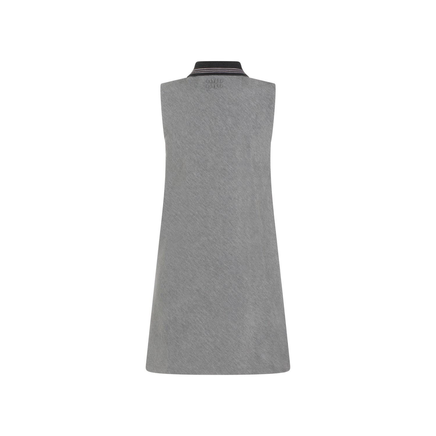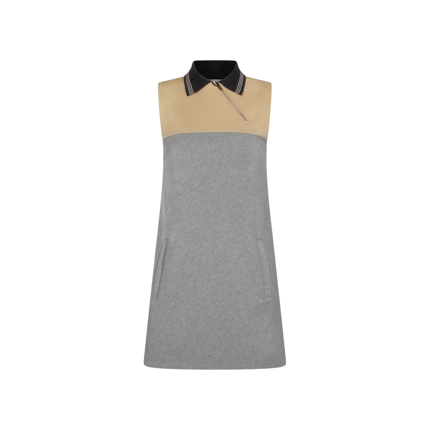 Grey and camel dress from Miu Miu featuring shirt neck, zip fastening, sleeveless, pockets and regular vestibility.