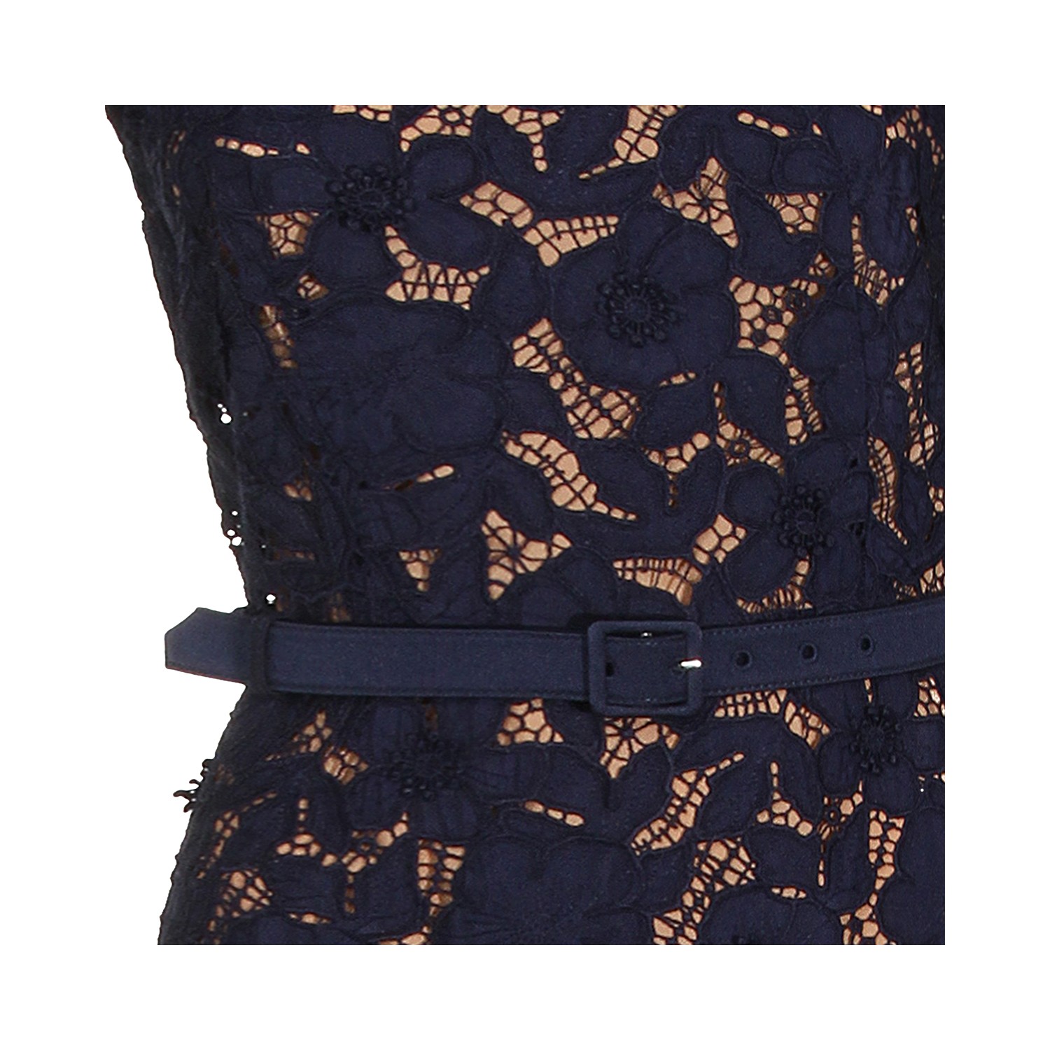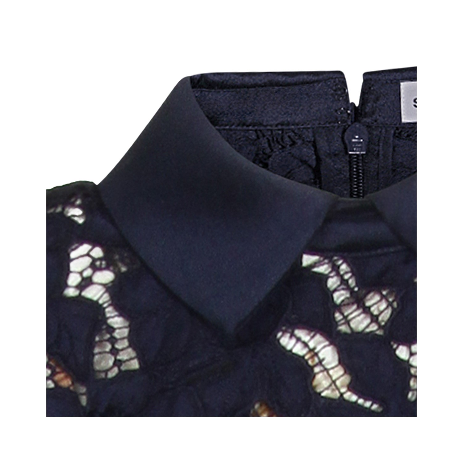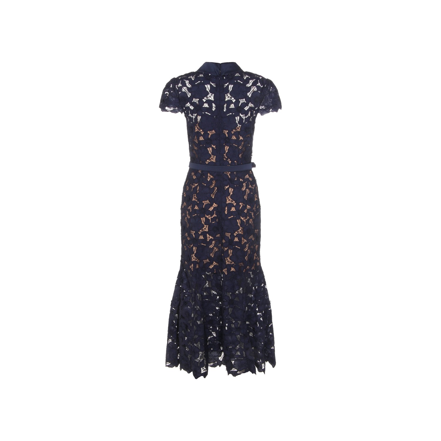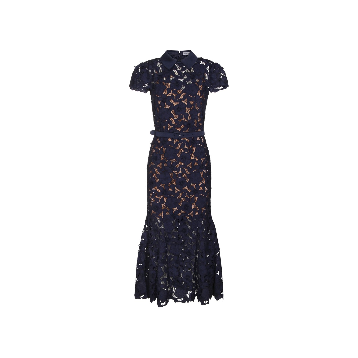 Navy dress from Self-Portrait featuring shirt collar, short sleeves, all-over hem, trasparence, belt and regular vestibility.