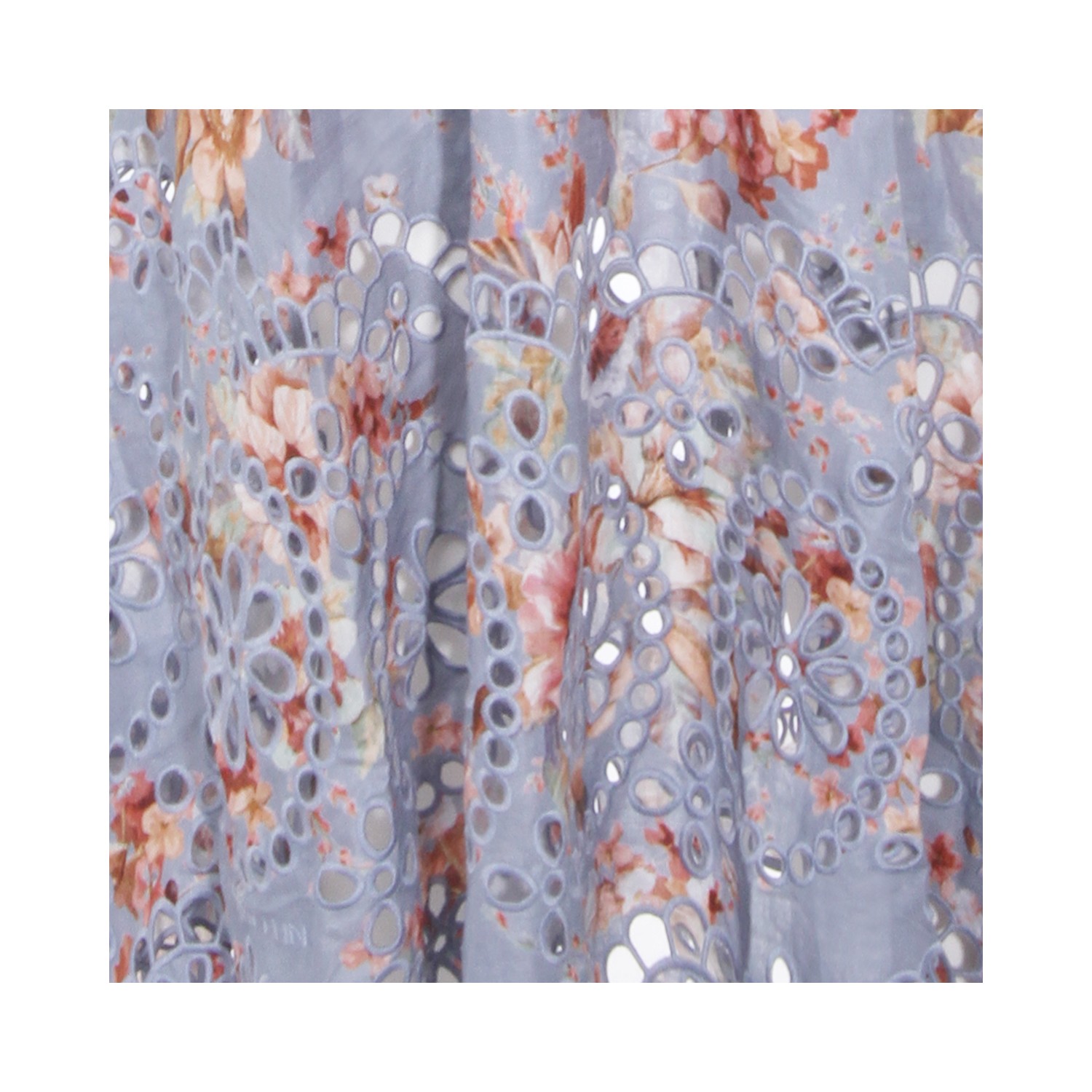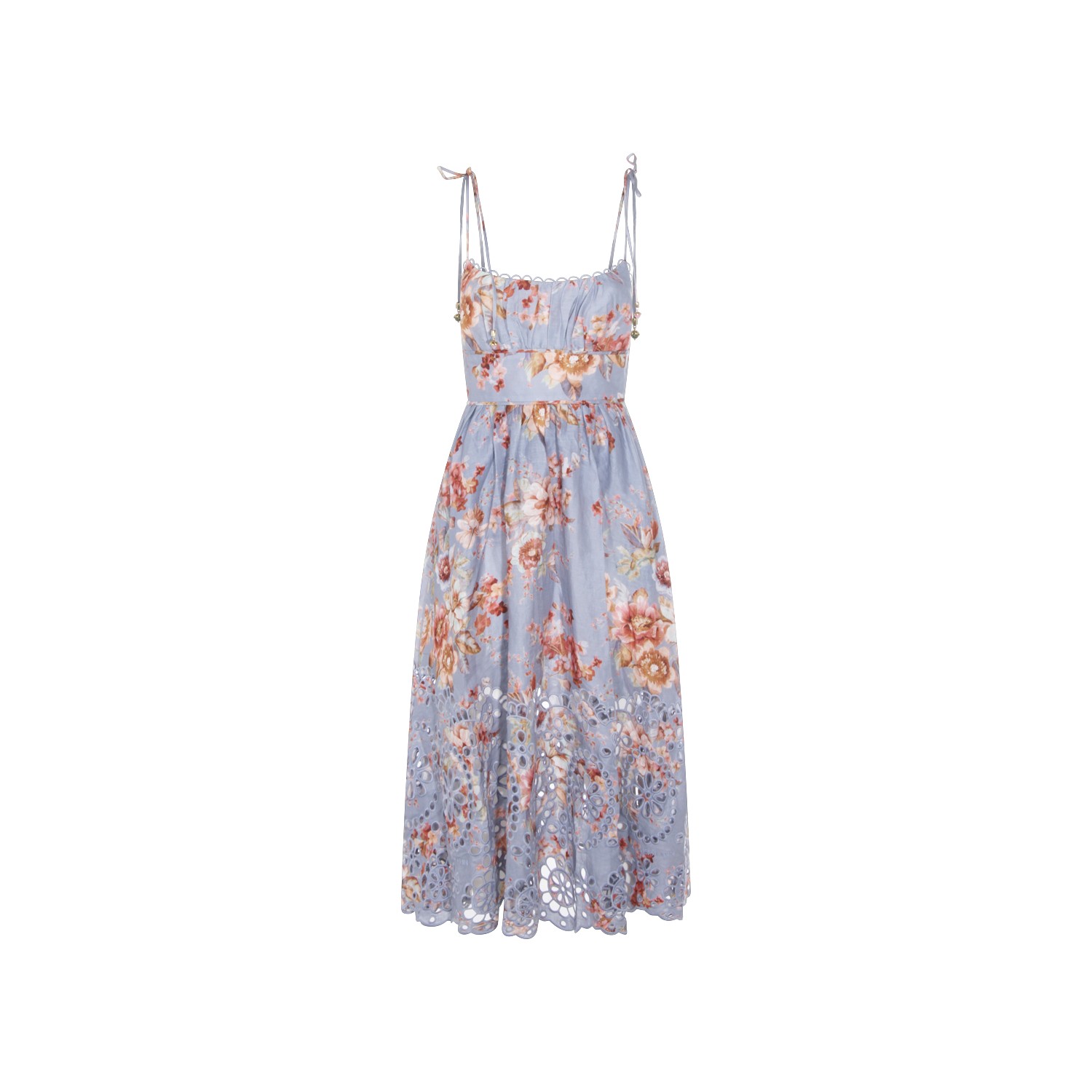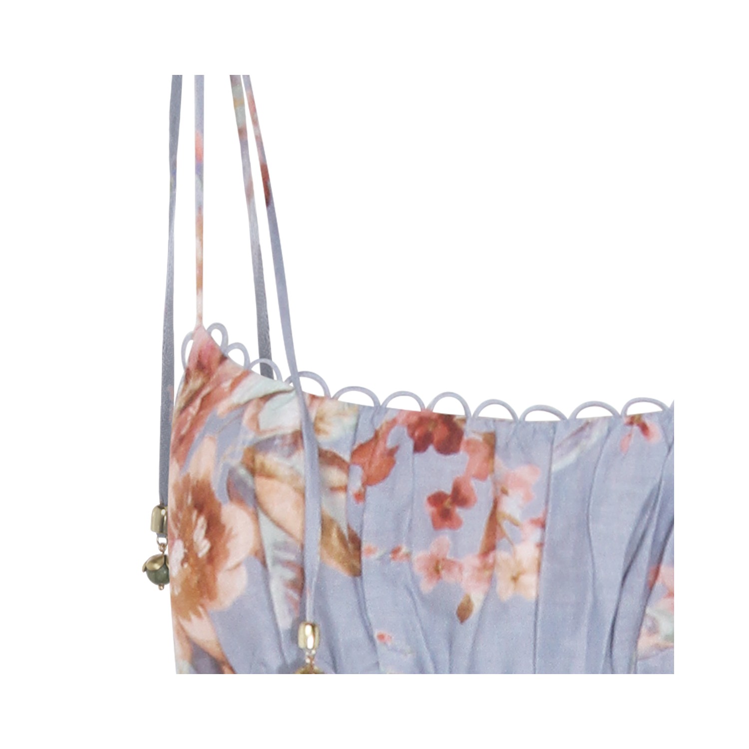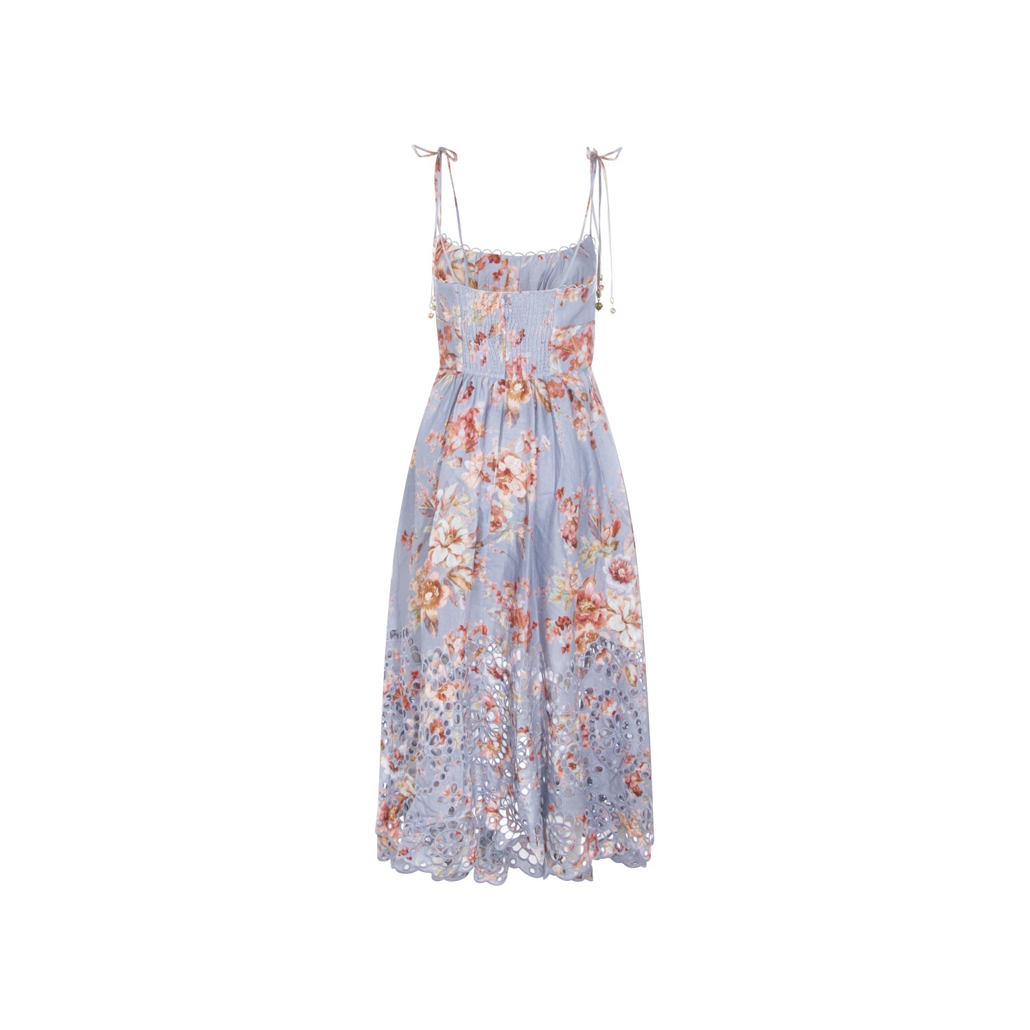 Light blue linen midi dress from Zimmermann featuring sleeveless, all over flowers print, midi length and flowers decorations.