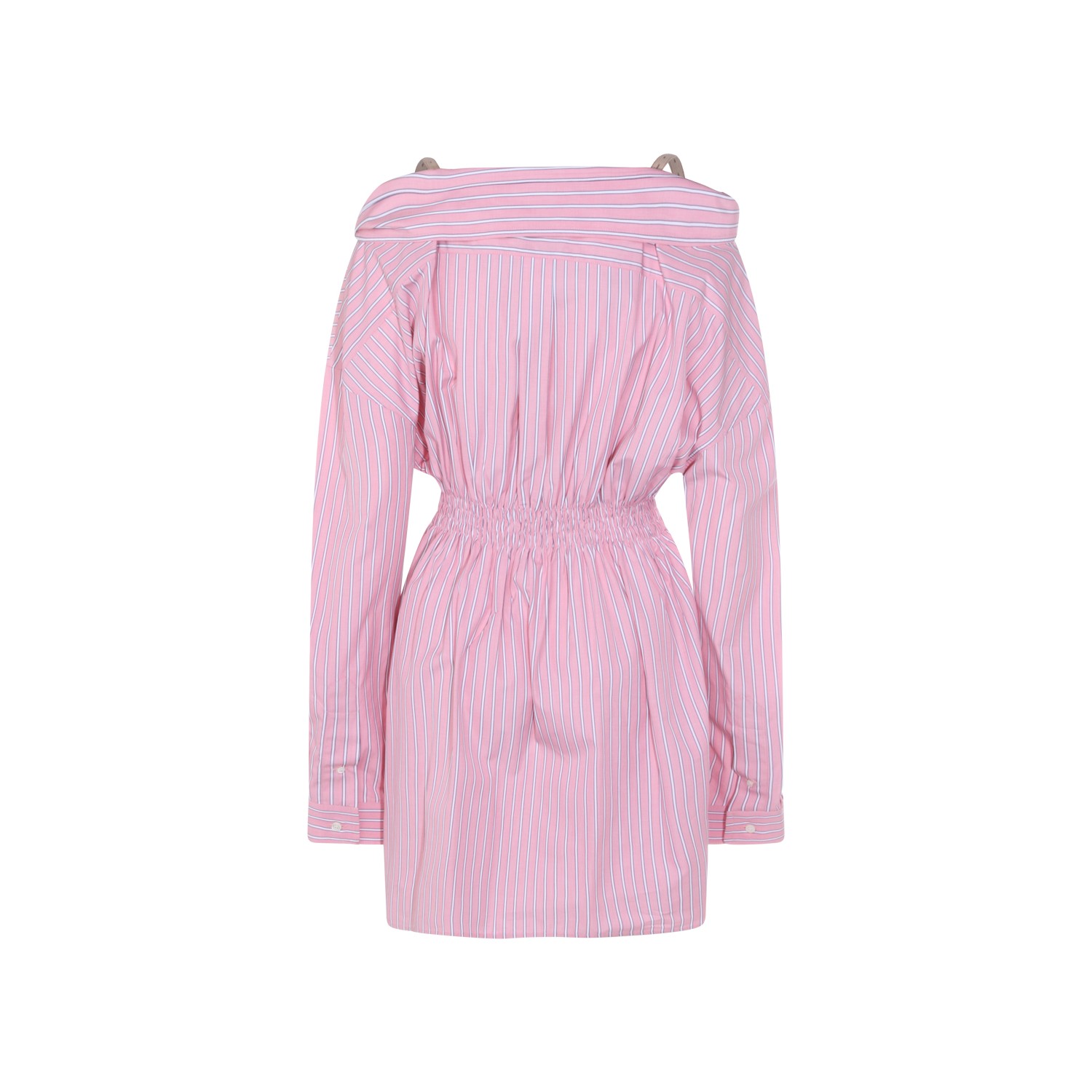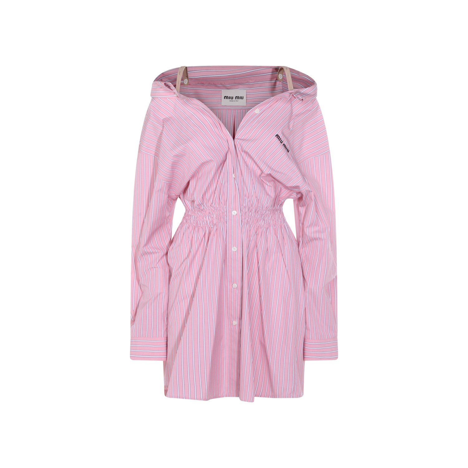 Pink cotton dress from Miu Miu featuring straps, long sleeves, V-neck, buttons fastening, elasticated waist, mid length, all over stripes and frontal logo.