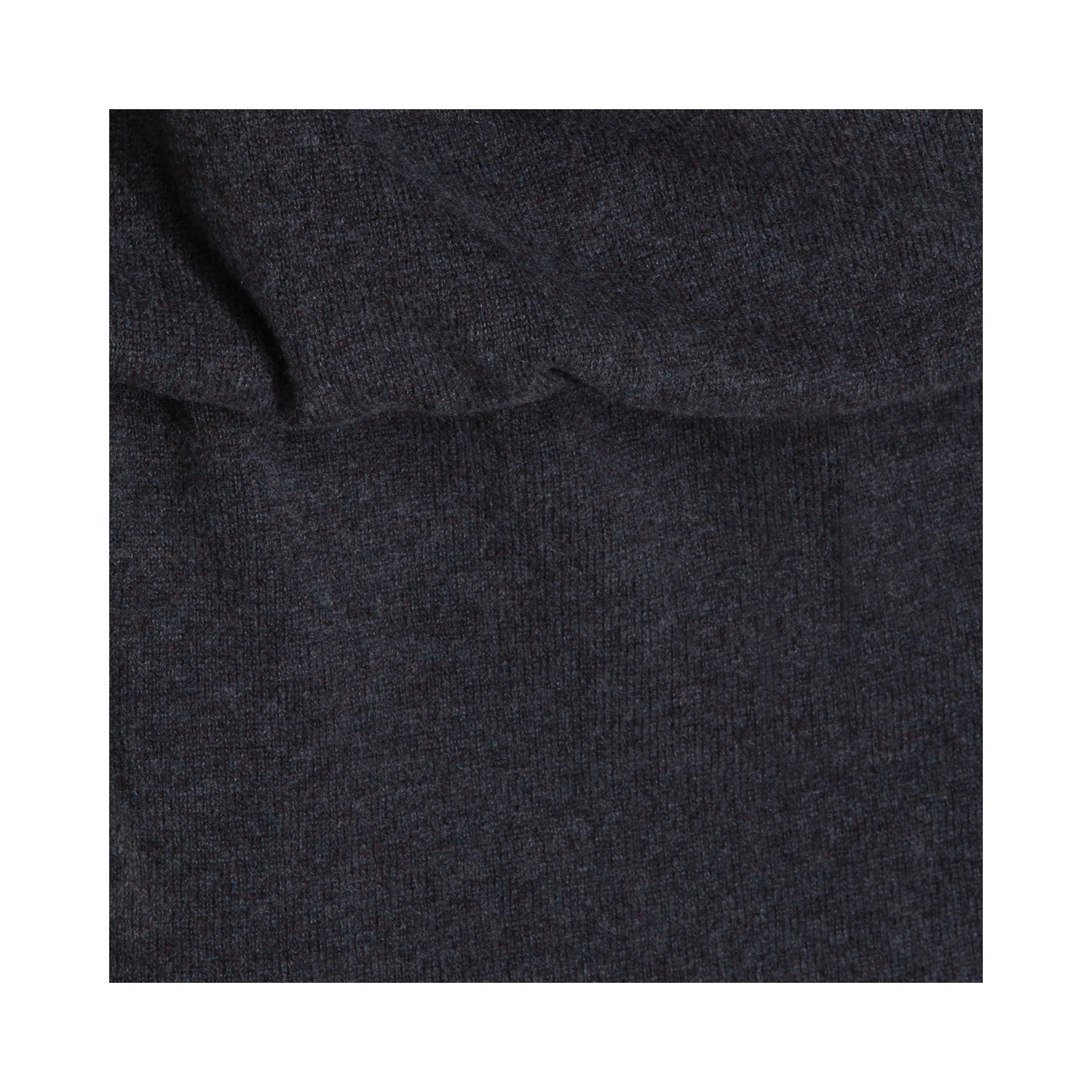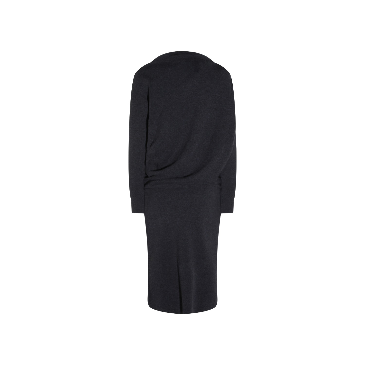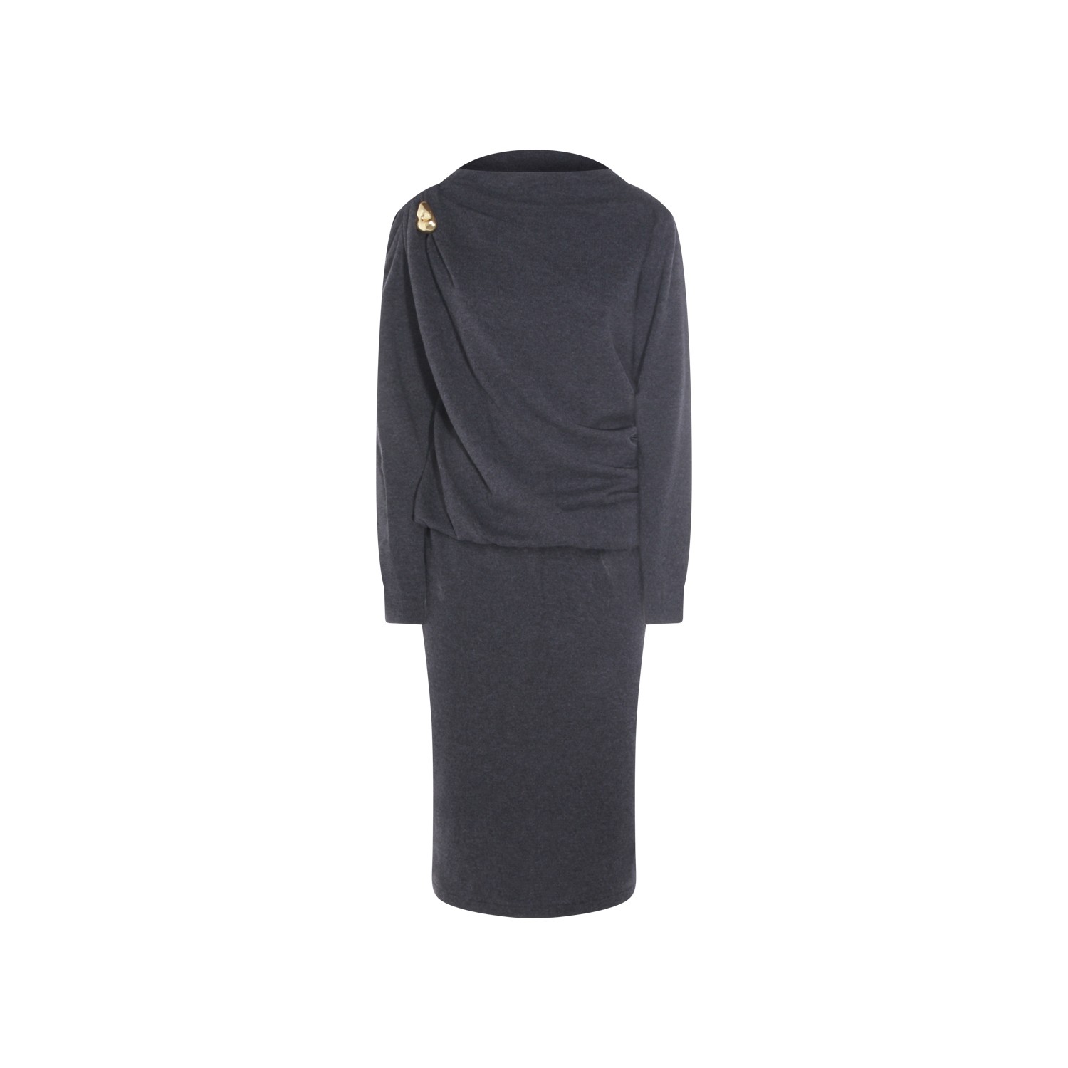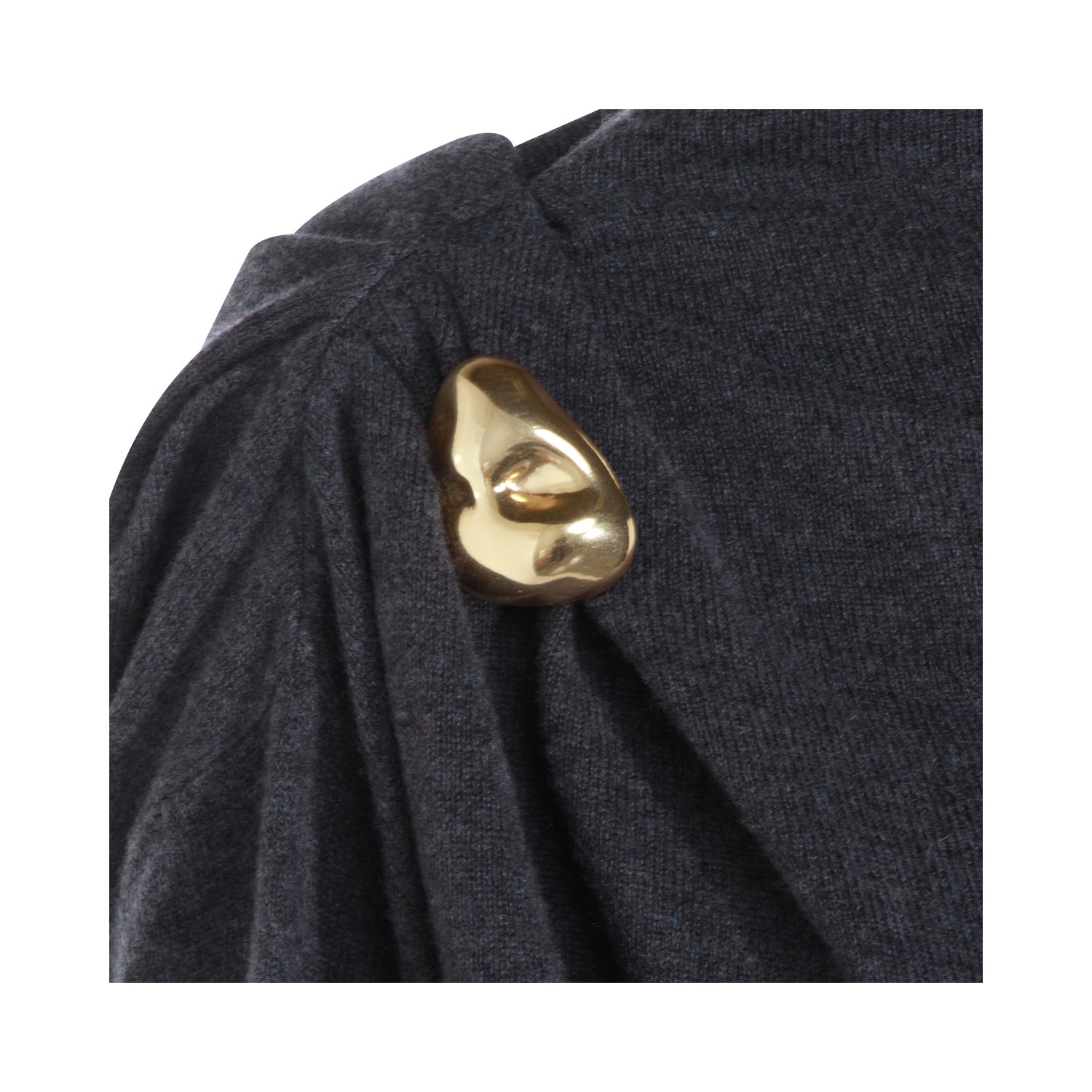 Blue wool dress from Fabiana Filippi featuring high collar, long sleeves, gold pin detail, draped details and soft vestibility.