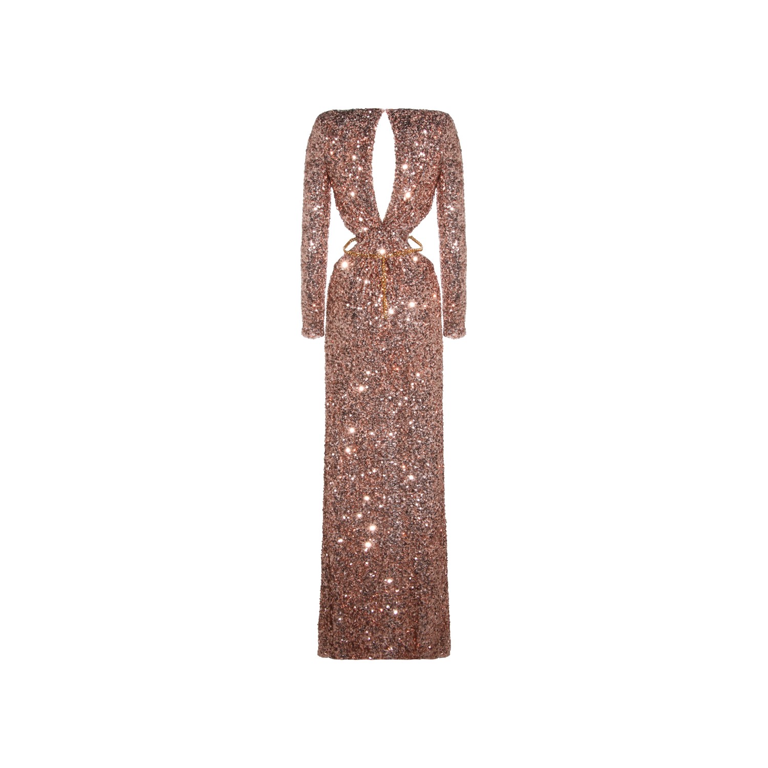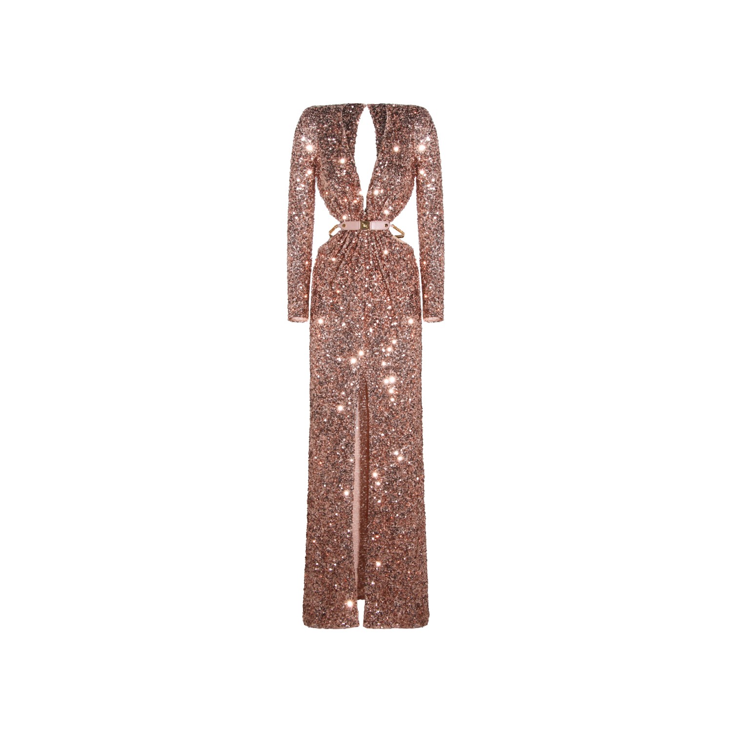 Nude dress from Elisabetta Franchi featuring wide v neckline, long sleeves, cut out detail, padded shoulders, belt waist, front slit and long lenght.